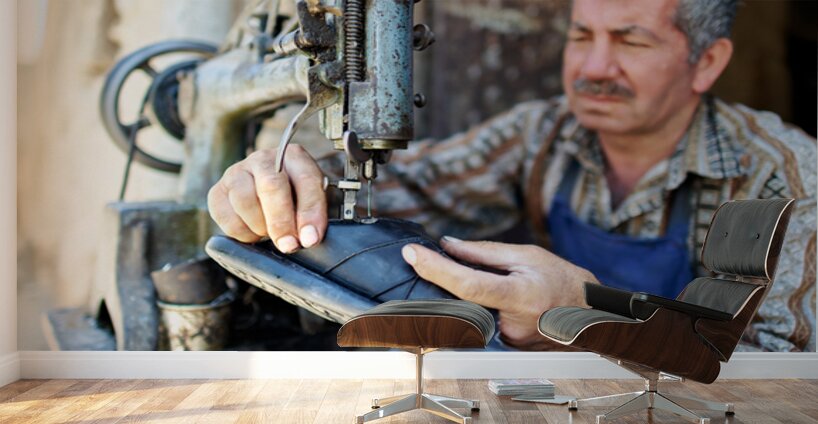 A man repairs a shoe using a sewing machine in the busy souq of Aleppo Syria. The scene shows the craft of shoemaking.