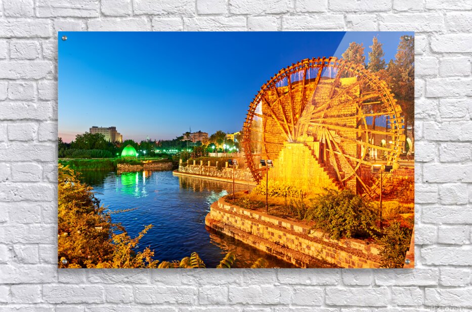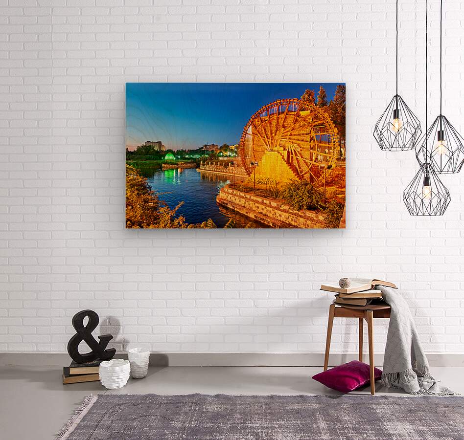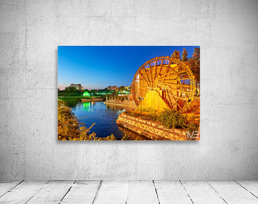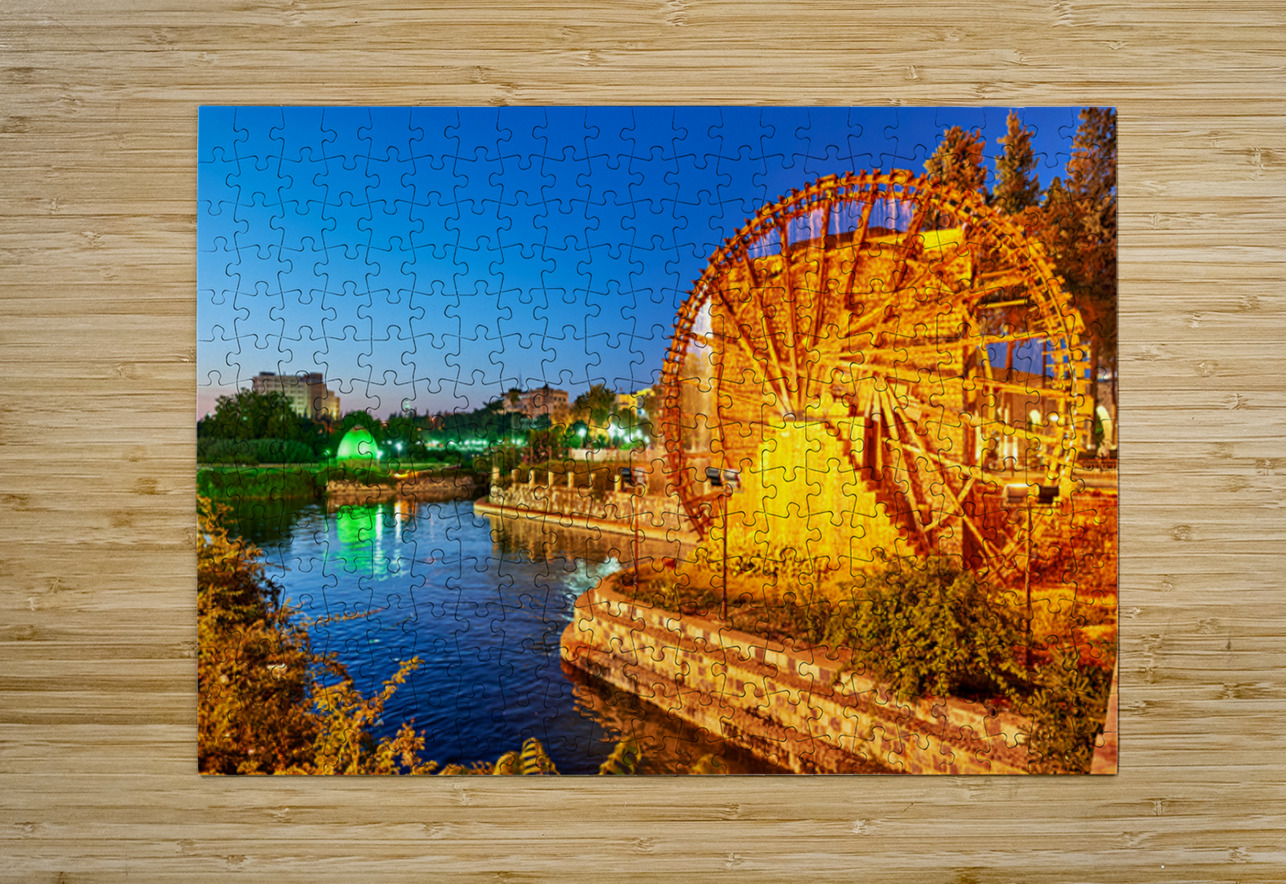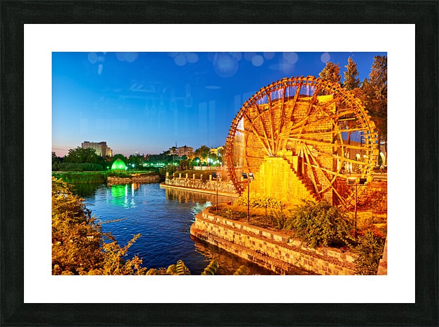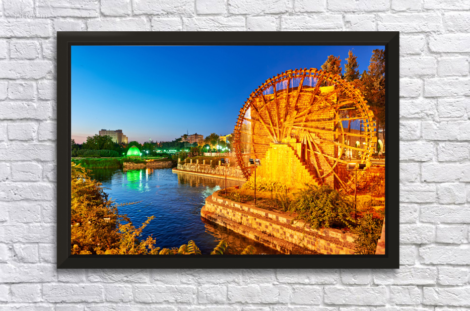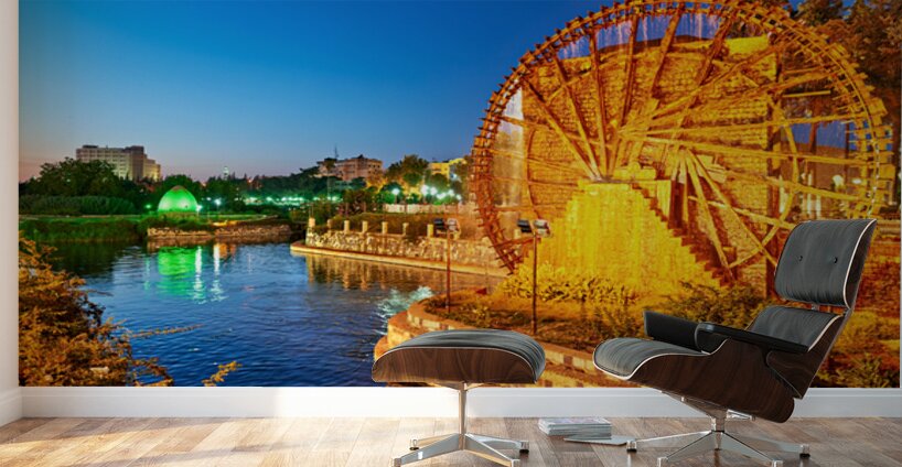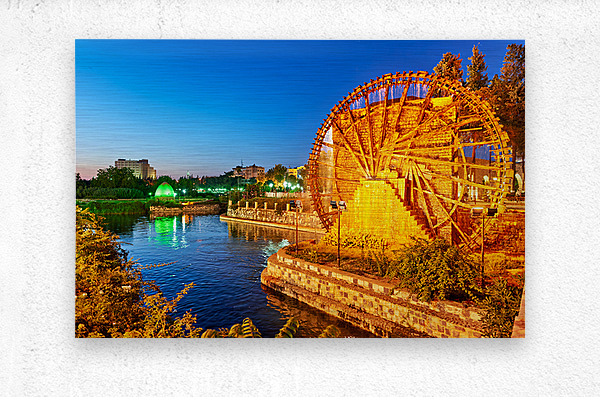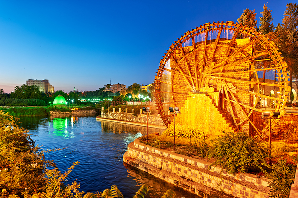 Norias turn slowly in Hama Syria as evening falls. Water flows from the wheels into the river creating a historical scene by the water.