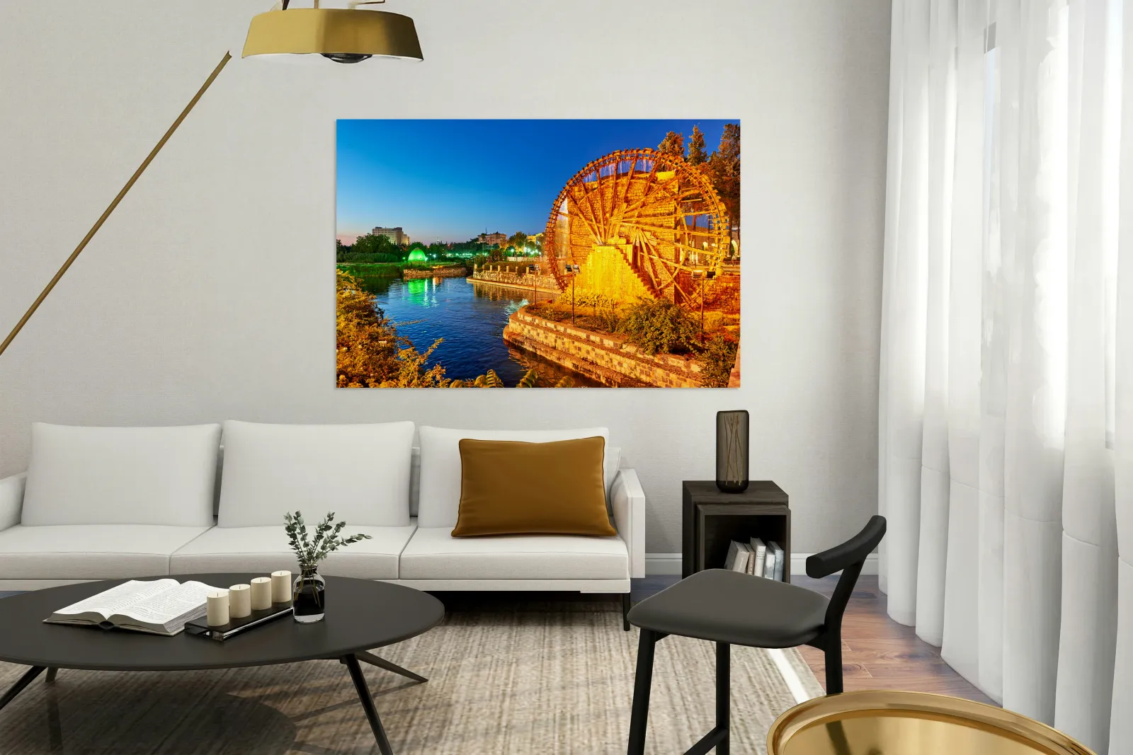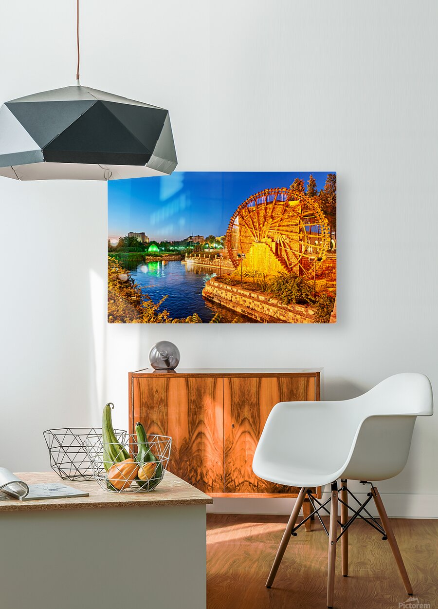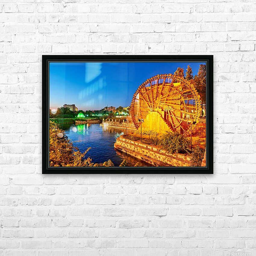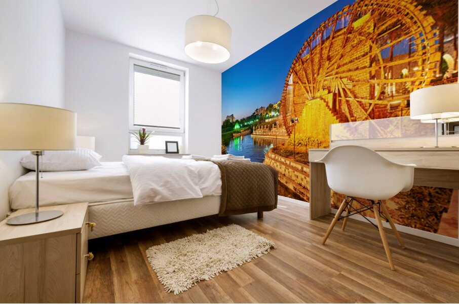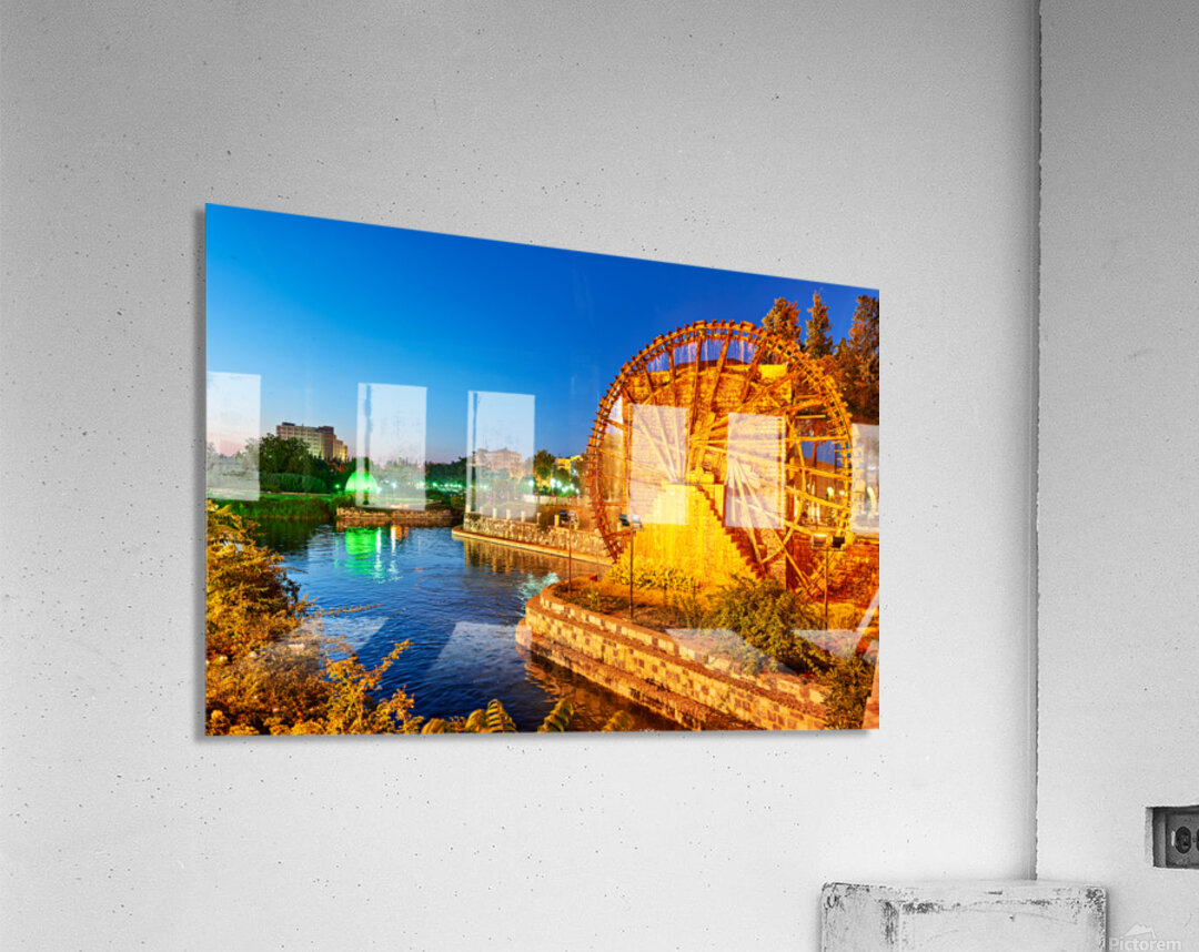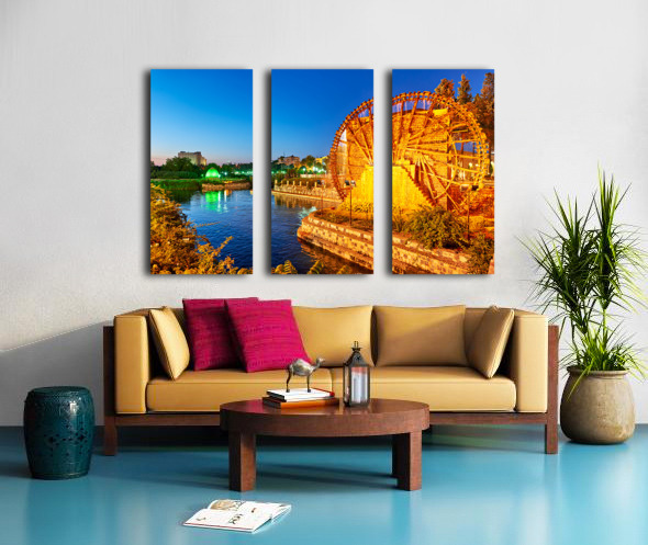 Norias turn slowly in Hama Syria as evening falls. Water flows from the wheels into the river creating a historical scene by the water.