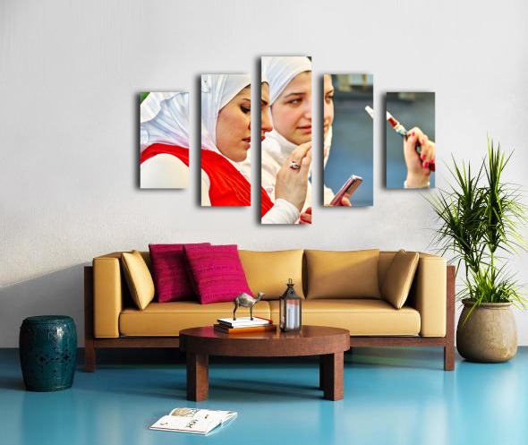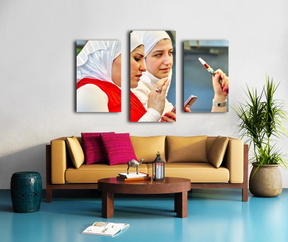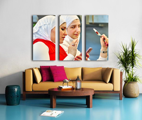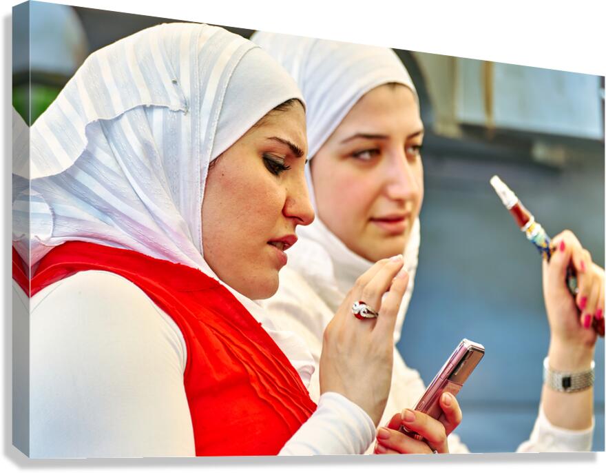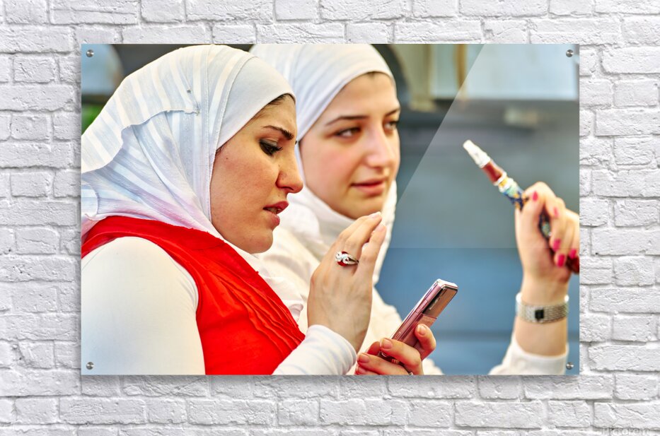 Get this artwork "Young women enjoy hookah and talk on mobile phone in Aleppo Syri" in a framed print.