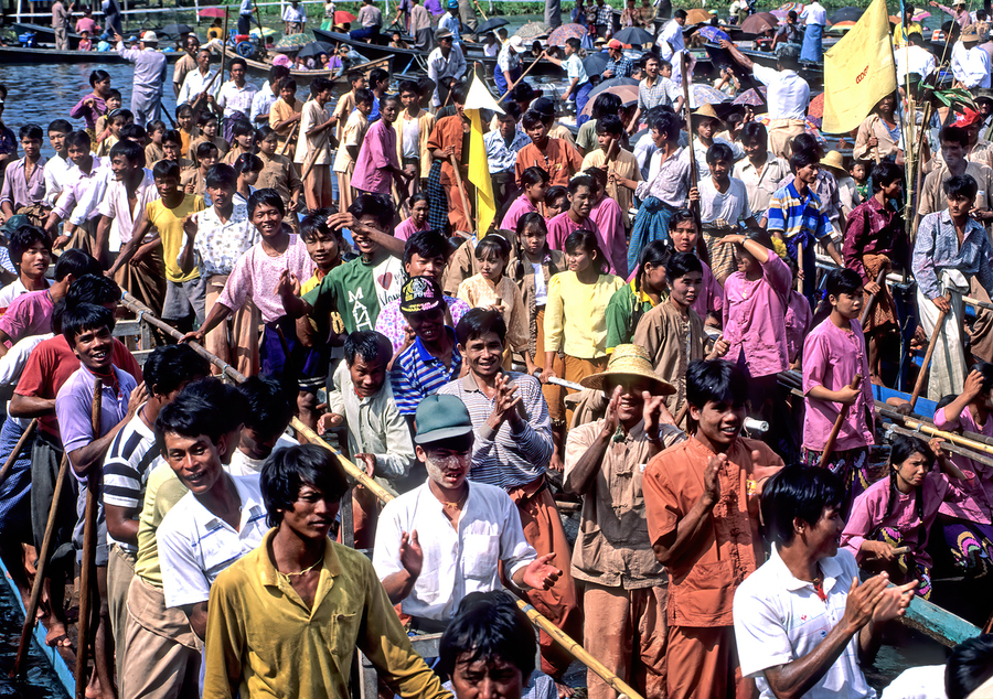 PEOPLE GATHER ON BOATS DURING THE INLE LAKE FESTIVAL IN MYANMAR