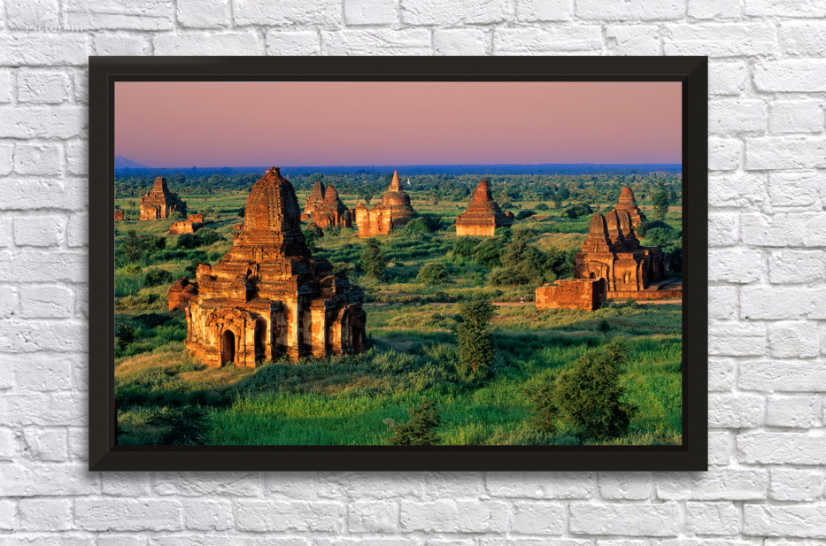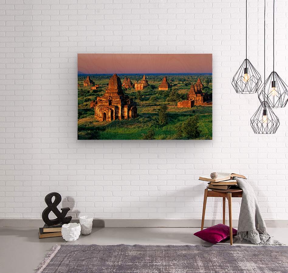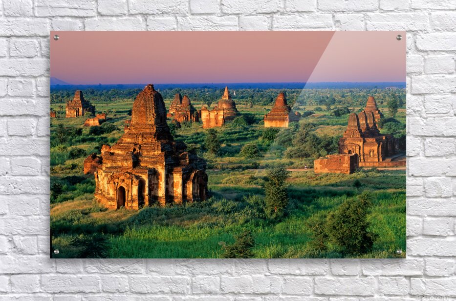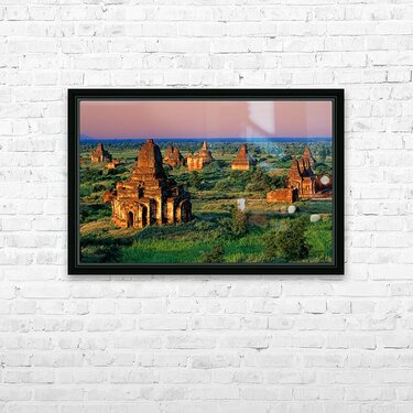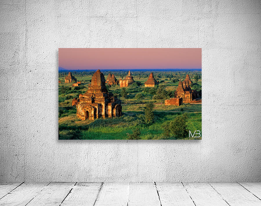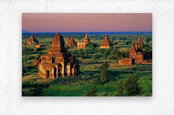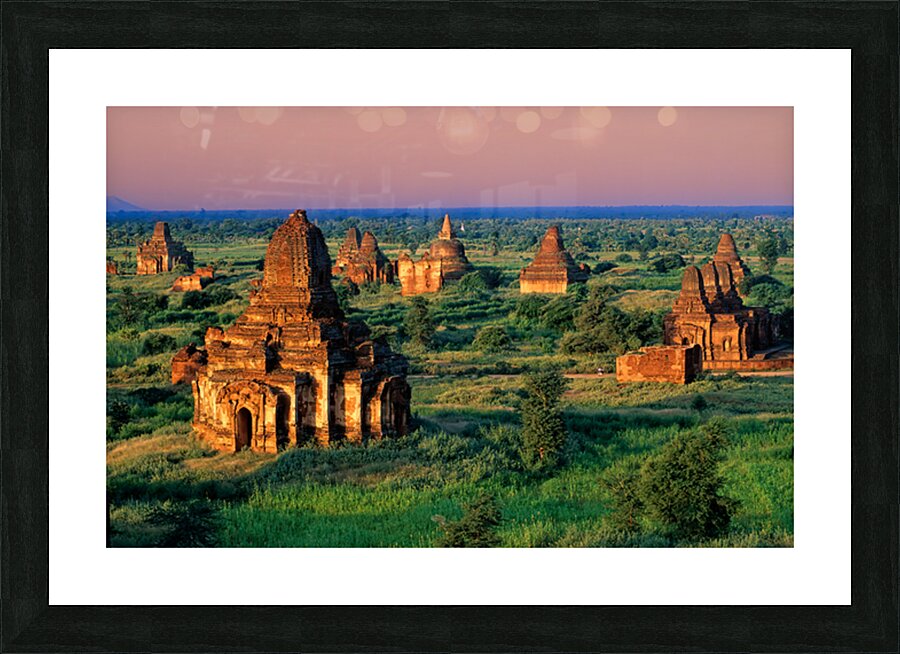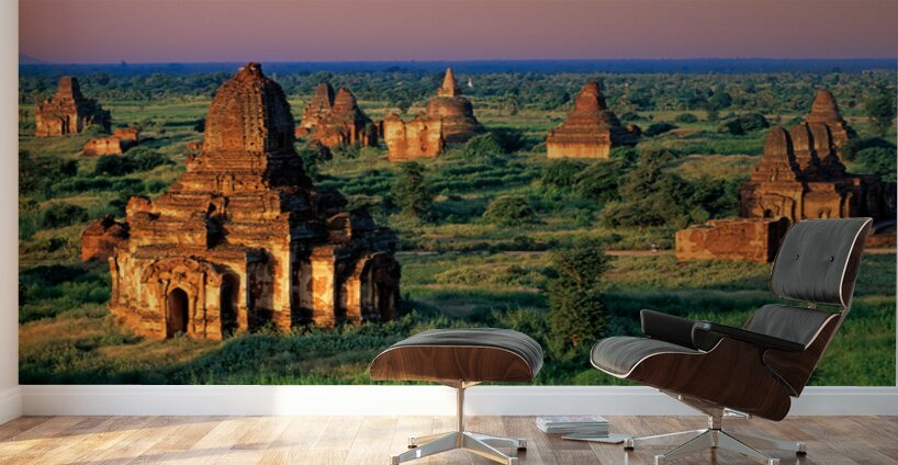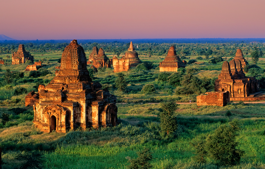 Temples stand in Bagan as the sun sets behind. Green fields surround the old structures creating a landscape rich in history and culture.