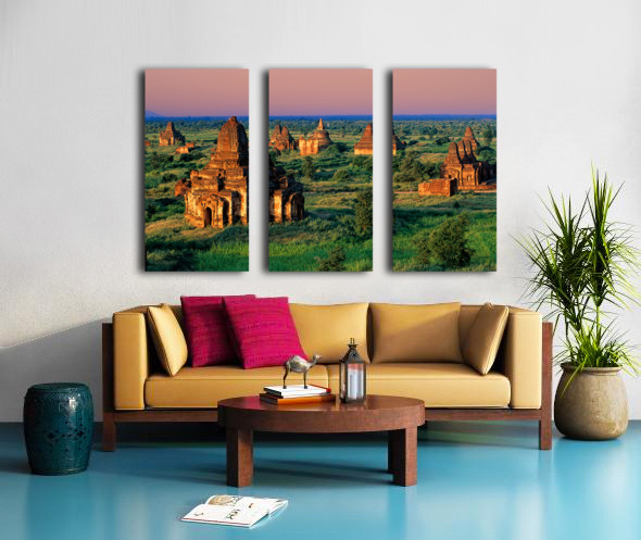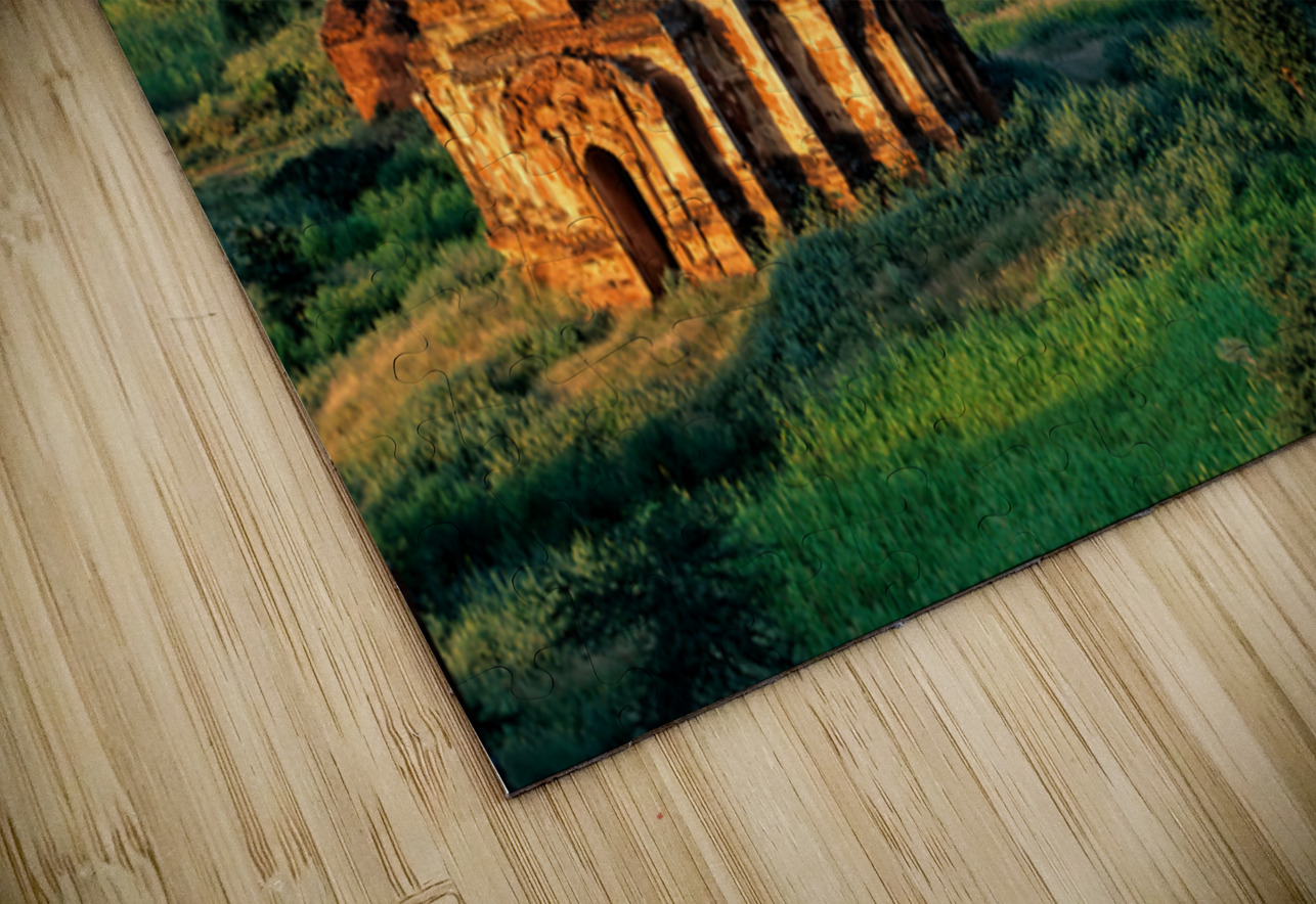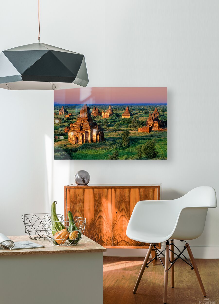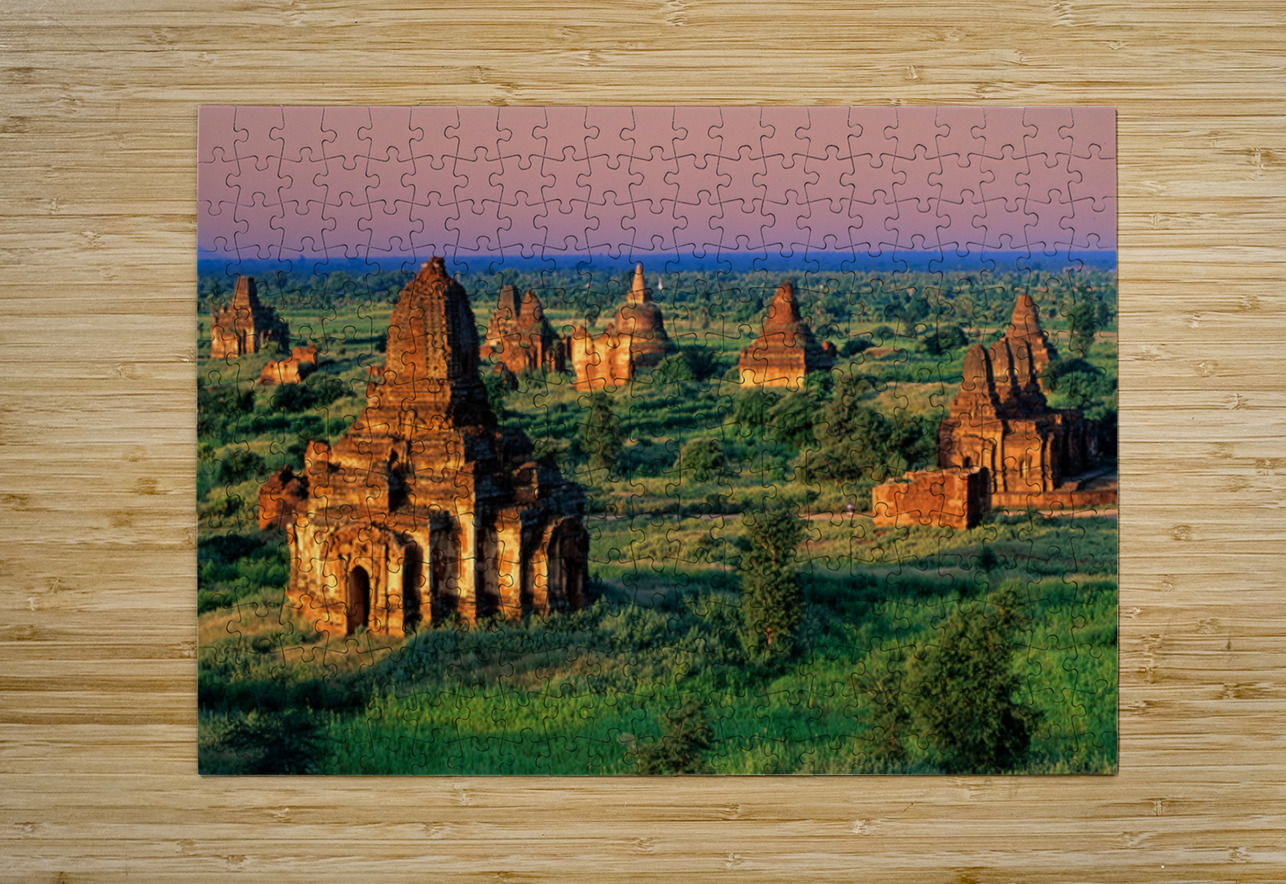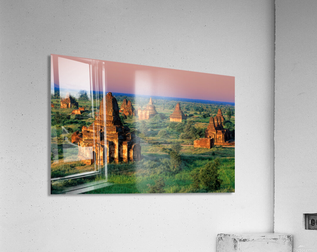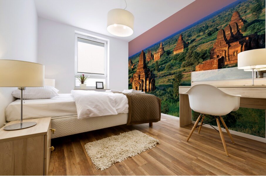 Temples stand in Bagan as the sun sets behind. Green fields surround the old structures creating a landscape rich in history and culture.