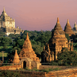 TEMPLES IN BAGAN DURING SUNSET WITH ANCIENT ARCHITECTURE VISIBLE