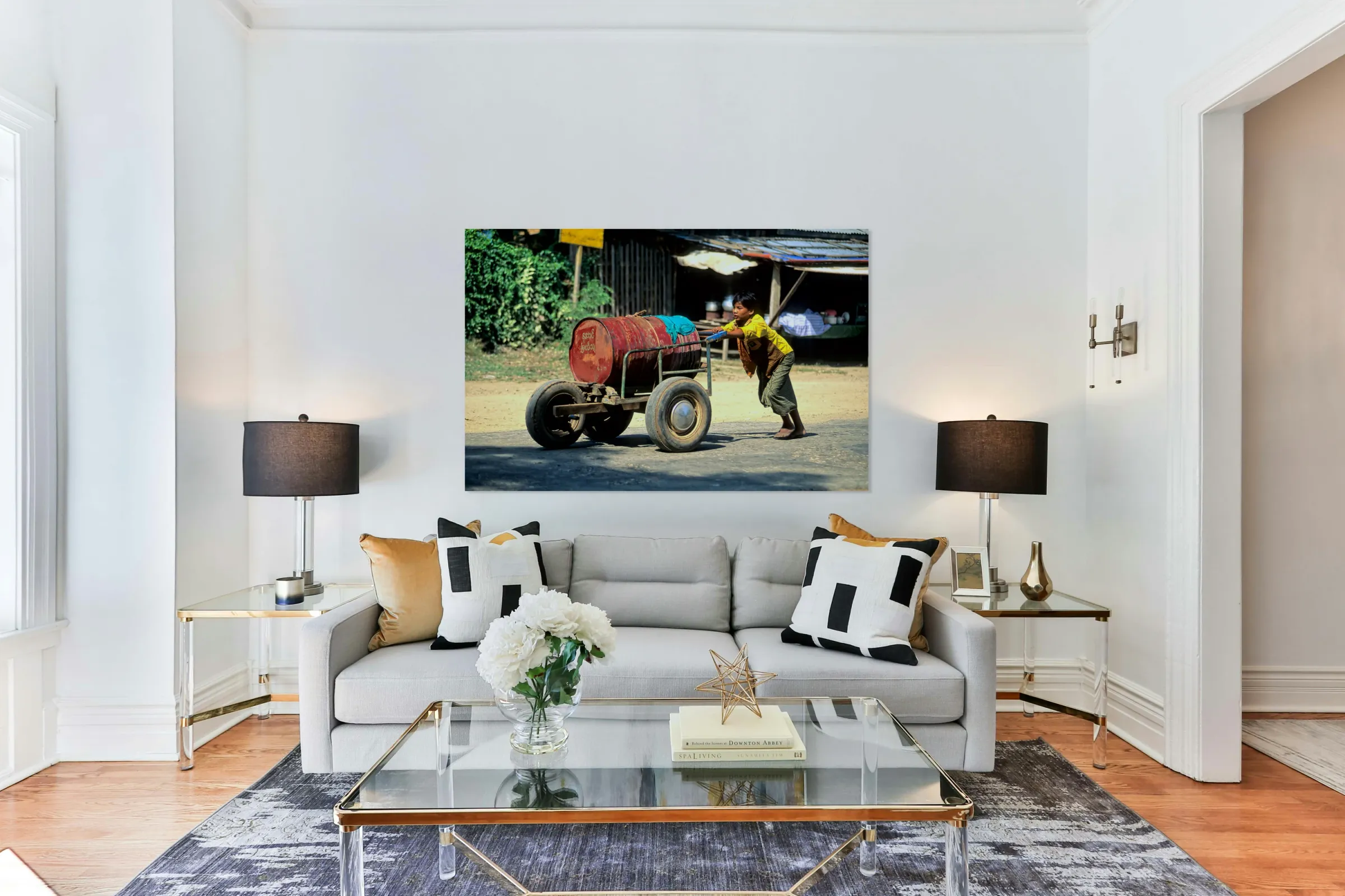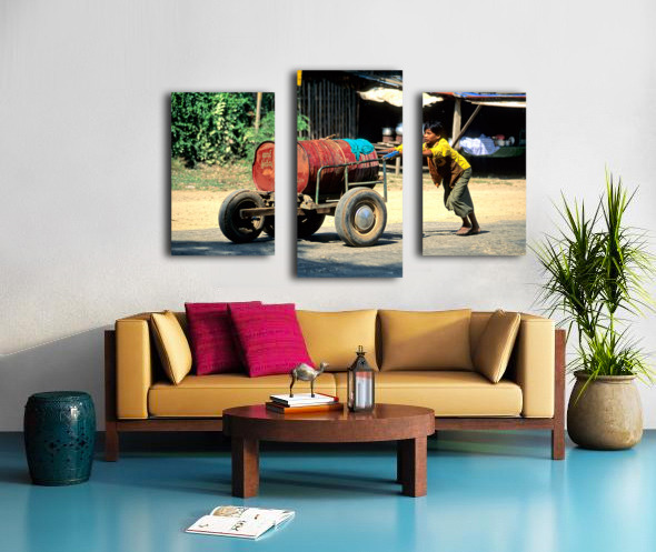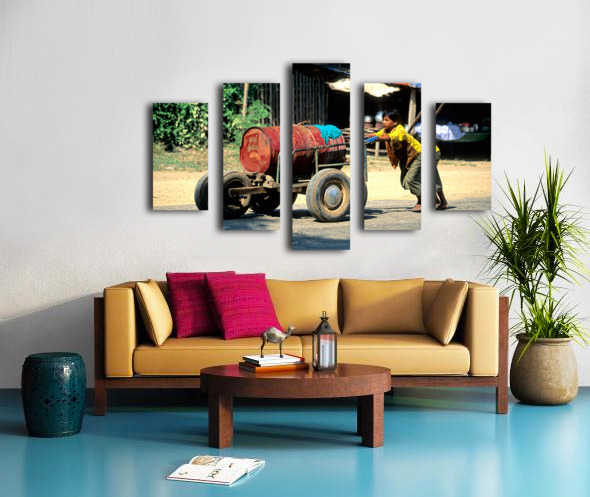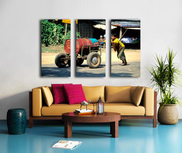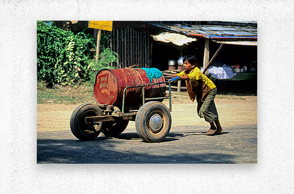 ABOUT THIS ARTWORK: BOY PUSHES A CART DOWN THE STREET IN MYANMAR DURING THE DAY