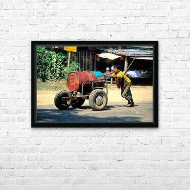 Get this artwork "Boy pushes a cart down the street in Myanmar during the day" in a framed print.