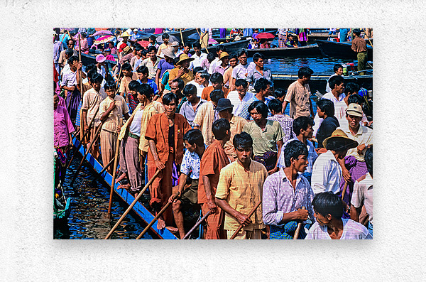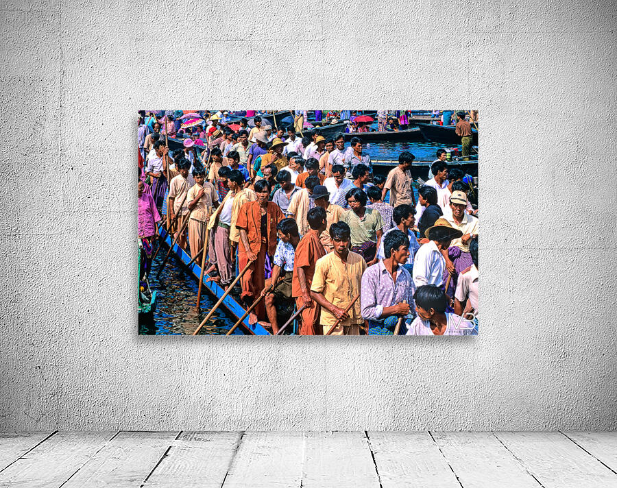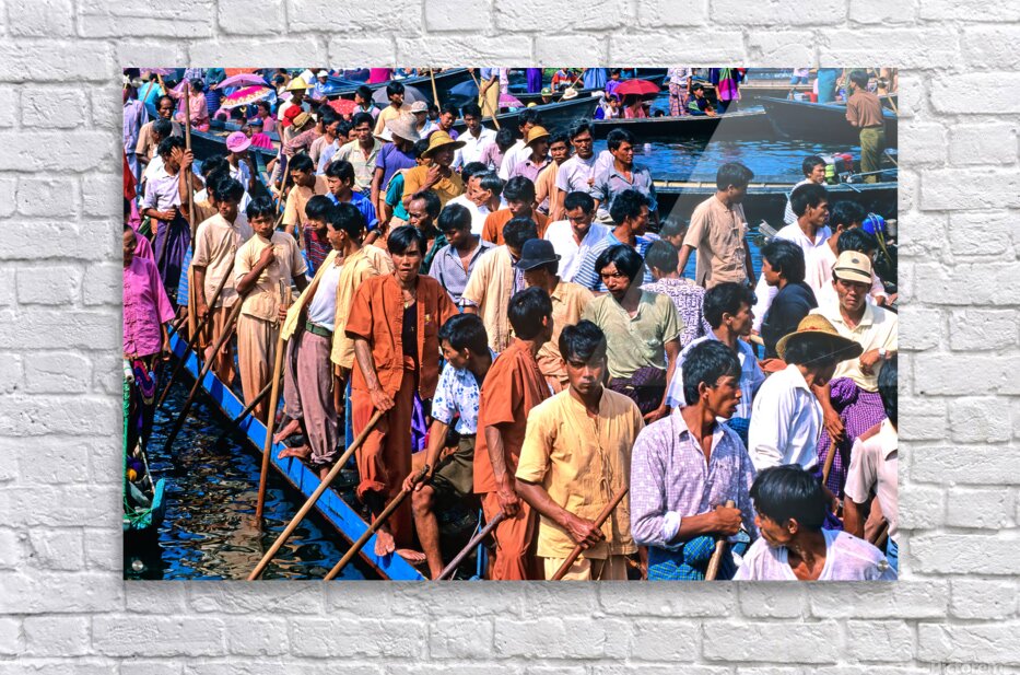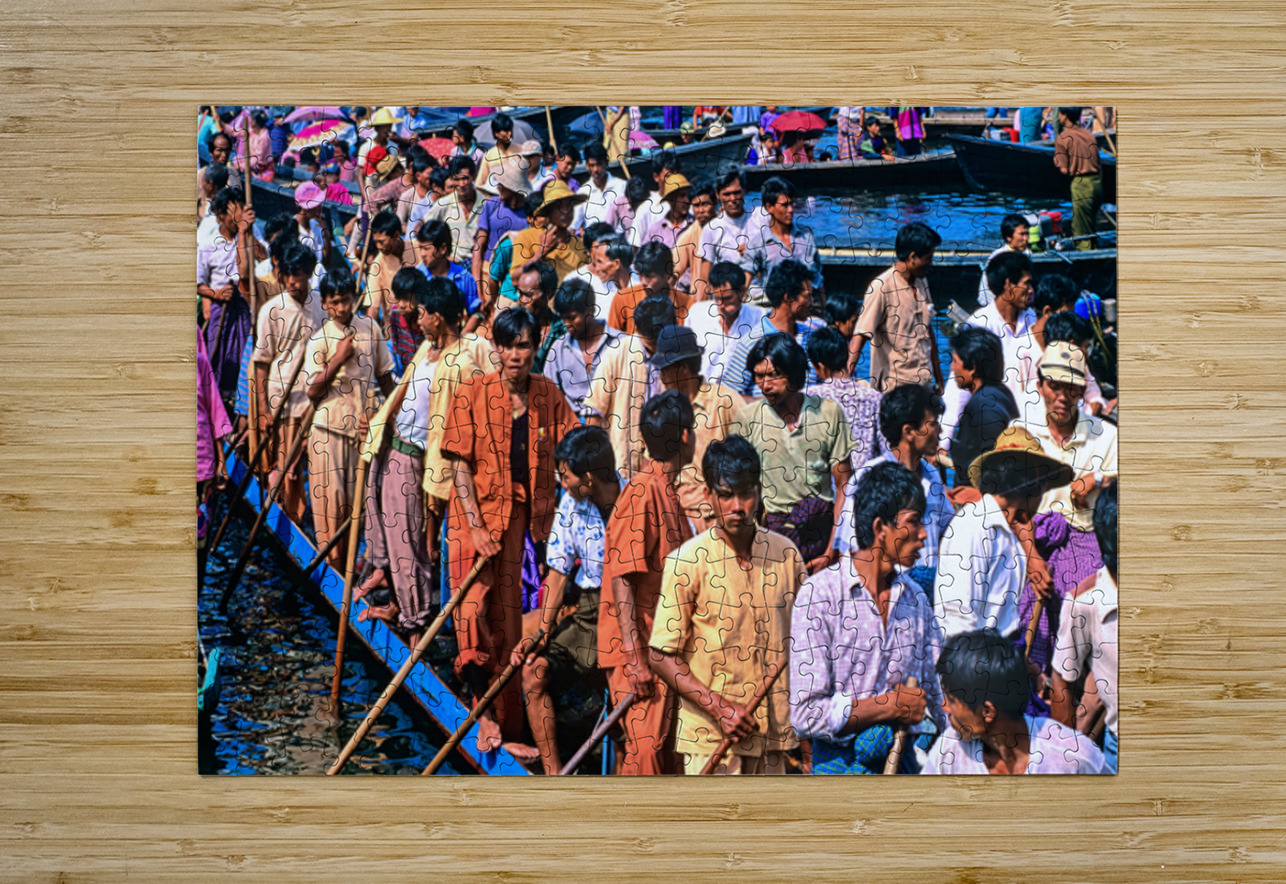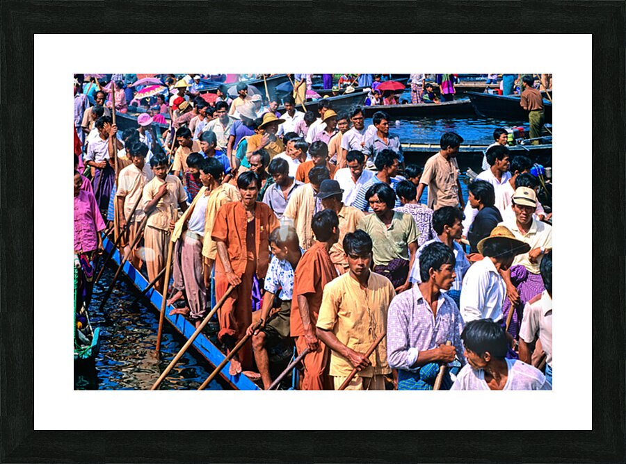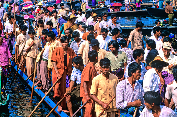 People gather on wooden boats at Inle Lake Festival. Colorful umbrellas and traditional clothing add to the lively scene in Myanmar.