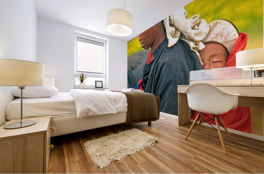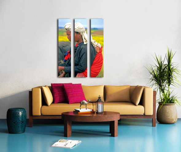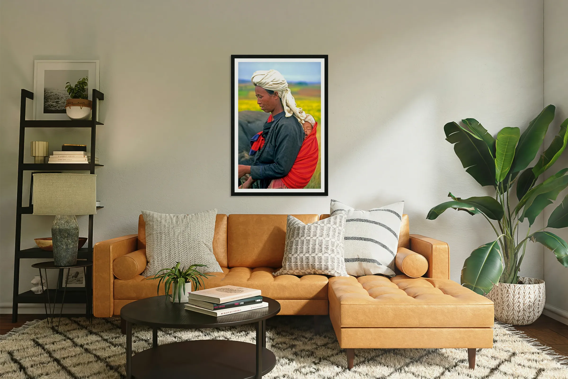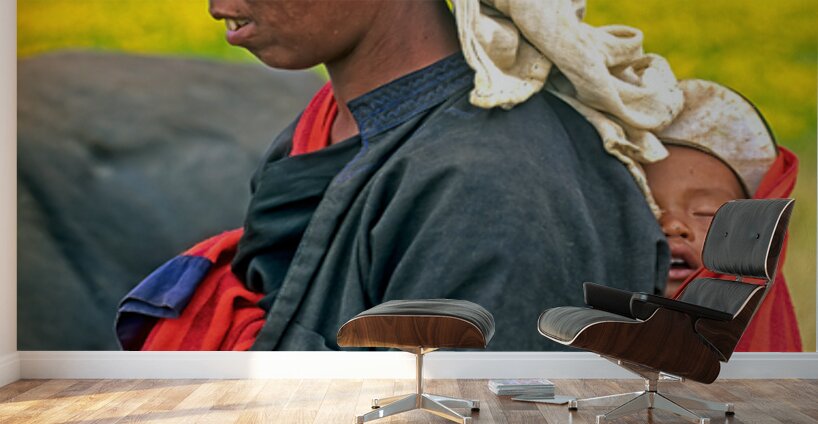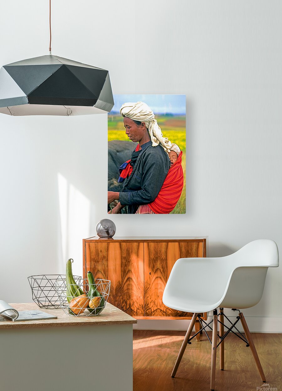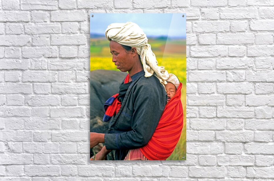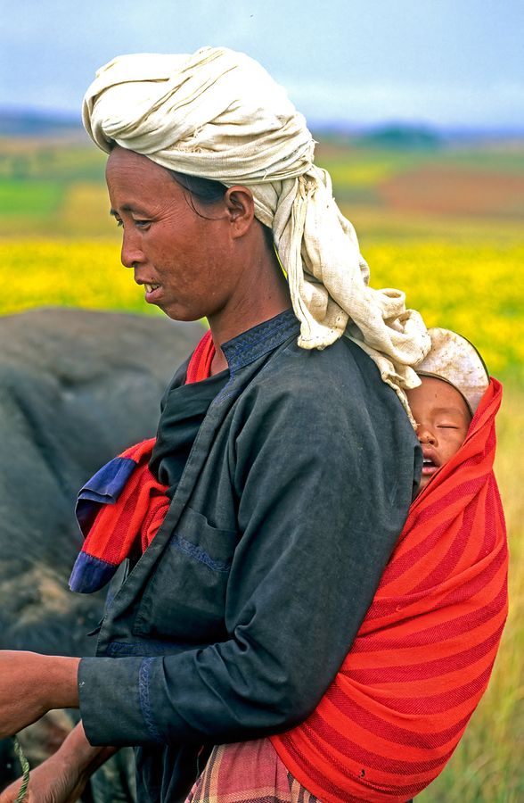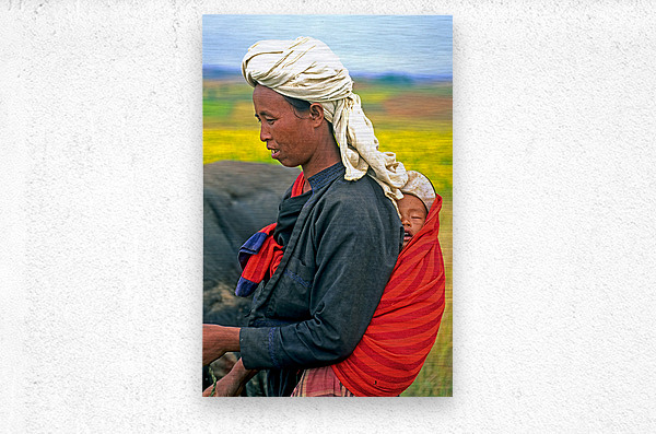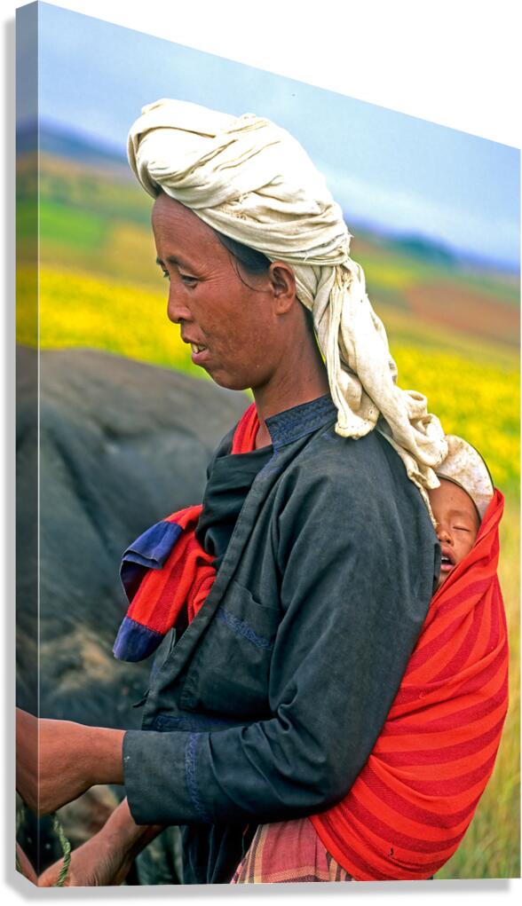 ABOUT THIS ARTWORK: WOMAN CARRIES SON ON HER BACK IN MYANMAR FIELDS