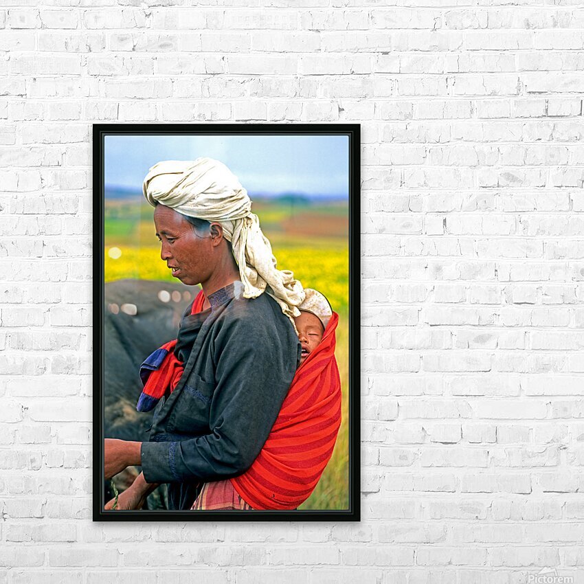 Woman carries son on her back in Myanmar fields Picture Frame Printing