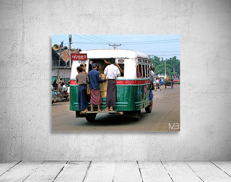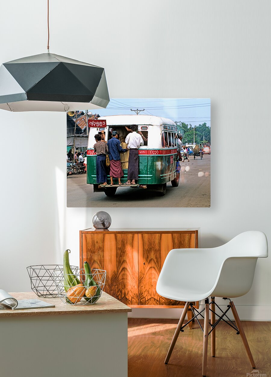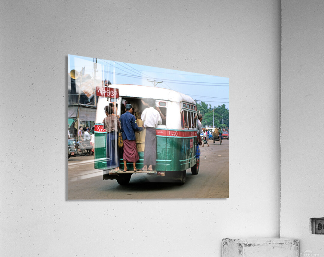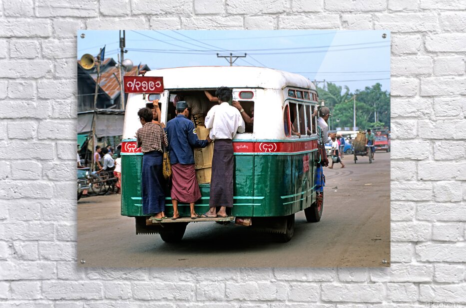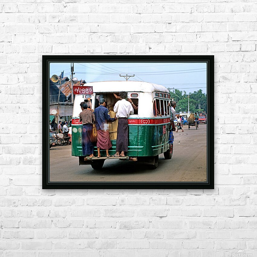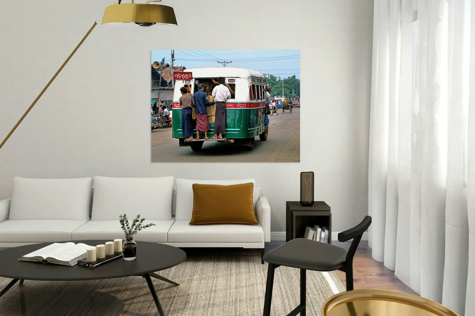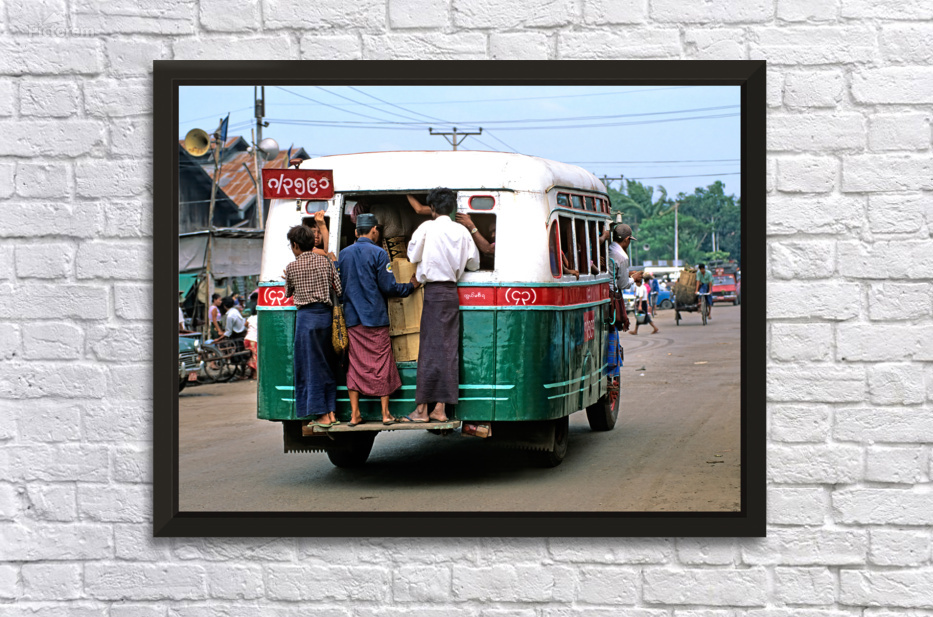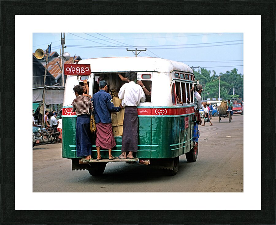 "Busy bus transportation scene in Myanmar with people boarding" in a framed print.