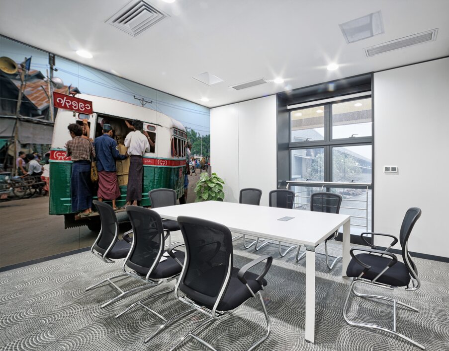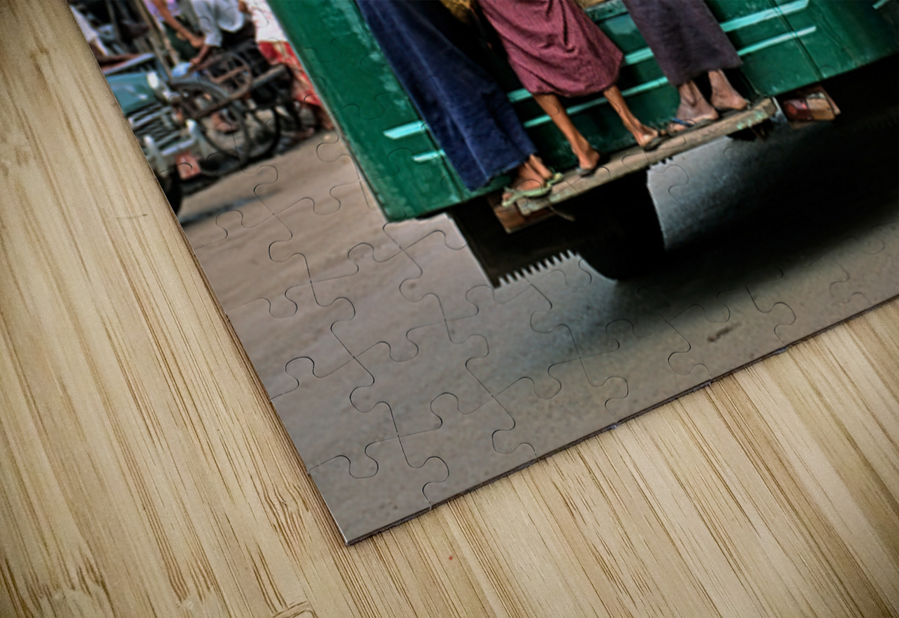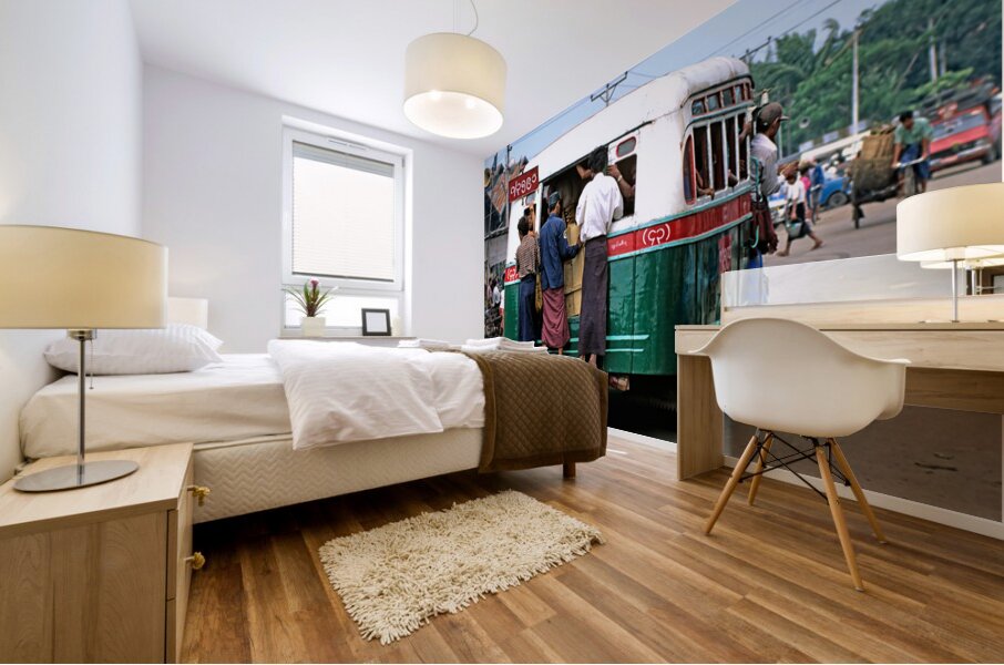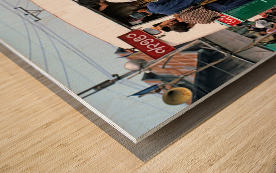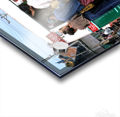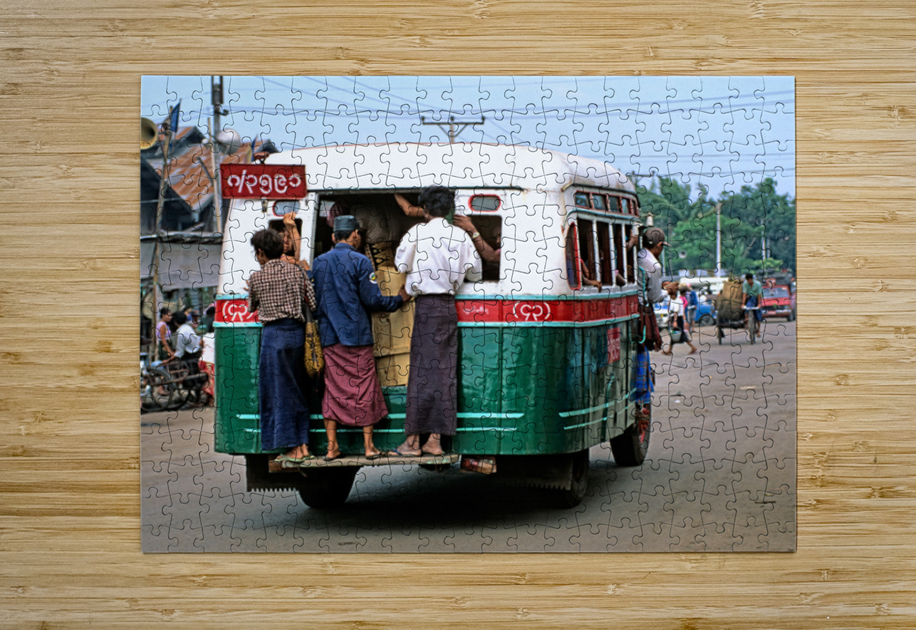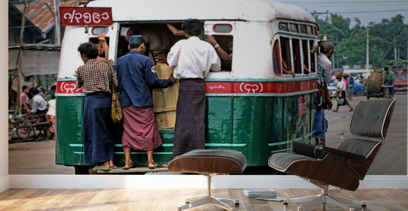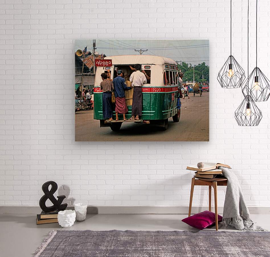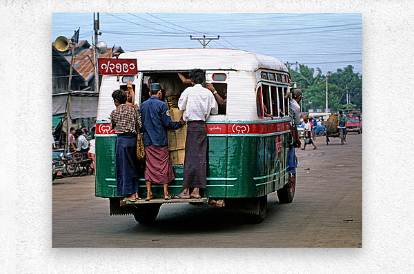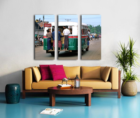 "Busy bus transportation scene in Myanmar with people boarding" in a framed print.