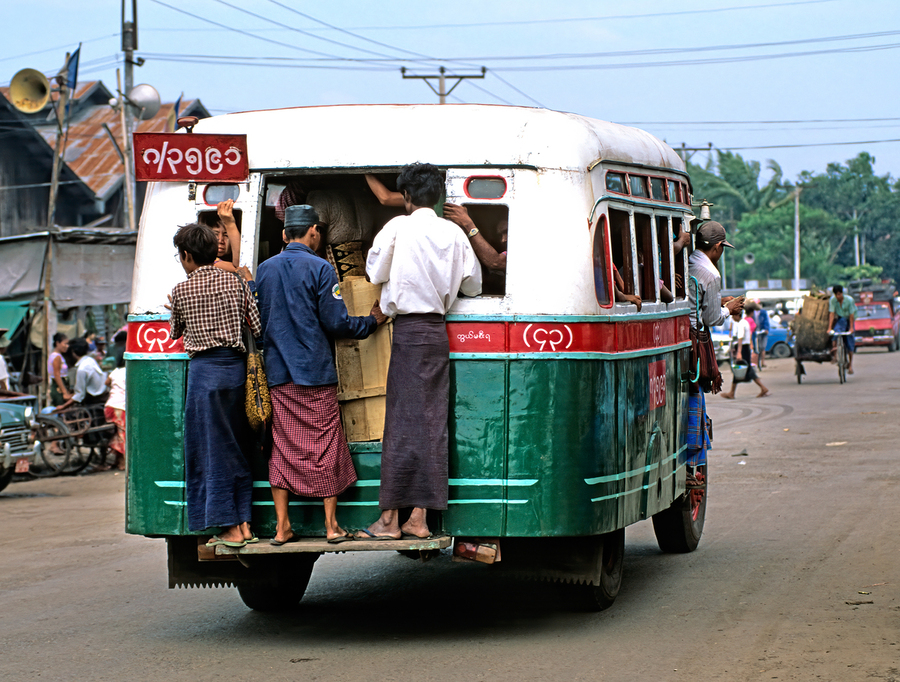 A group of people gather at a bus in Myanmar trying to get on as it prepares to depart. The atmosphere shows bustling daily travel.