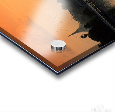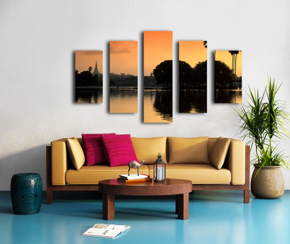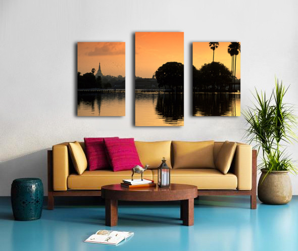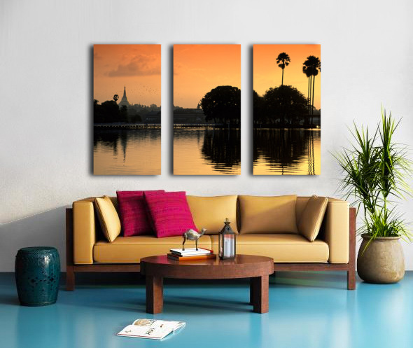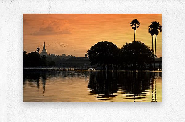 ABOUT THIS ARTWORK: SUNSET OVER THE WATER IN YANGON WITH PALM TREES AND BUILDINGS