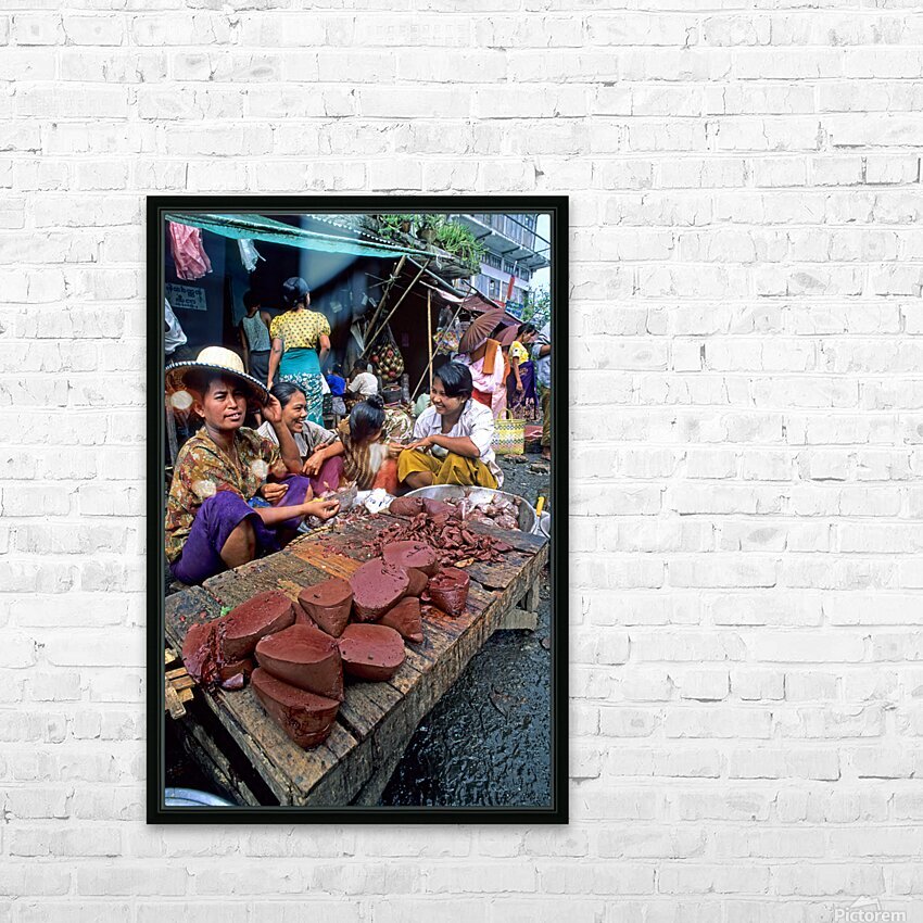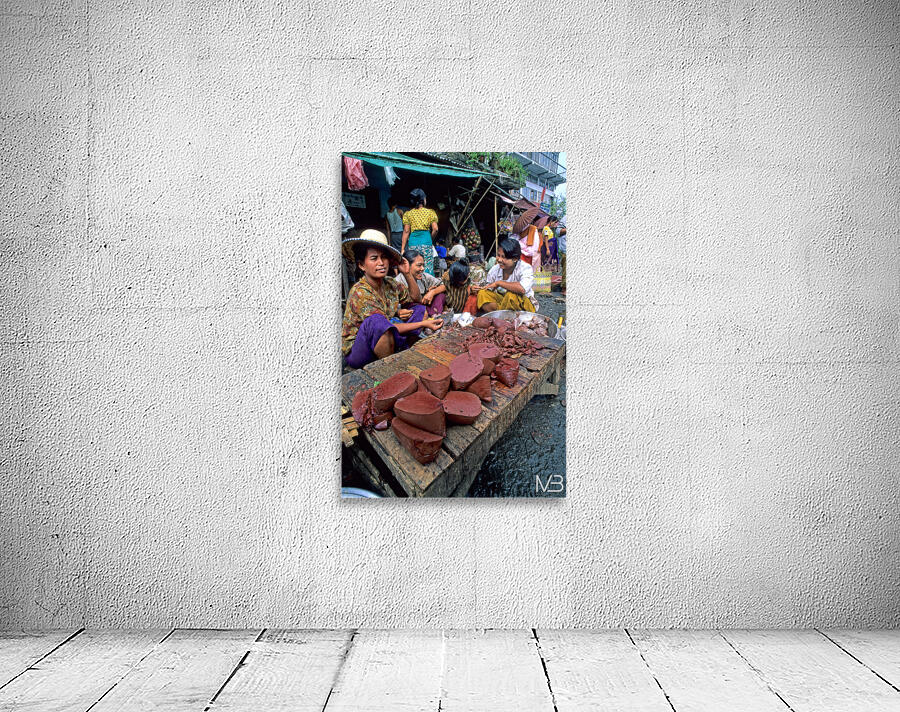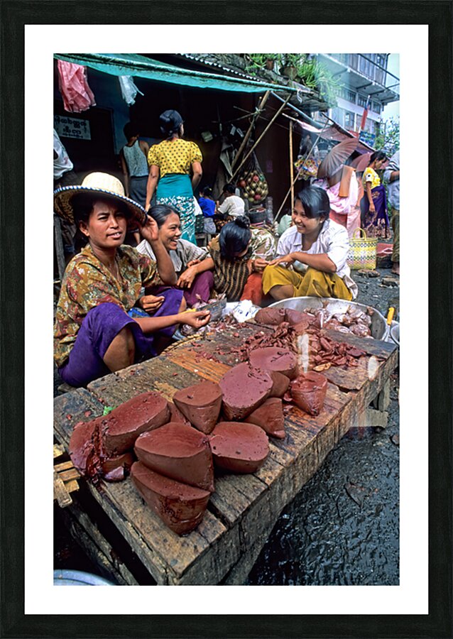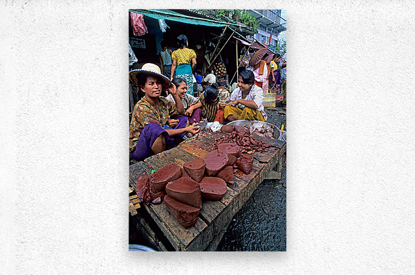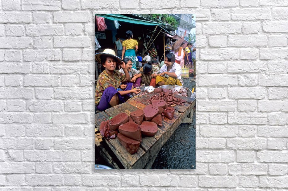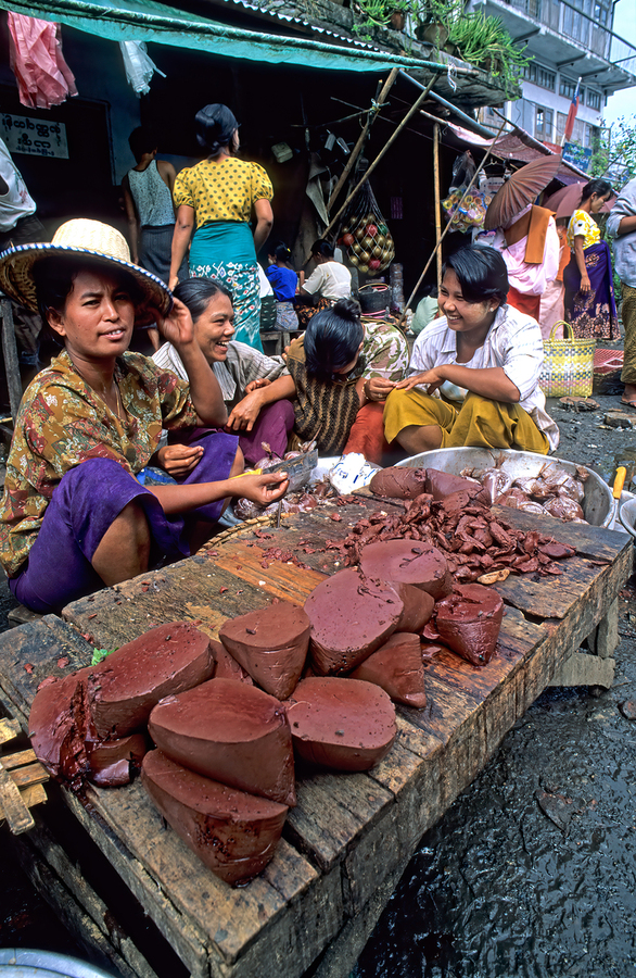 Vendors work together at a busy street market in Yangon. They sell various food items and engage with customers.