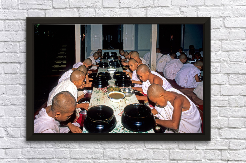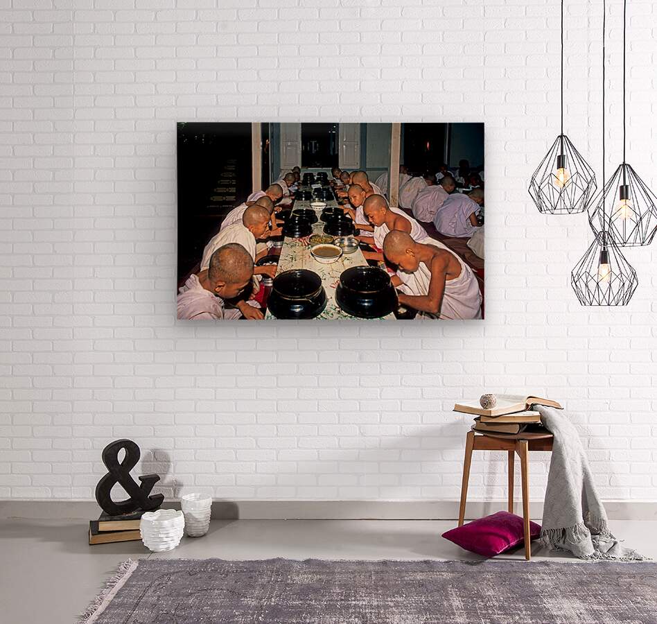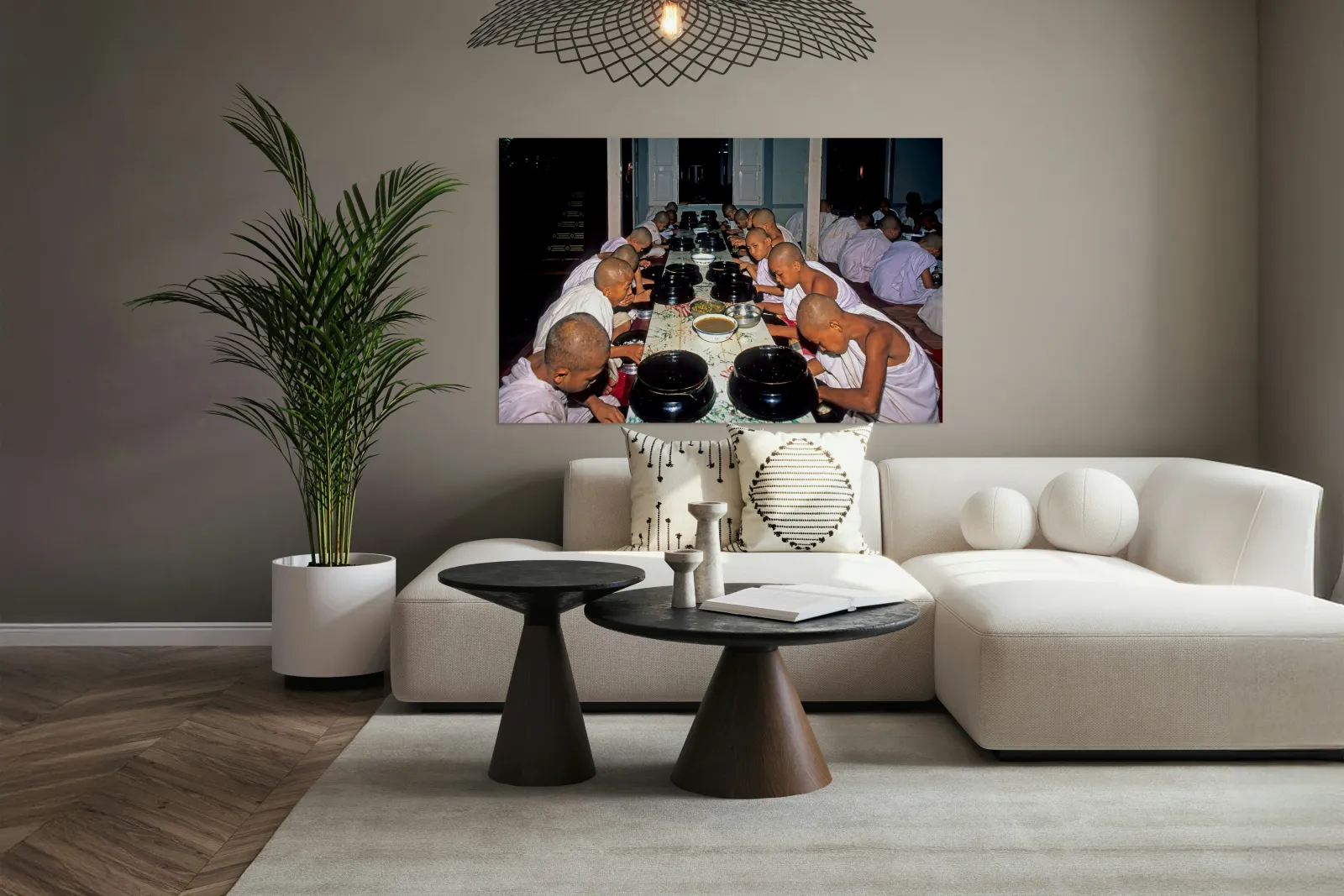 Monks gather for lunch in Mandalay. They sit at a long table focused on their food. The atmosphere shows their daily routine.