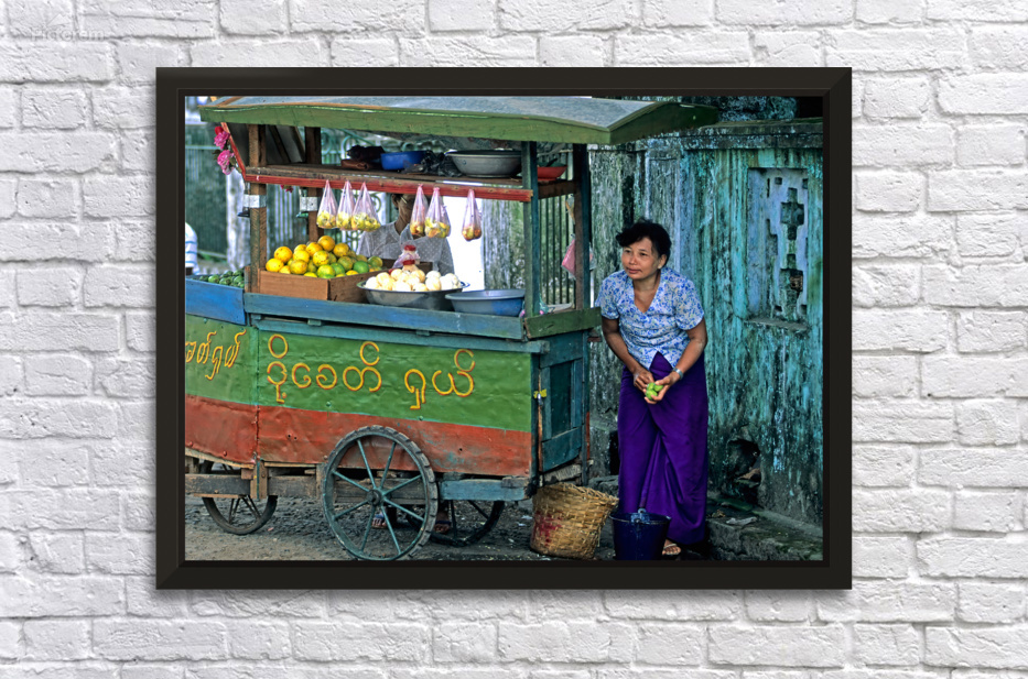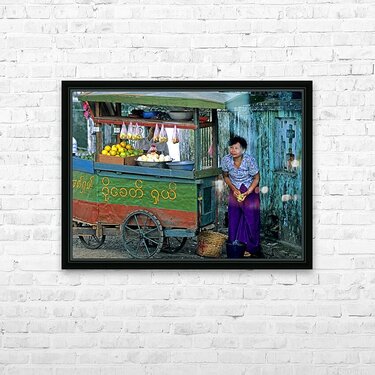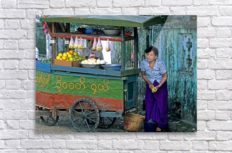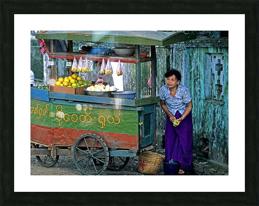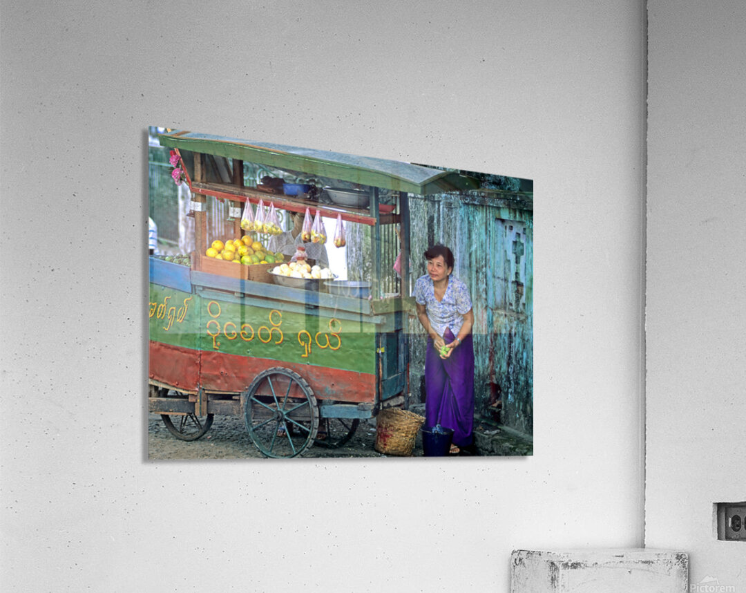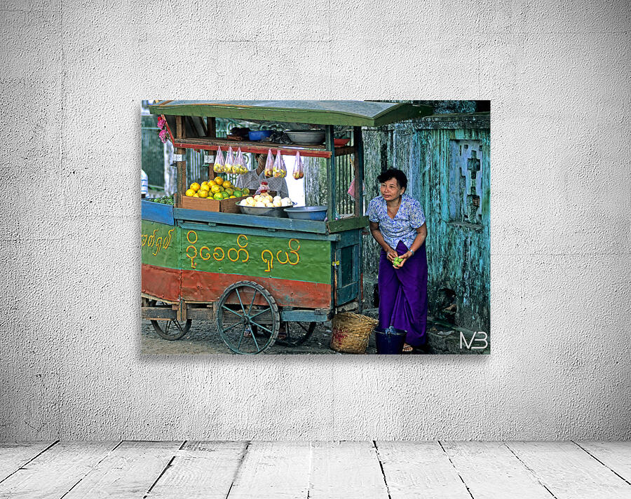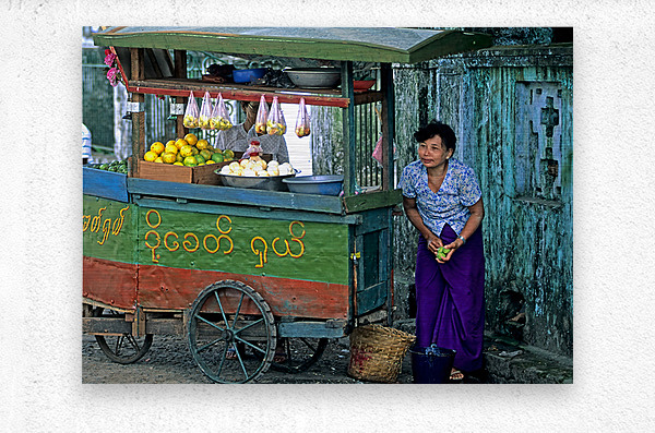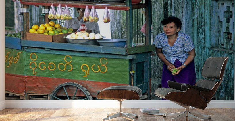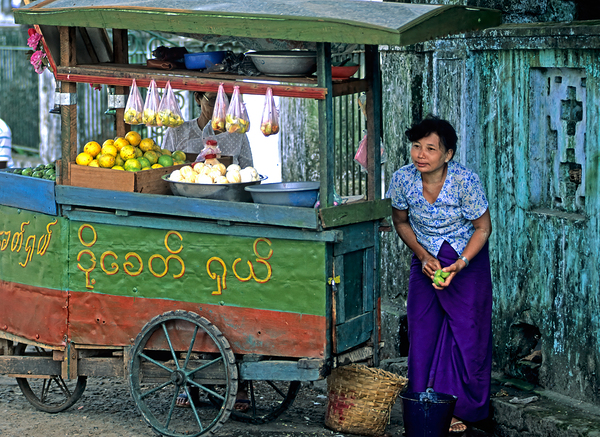 A woman sells fruits from a cart in a busy street market in Yangon. Customers walk by interested in her fresh produce.