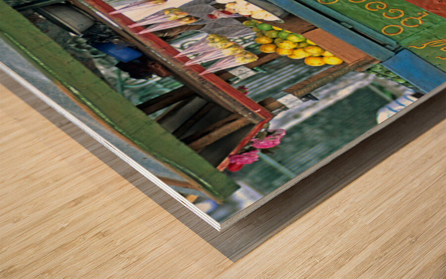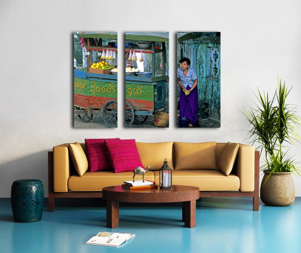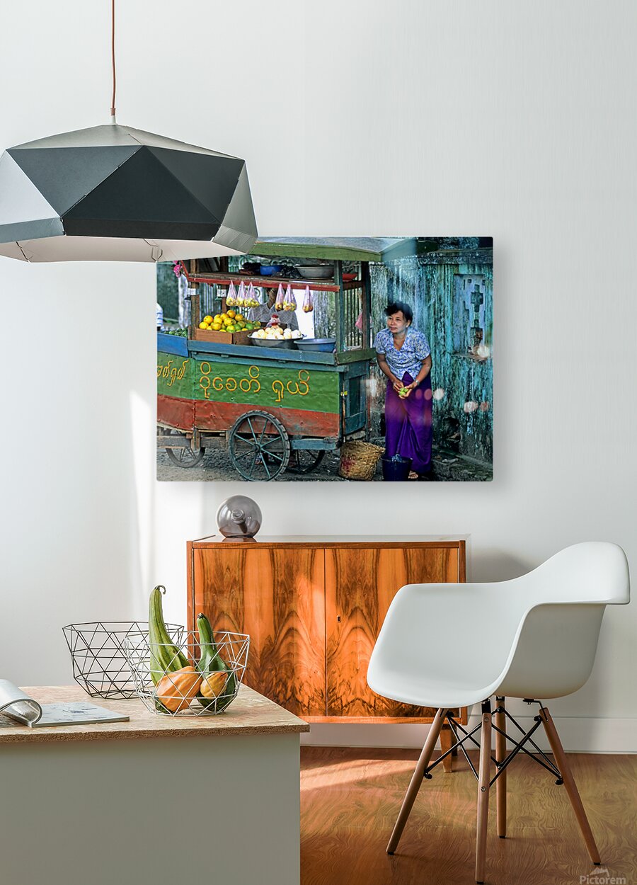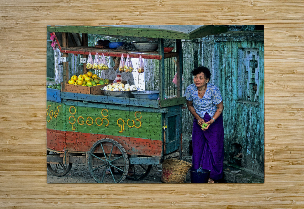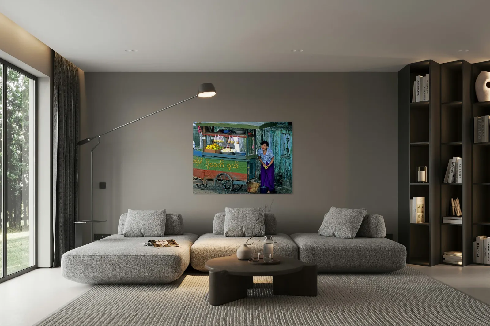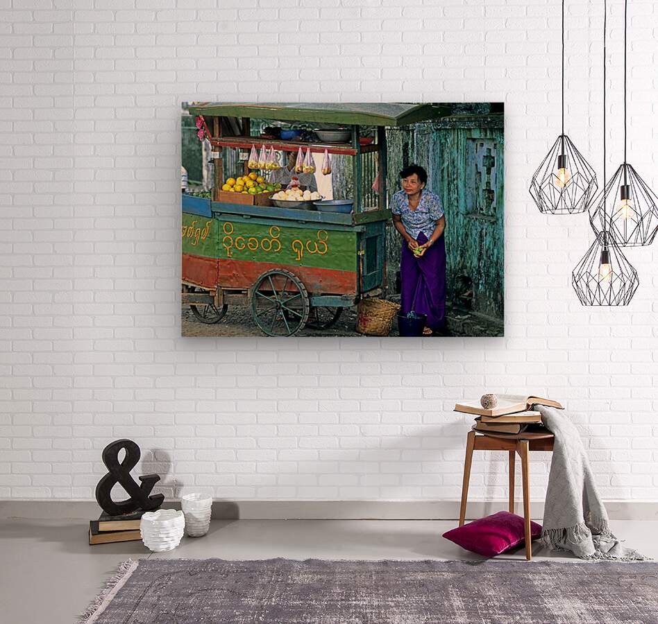 A woman sells fruits from a cart in a busy street market in Yangon. Customers walk by interested in her fresh produce.
