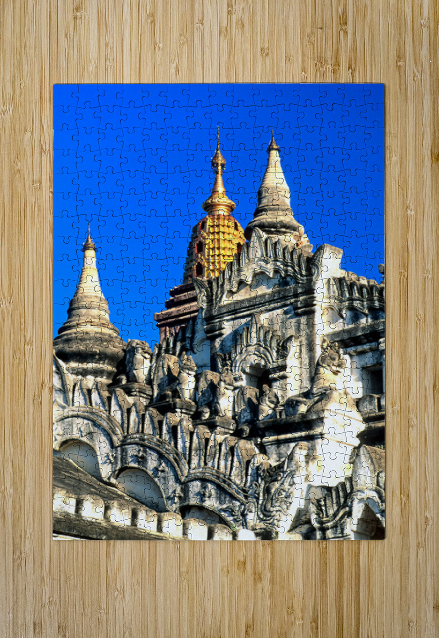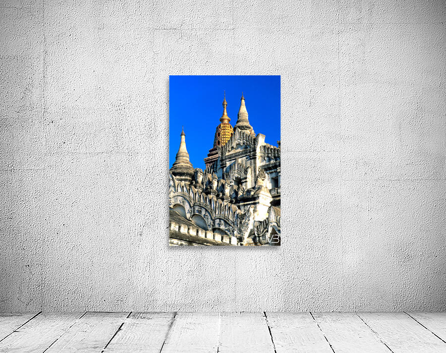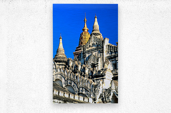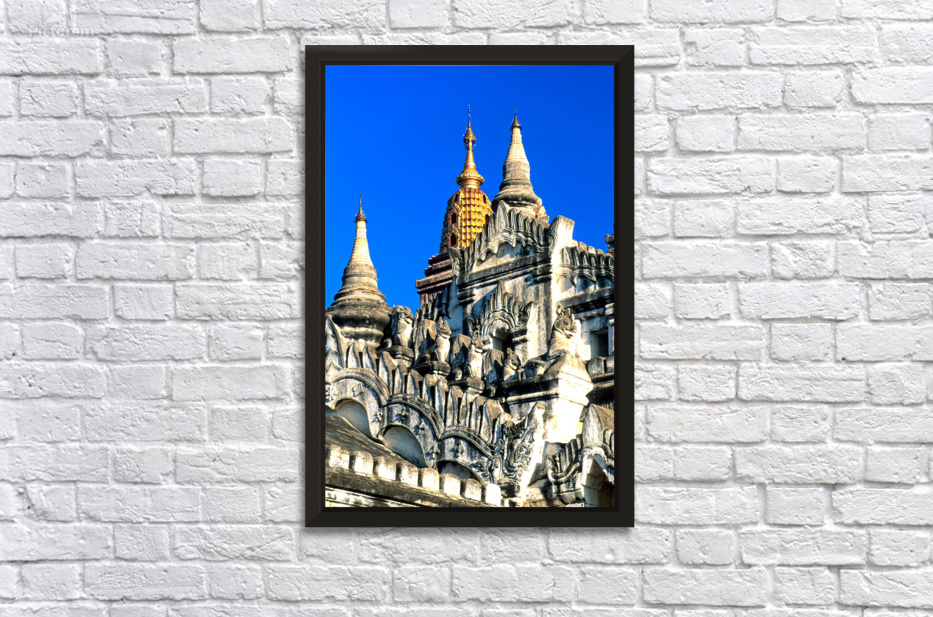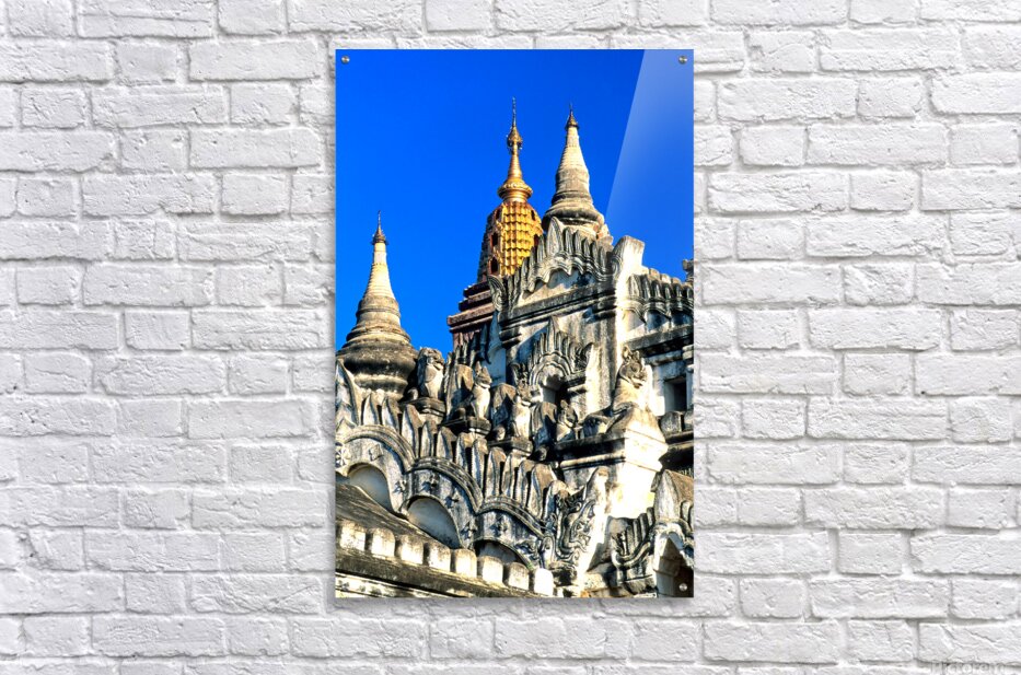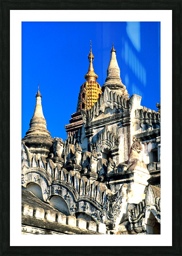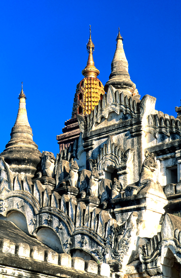 Tourists observe the intricate architecture of Ananda Paya in Bagan. The golden spire stands tall against the blue sky.