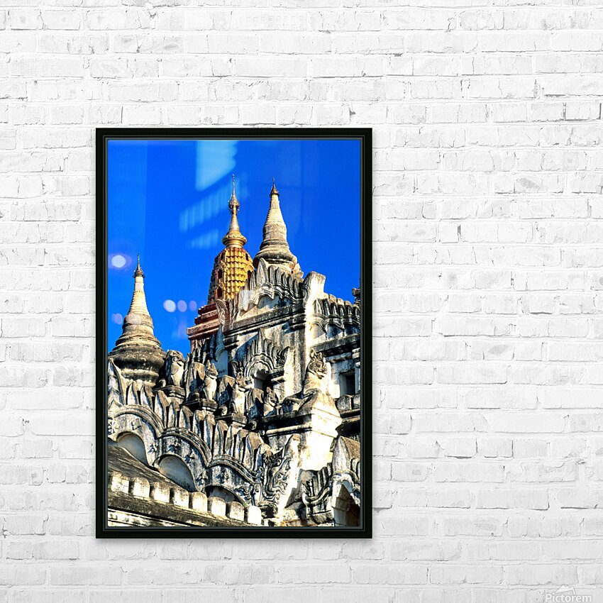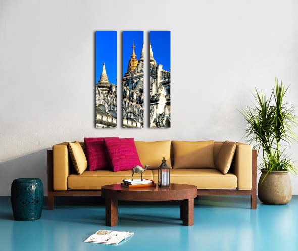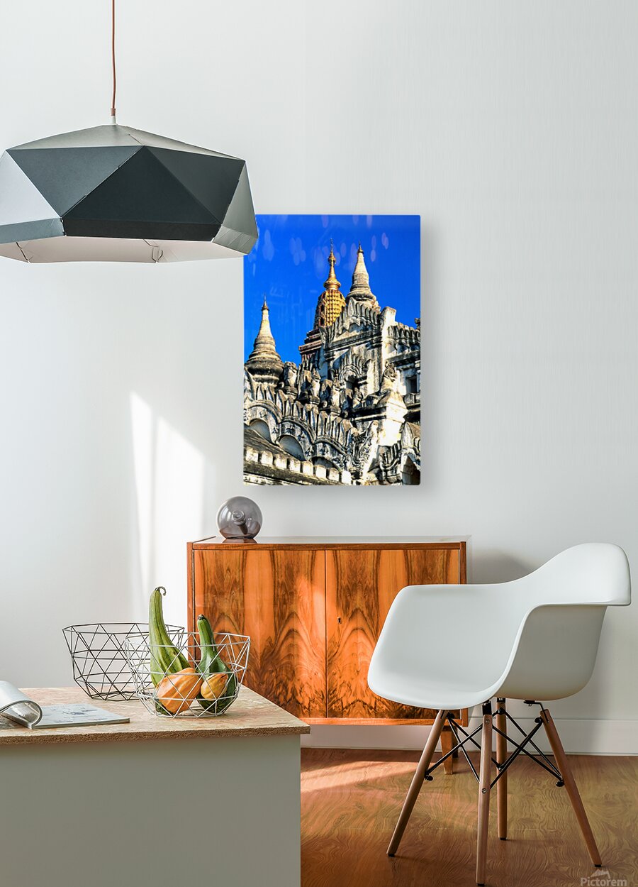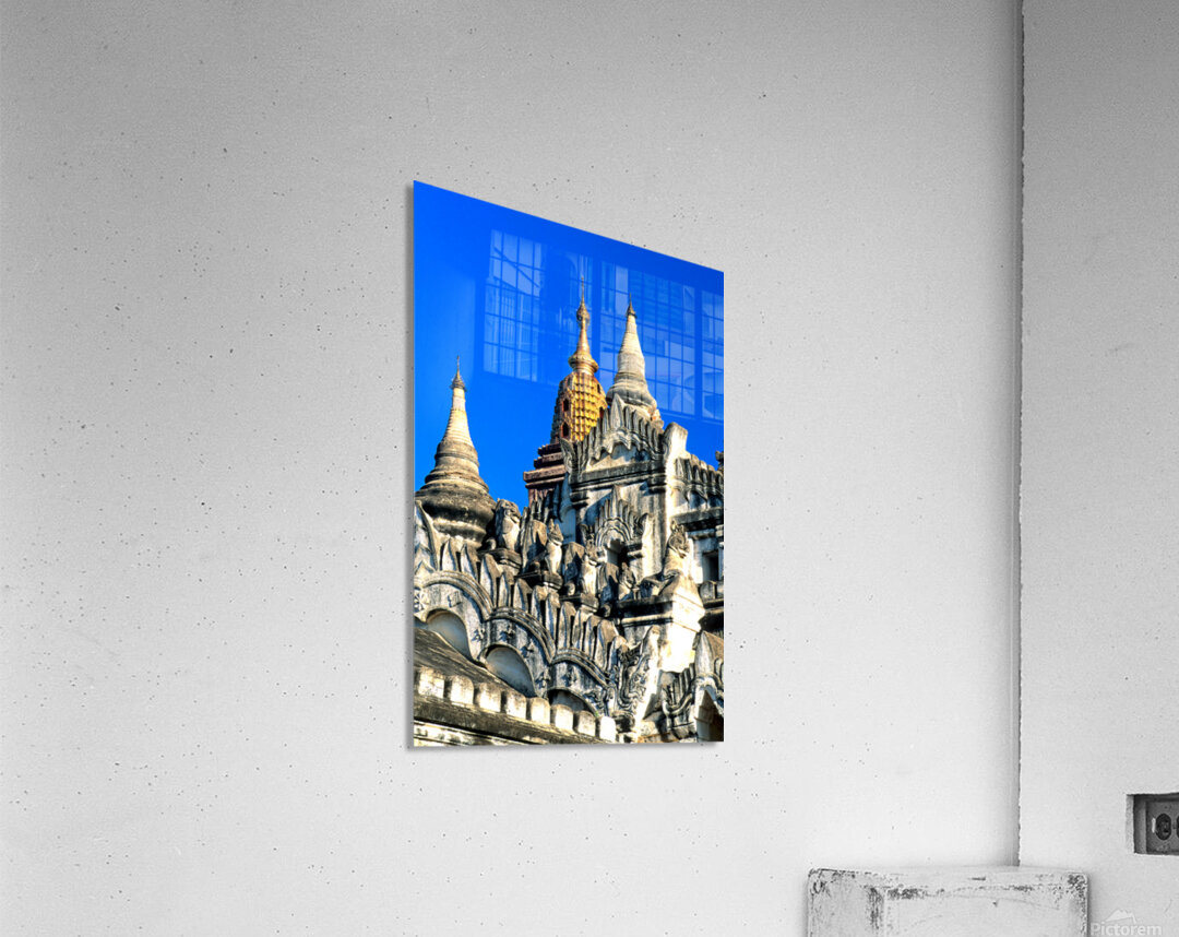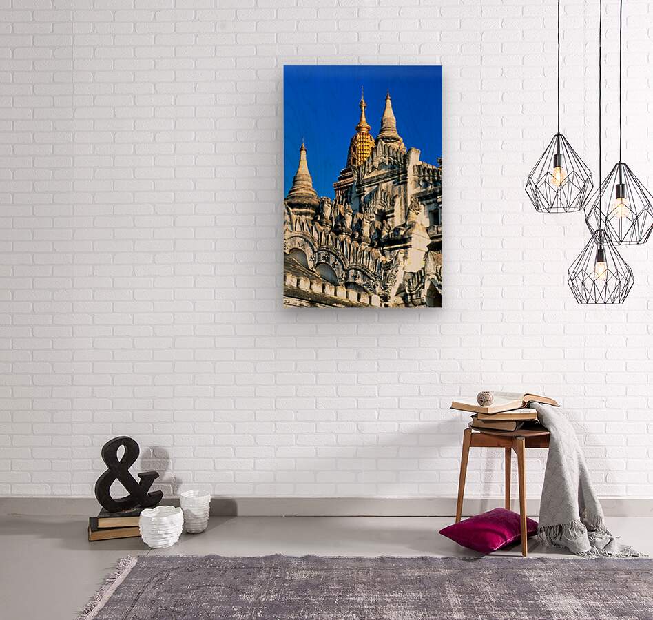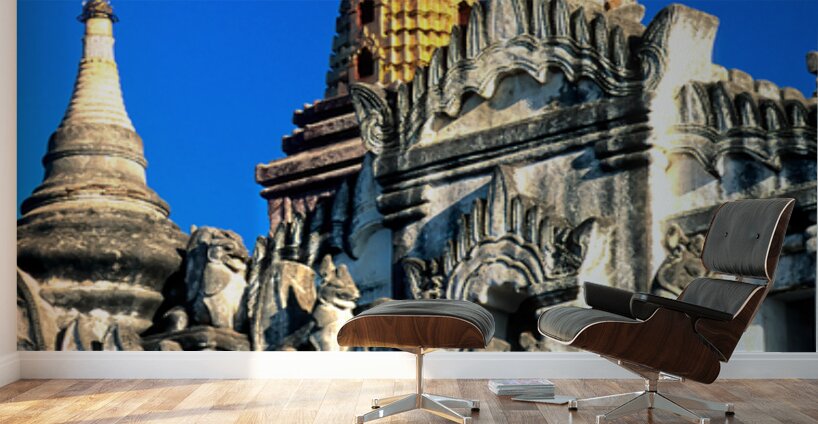 Tourists observe the intricate architecture of Ananda Paya in Bagan. The golden spire stands tall against the blue sky.