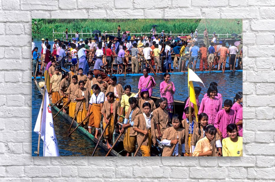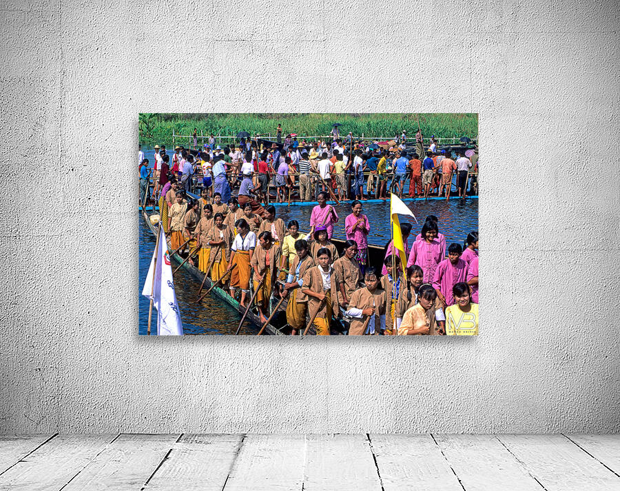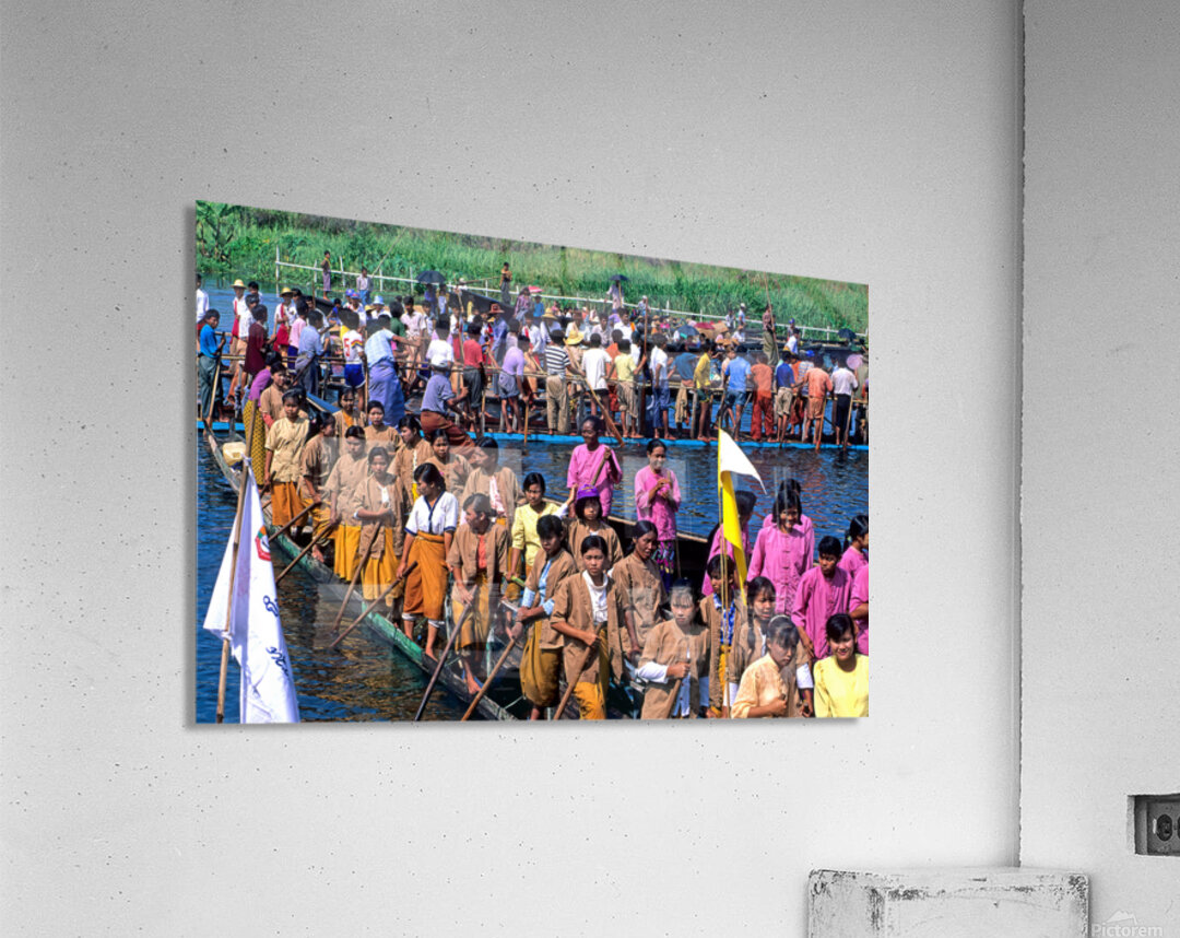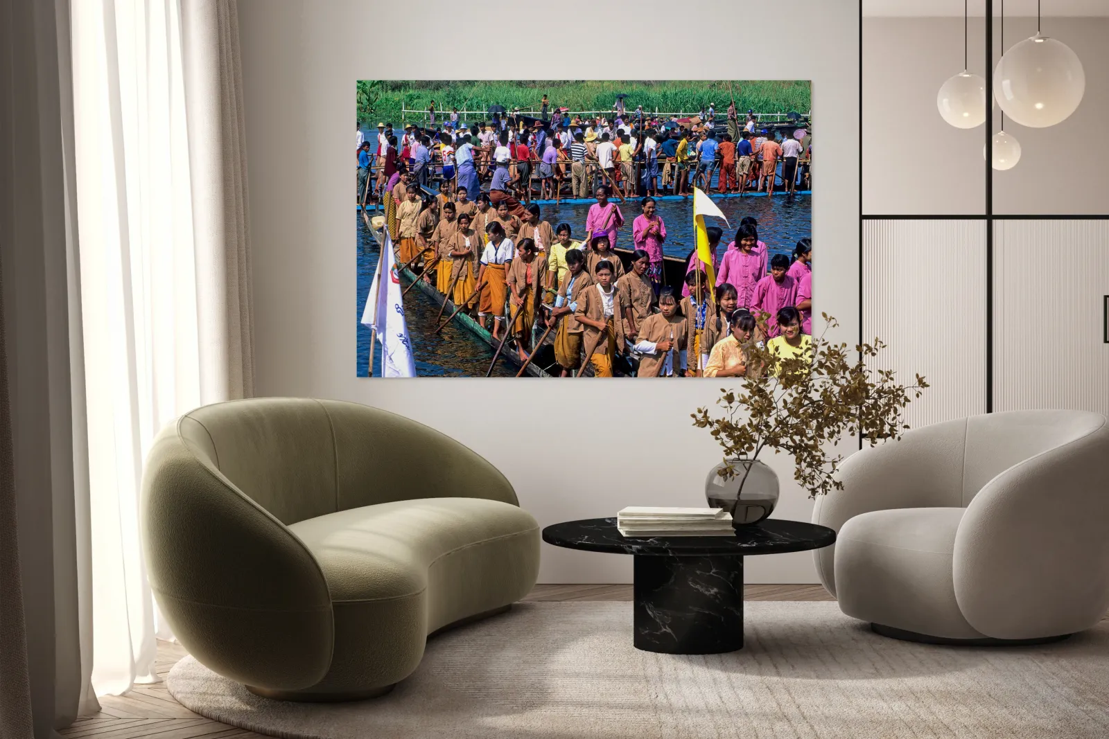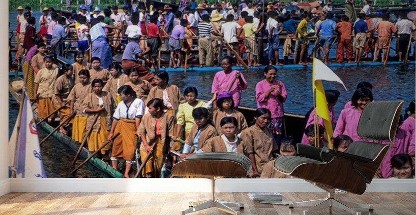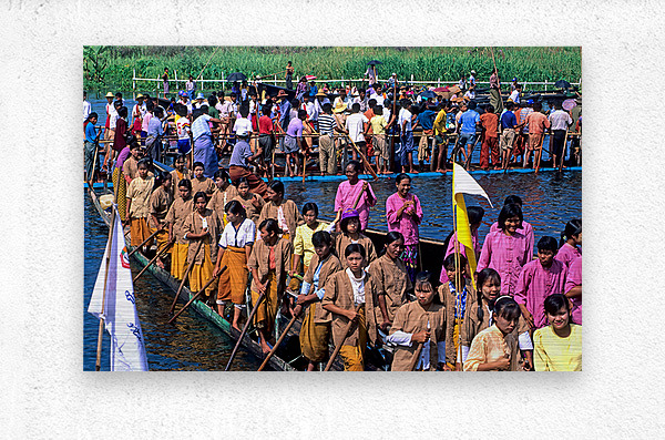 Many people gather on boats at Inle Lake for a festival. Participants wear traditional clothes and take part in various activities on the water.