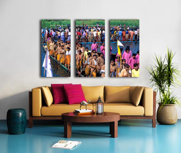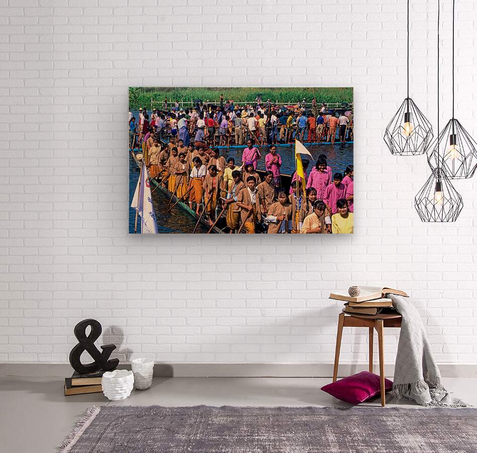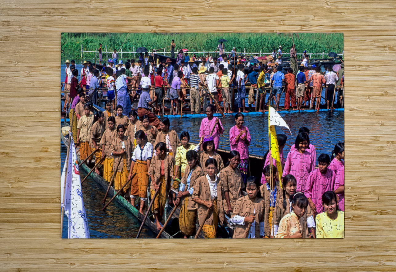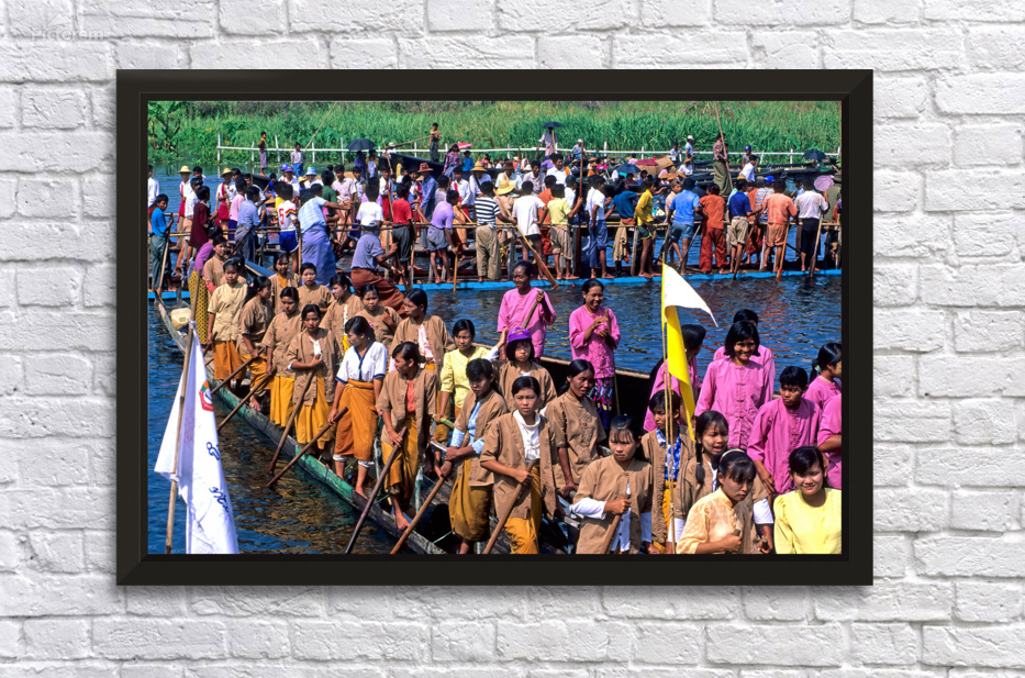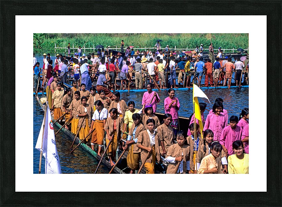 Many people gather on boats at Inle Lake for a festival. Participants wear traditional clothes and take part in various activities on the water.