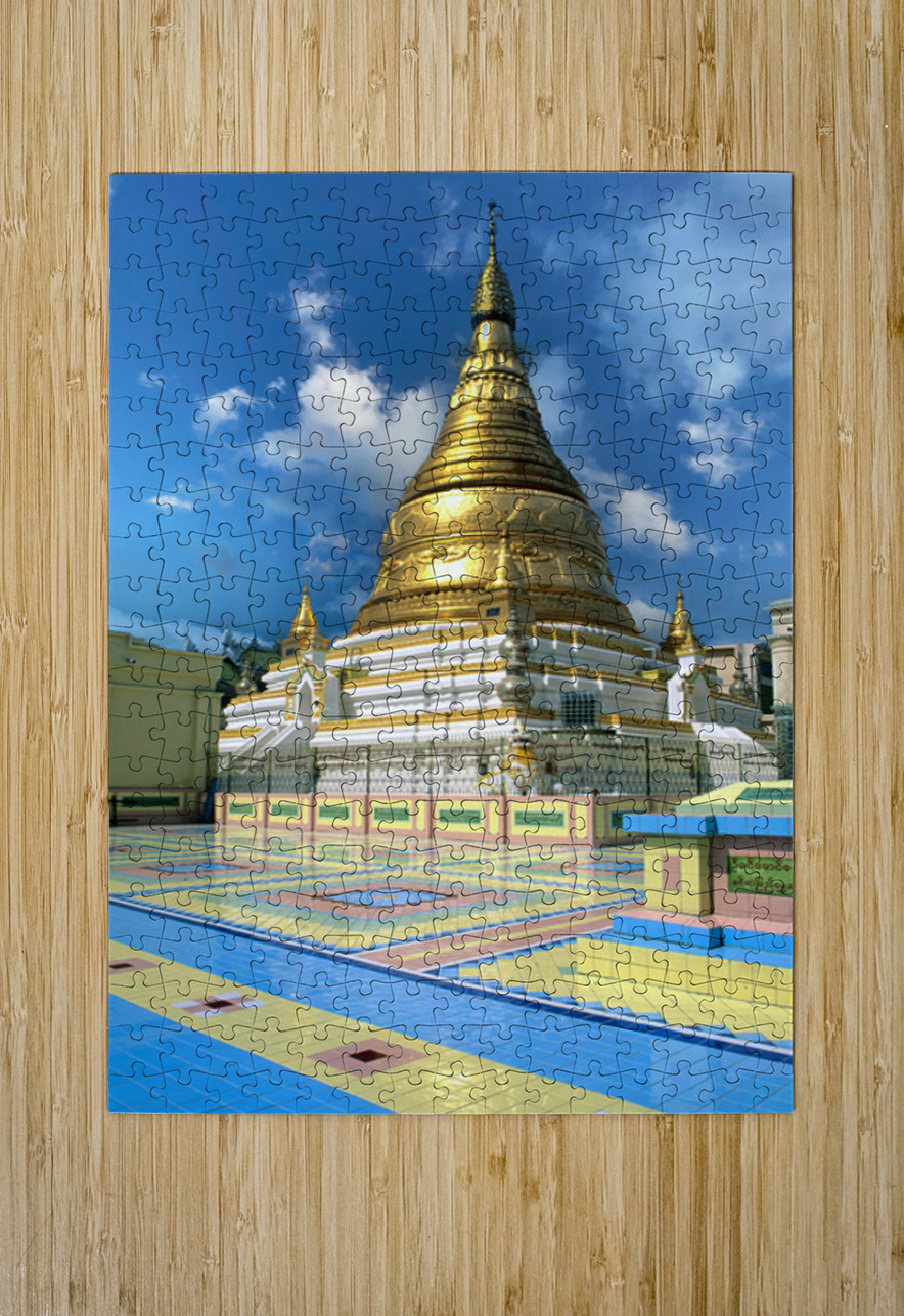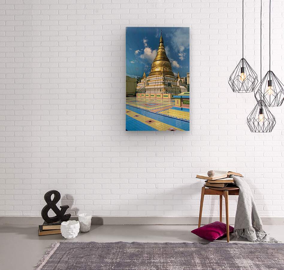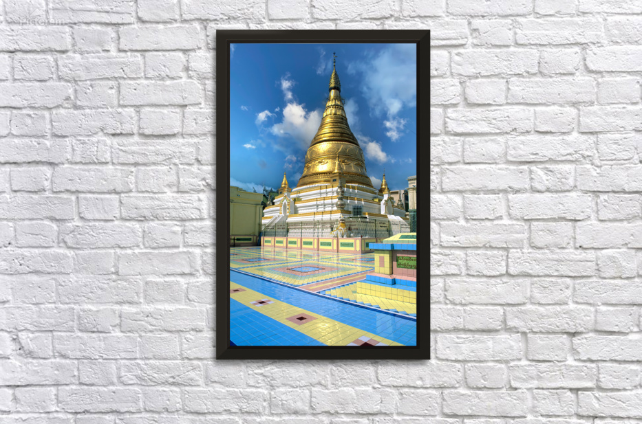 "Golden stupa at Sagaing Paya in Myanmar under blue sky" in a framed print.