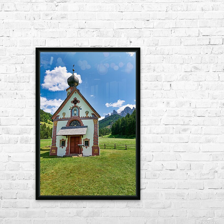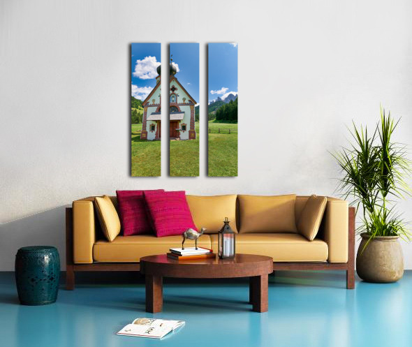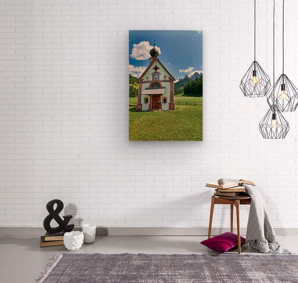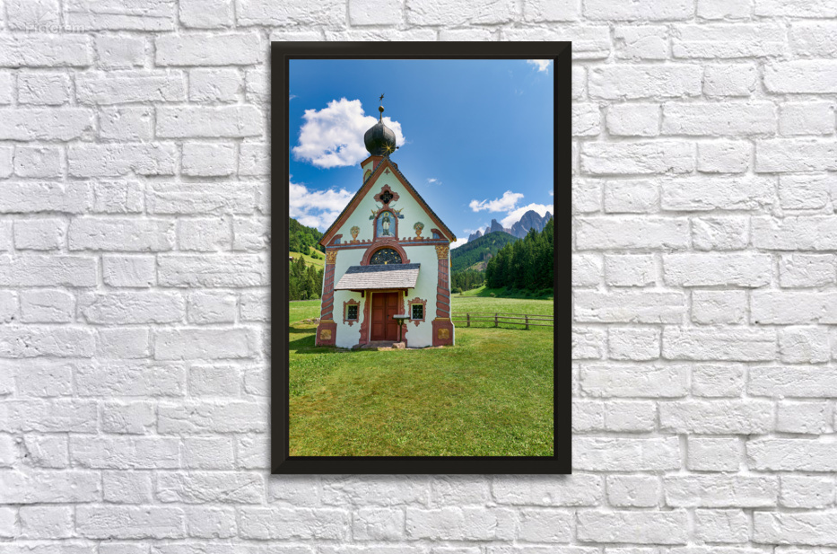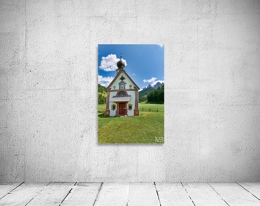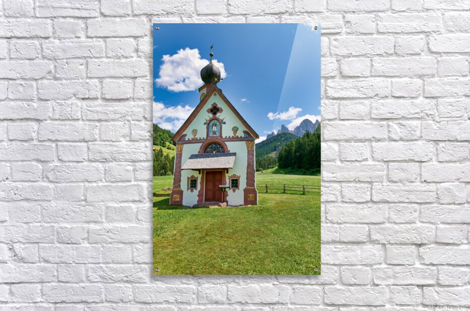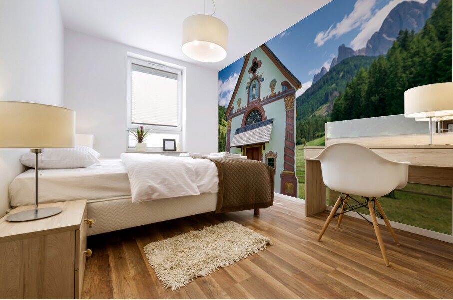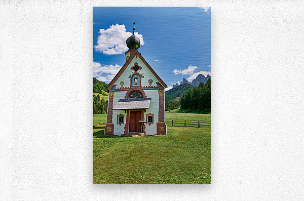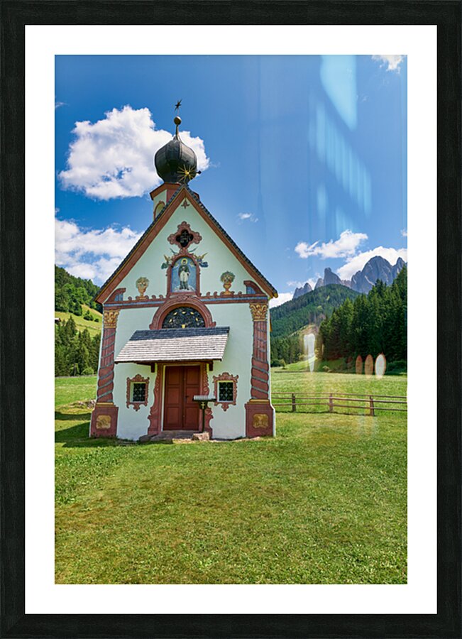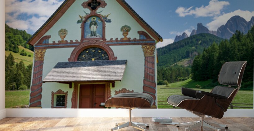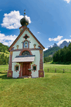 St. John Ranui church is located in Val di Funes South Tyrol. The church sits among green fields and mountains on a sunny day.