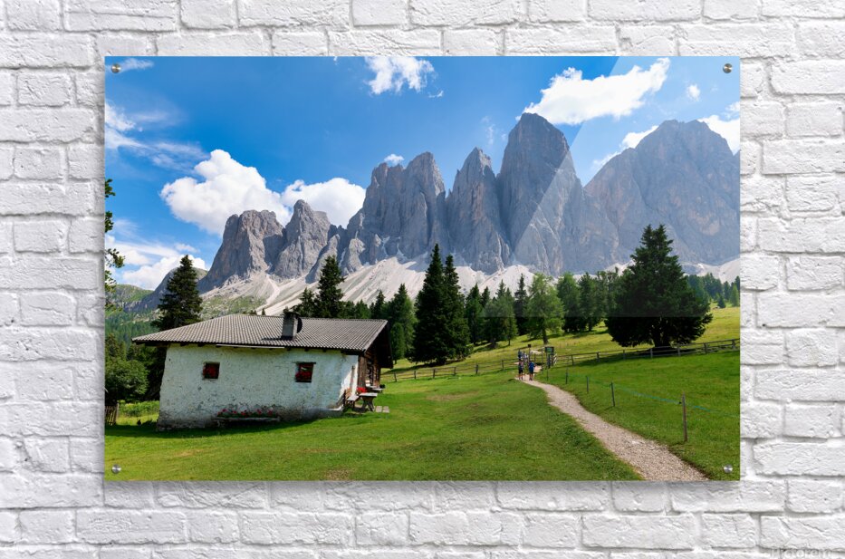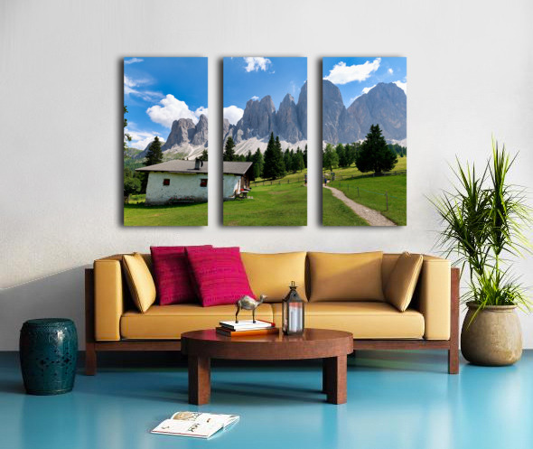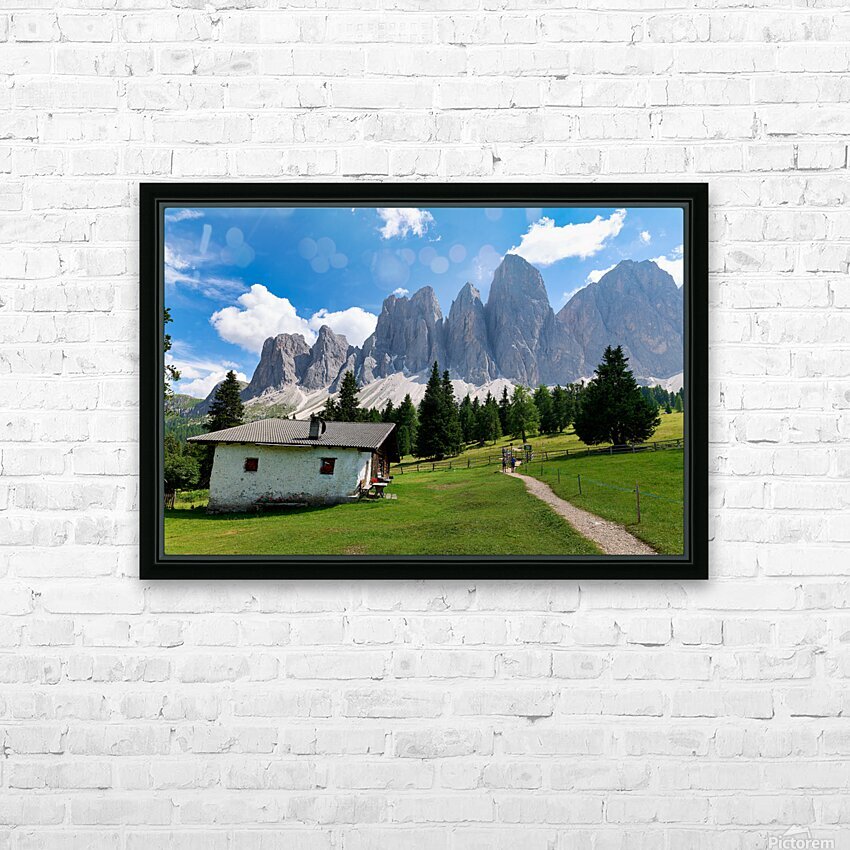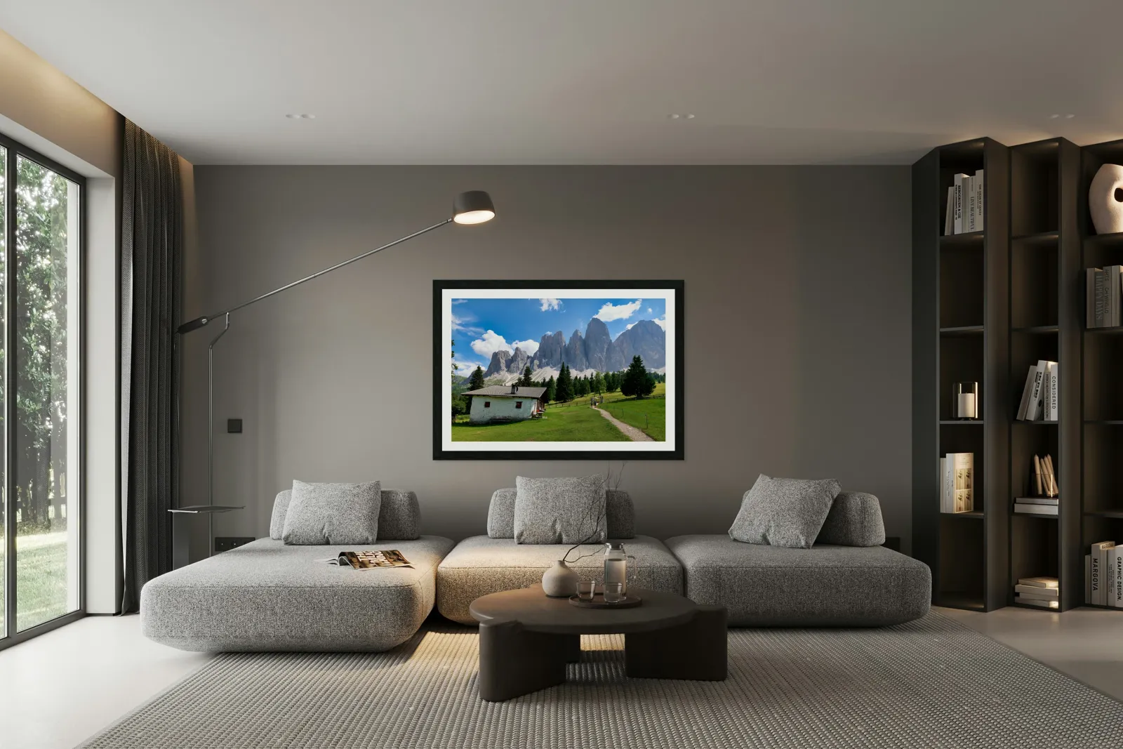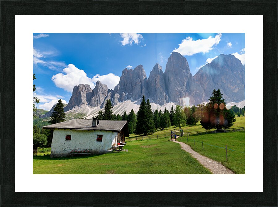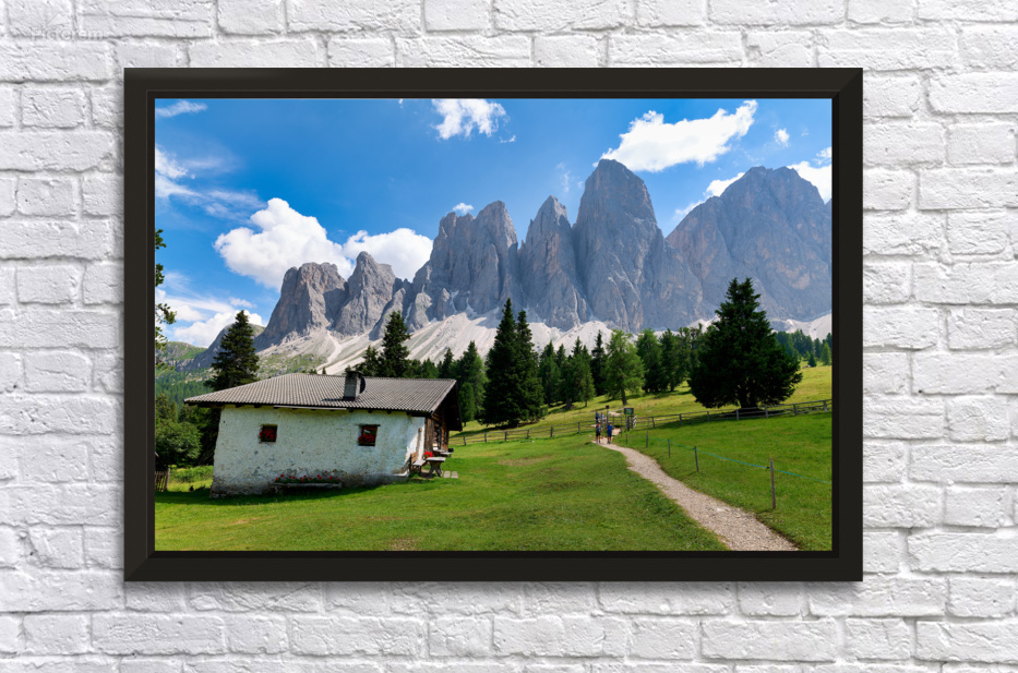 "Panorama of Dolomites in Val di Funes South Tyrol Italy" in a framed print.