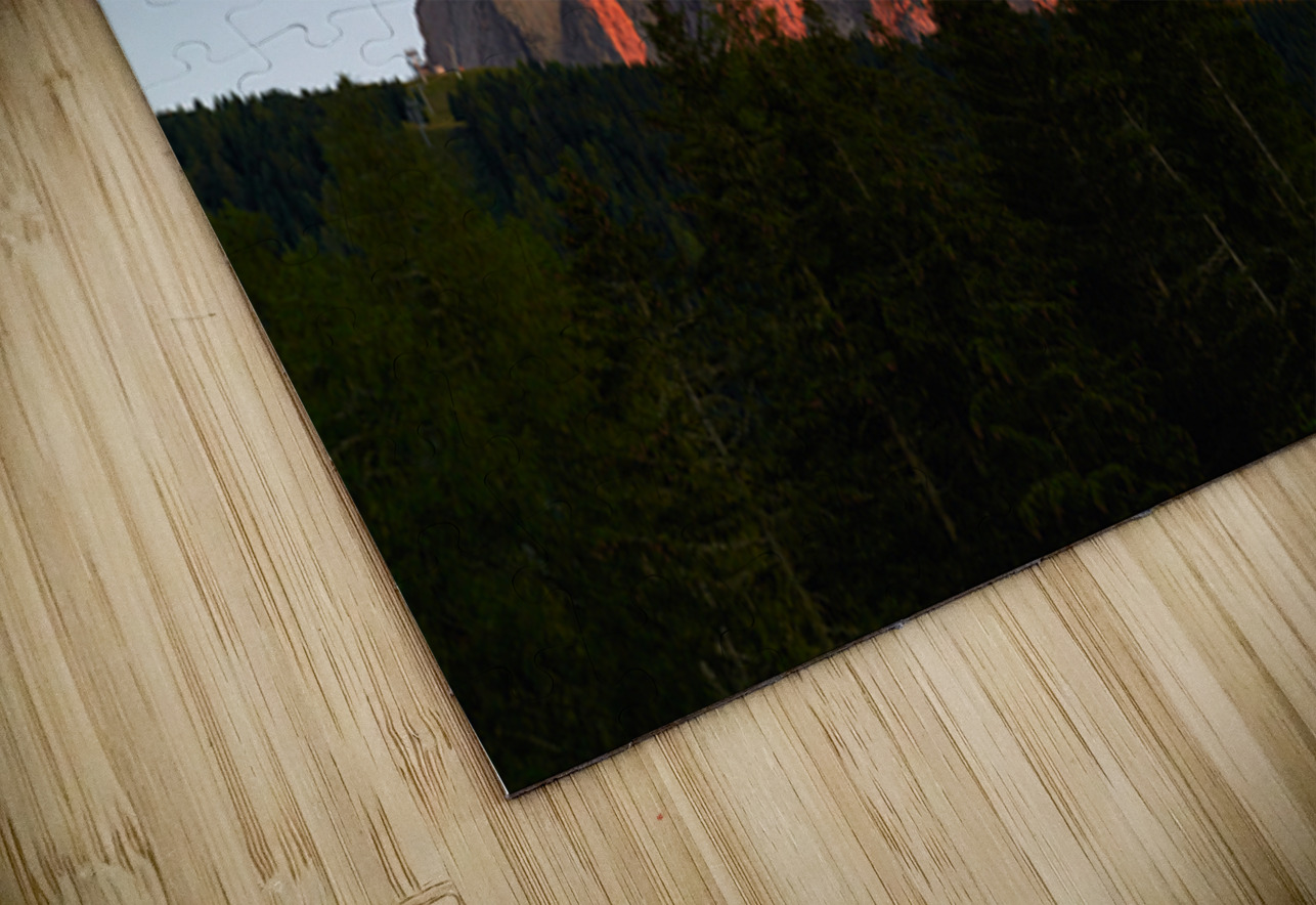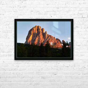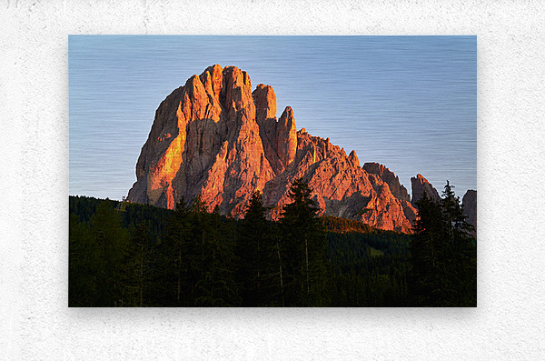 Sassolungo stands tall as the sun sets casting warm light over the mountains and trees in Val Gardena Italy creating a stunning view.