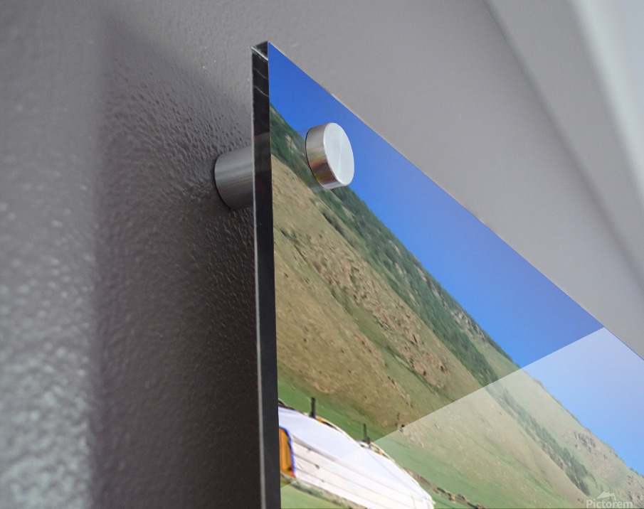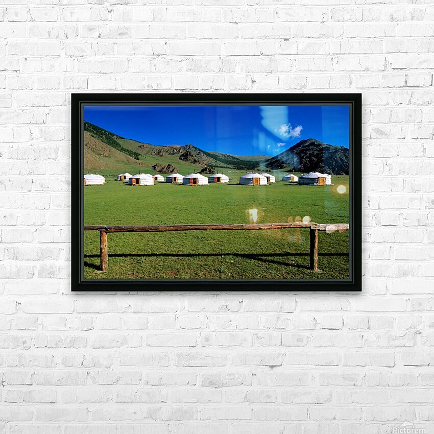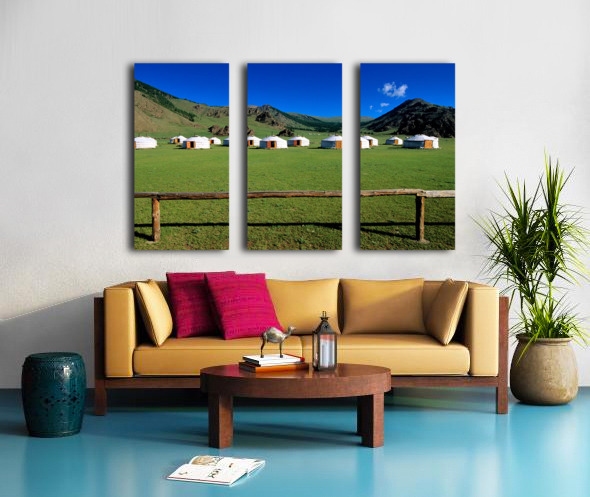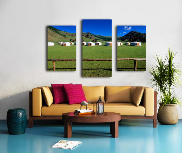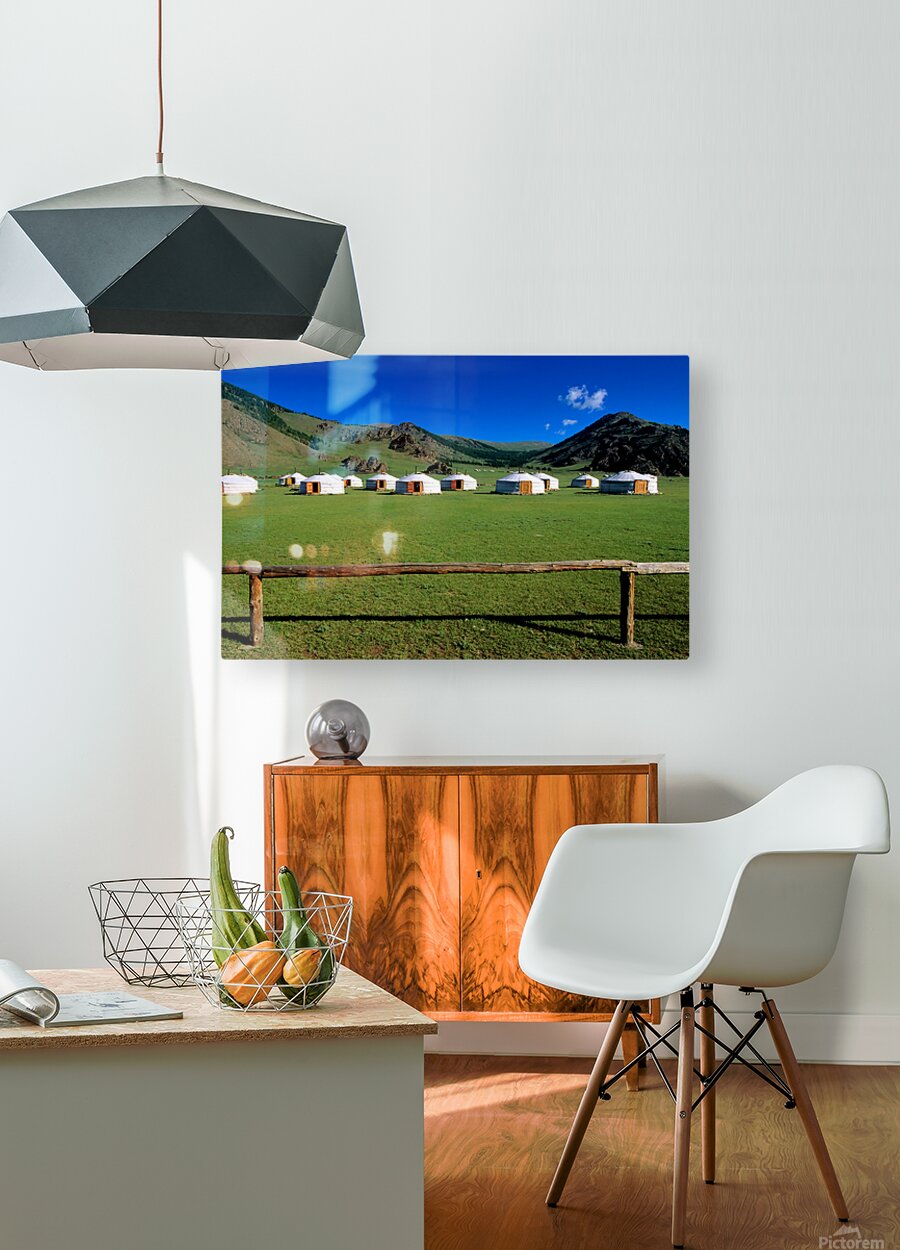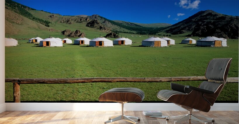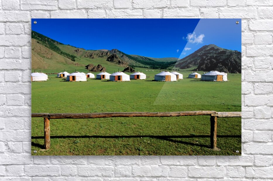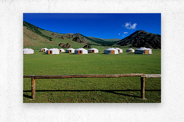 ABOUT THIS ARTWORK: GER TENTS IN THE GRASSY FIELDS OF MONGOLIA UNDER CLEAR SKIES