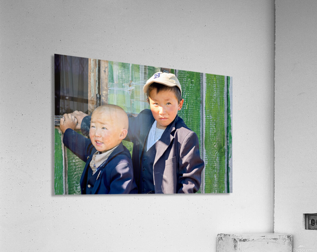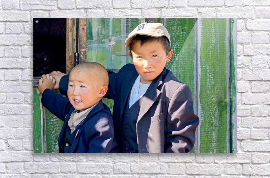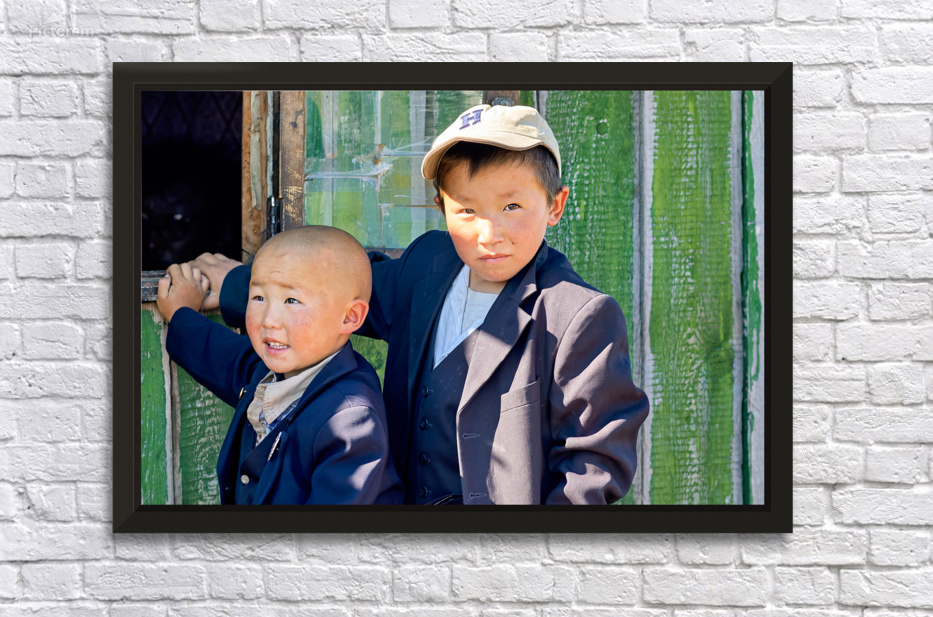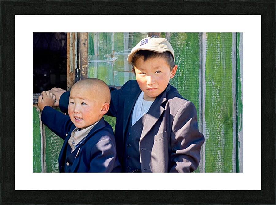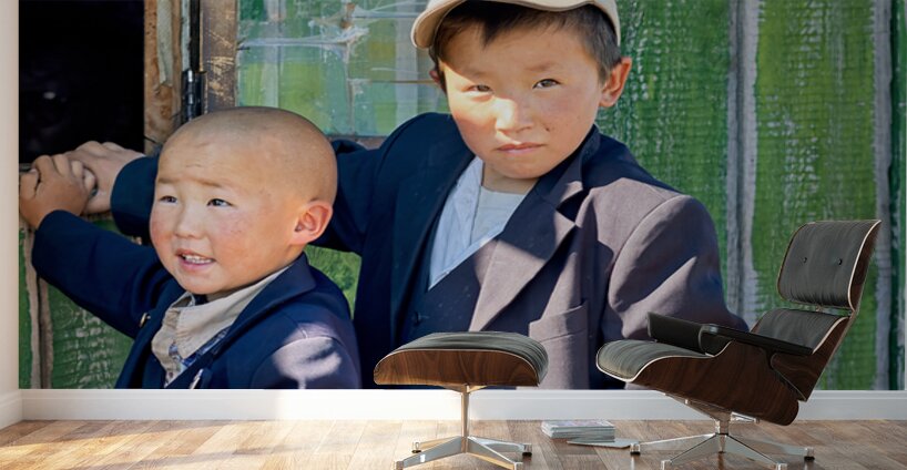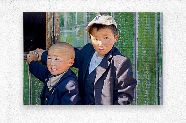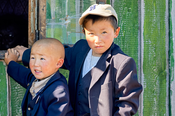 Two boys in Mongolia are standing near a green wooden door. They are dressed in formal attire. The younger boy is smiling broadly.