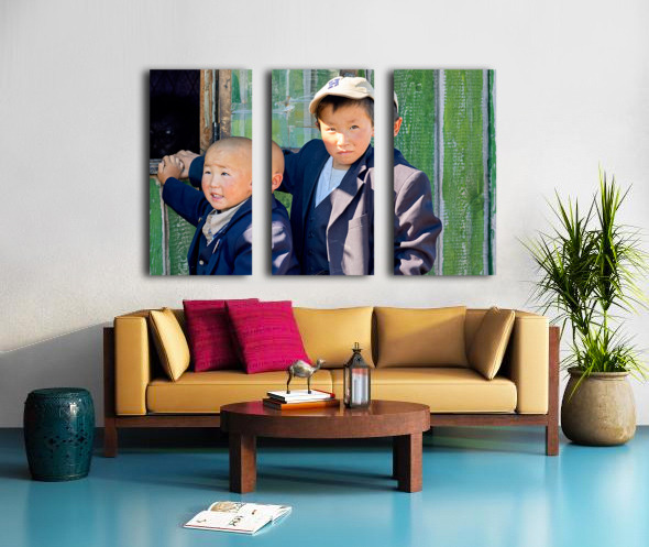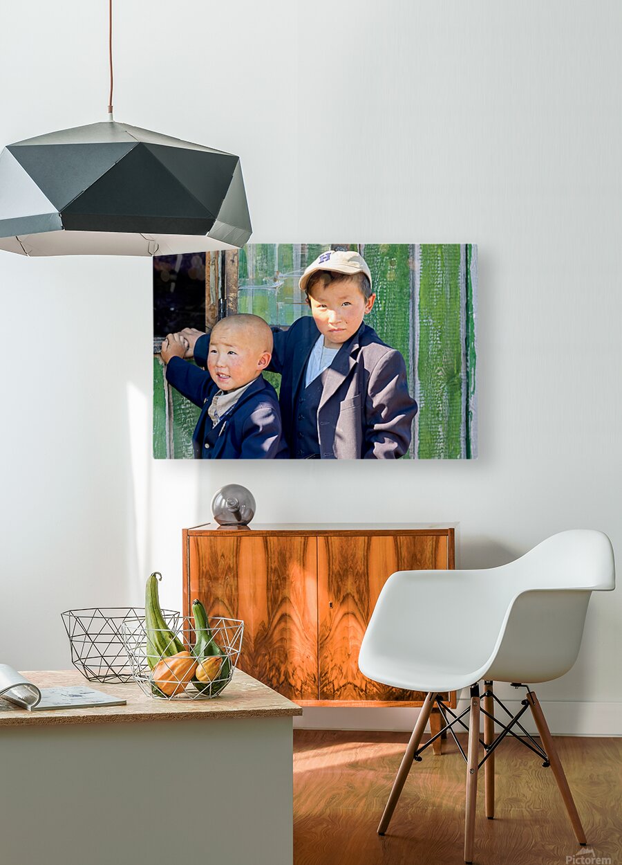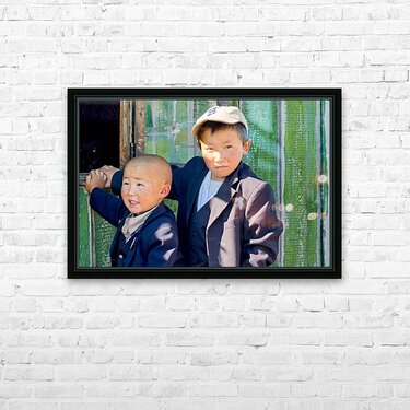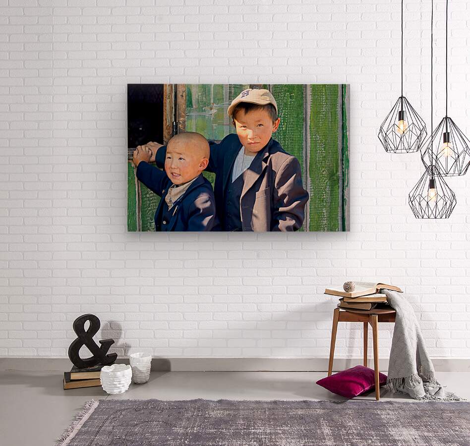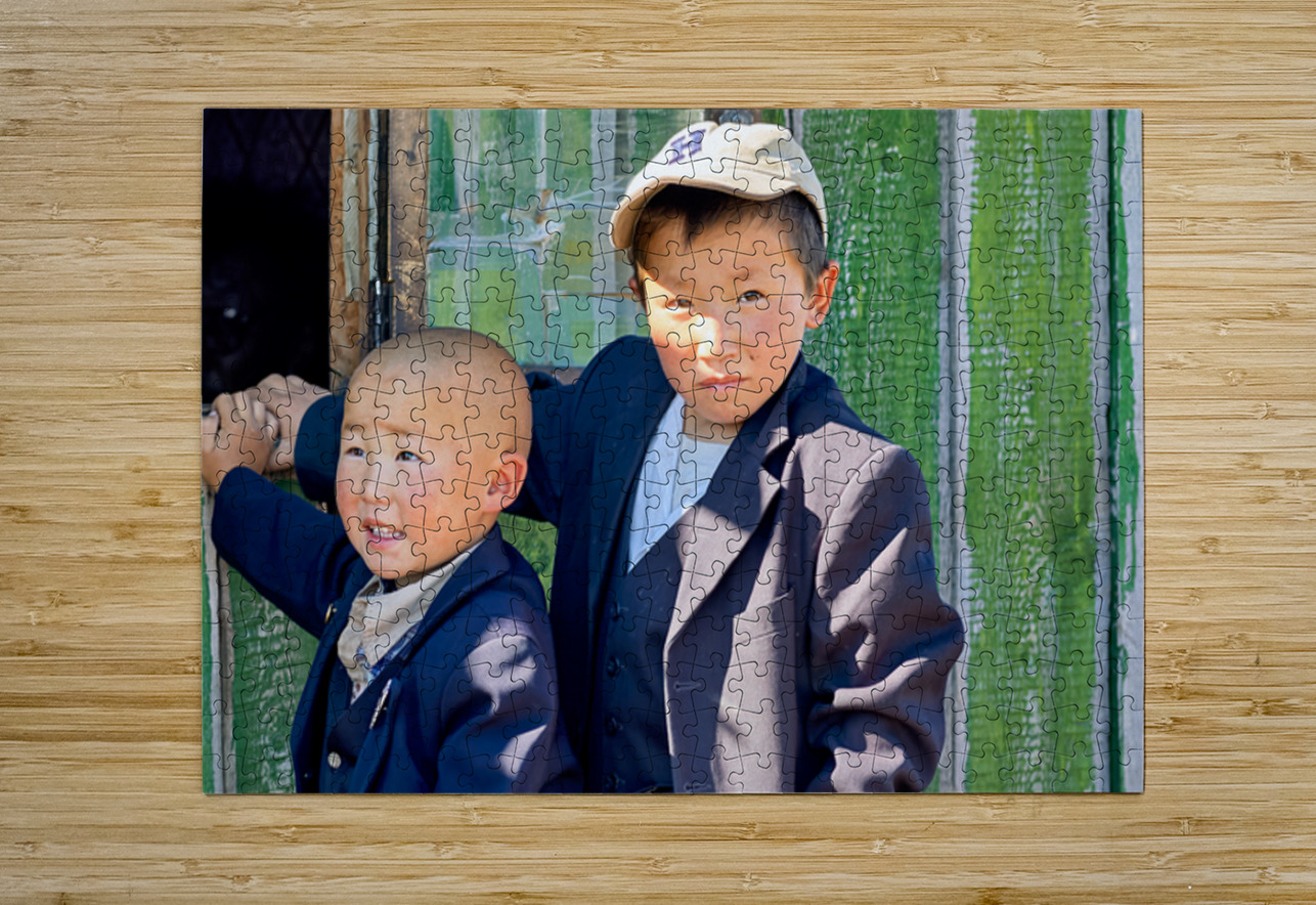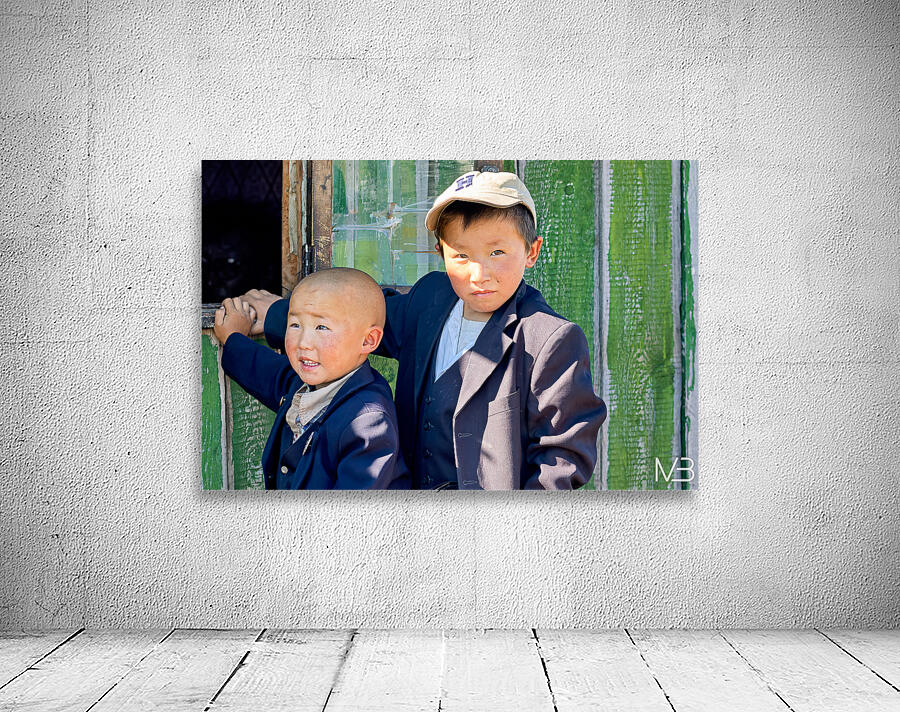 Two boys in Mongolia are standing near a green wooden door. They are dressed in formal attire. The younger boy is smiling broadly.