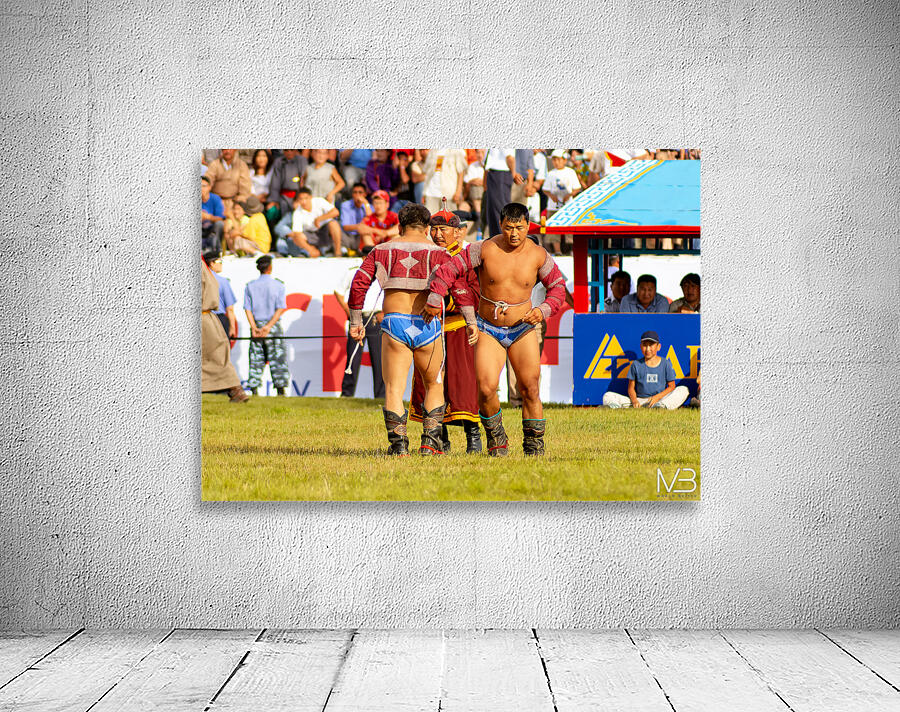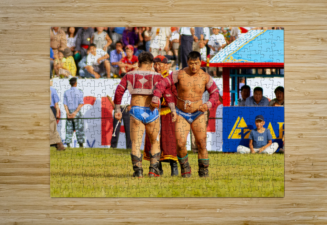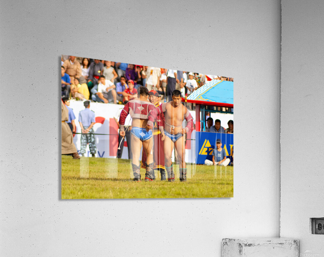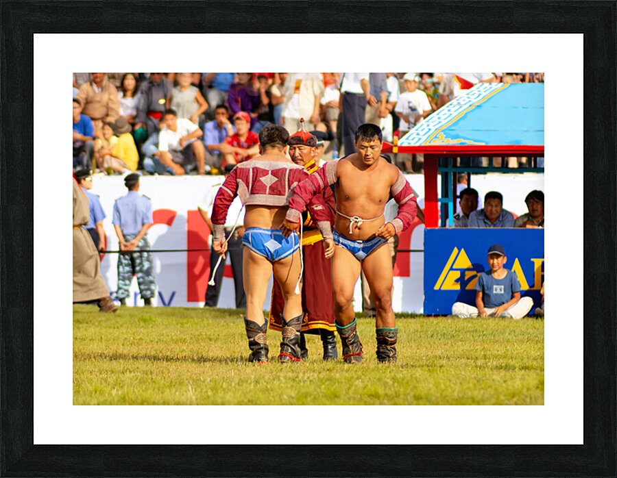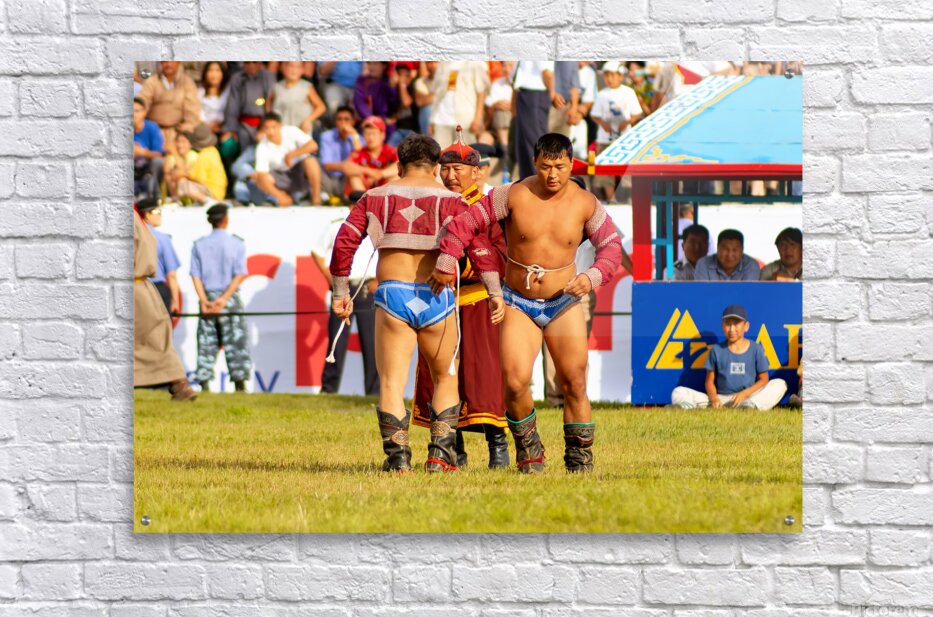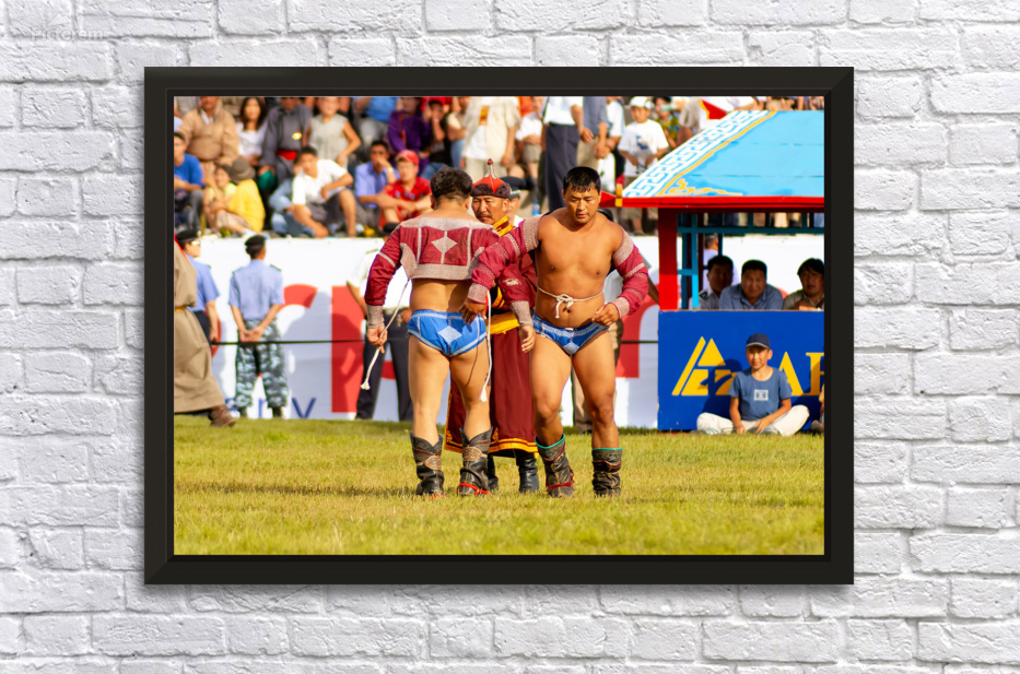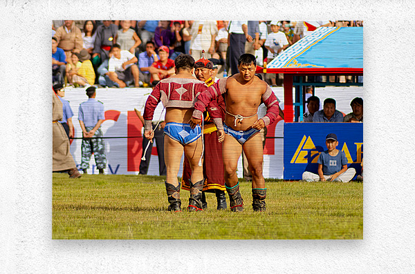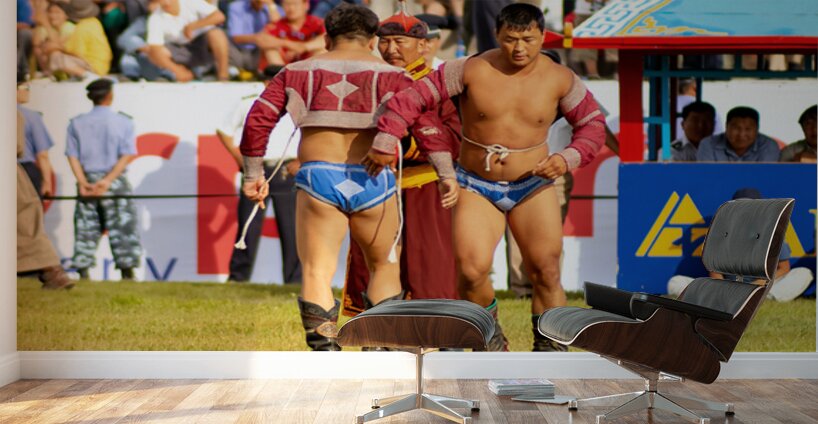 Two wrestlers compete during the Naadam festival in Ulaanbaatar. The event showcases traditional Mongolian wrestling skills and culture.
