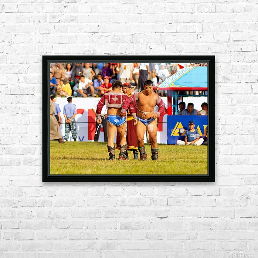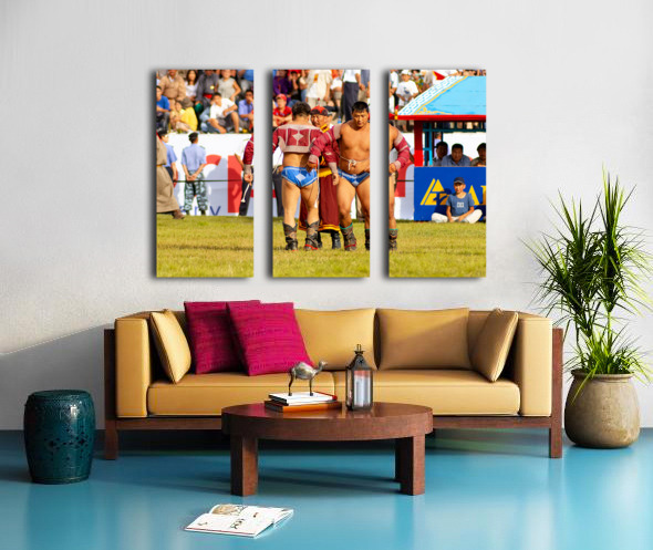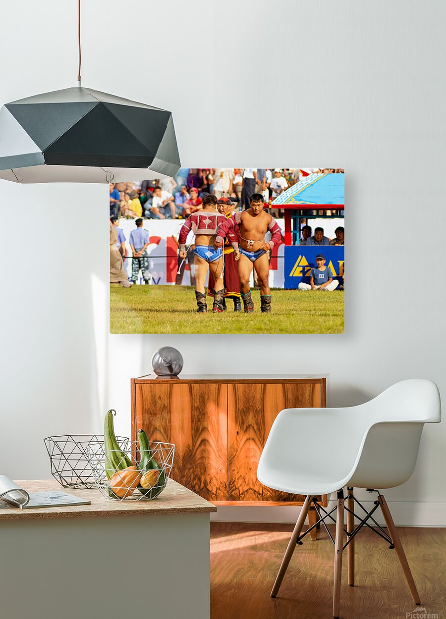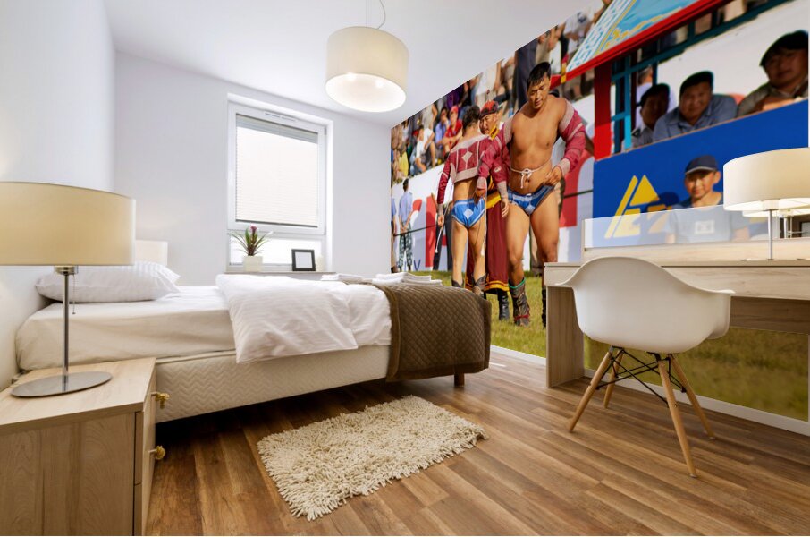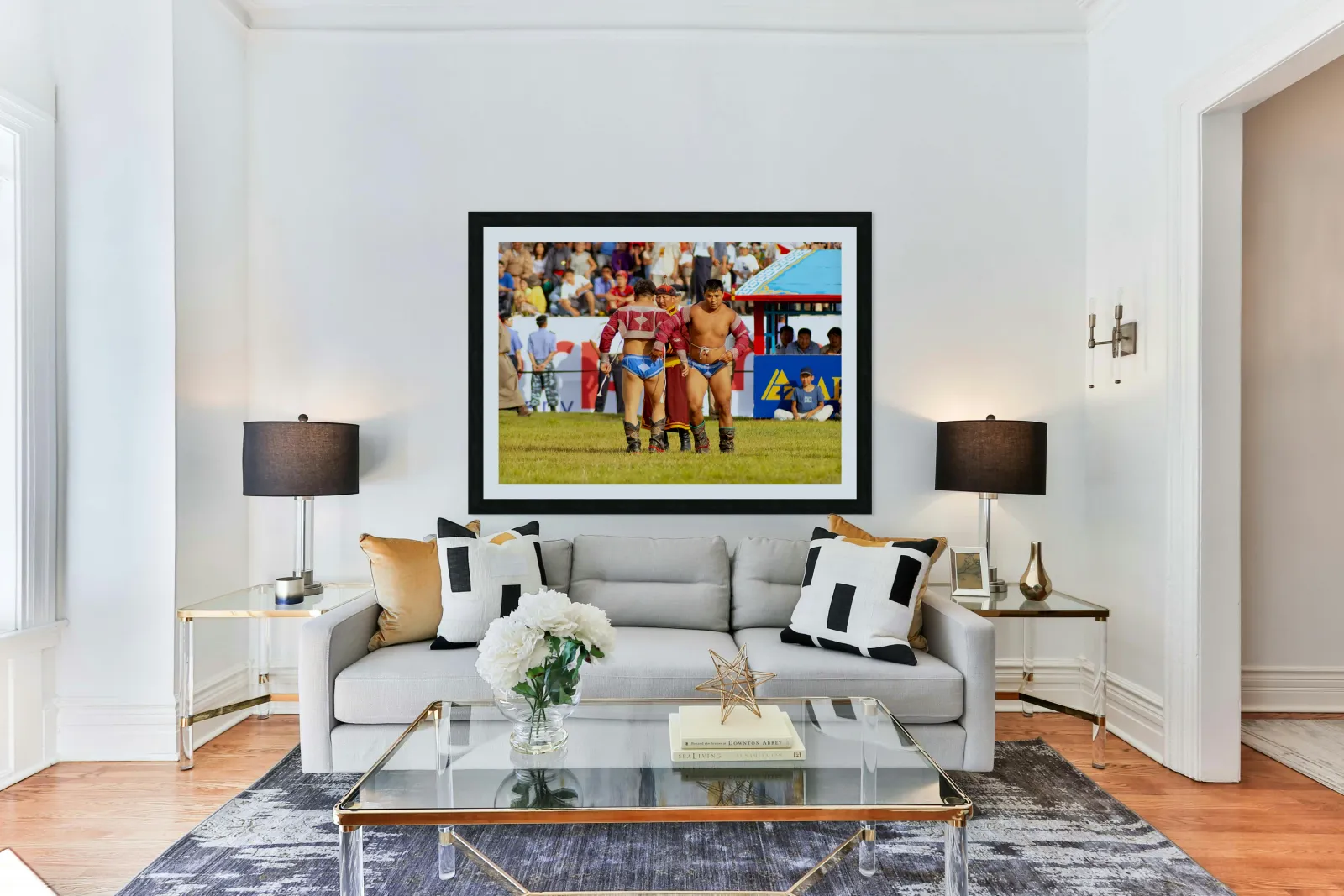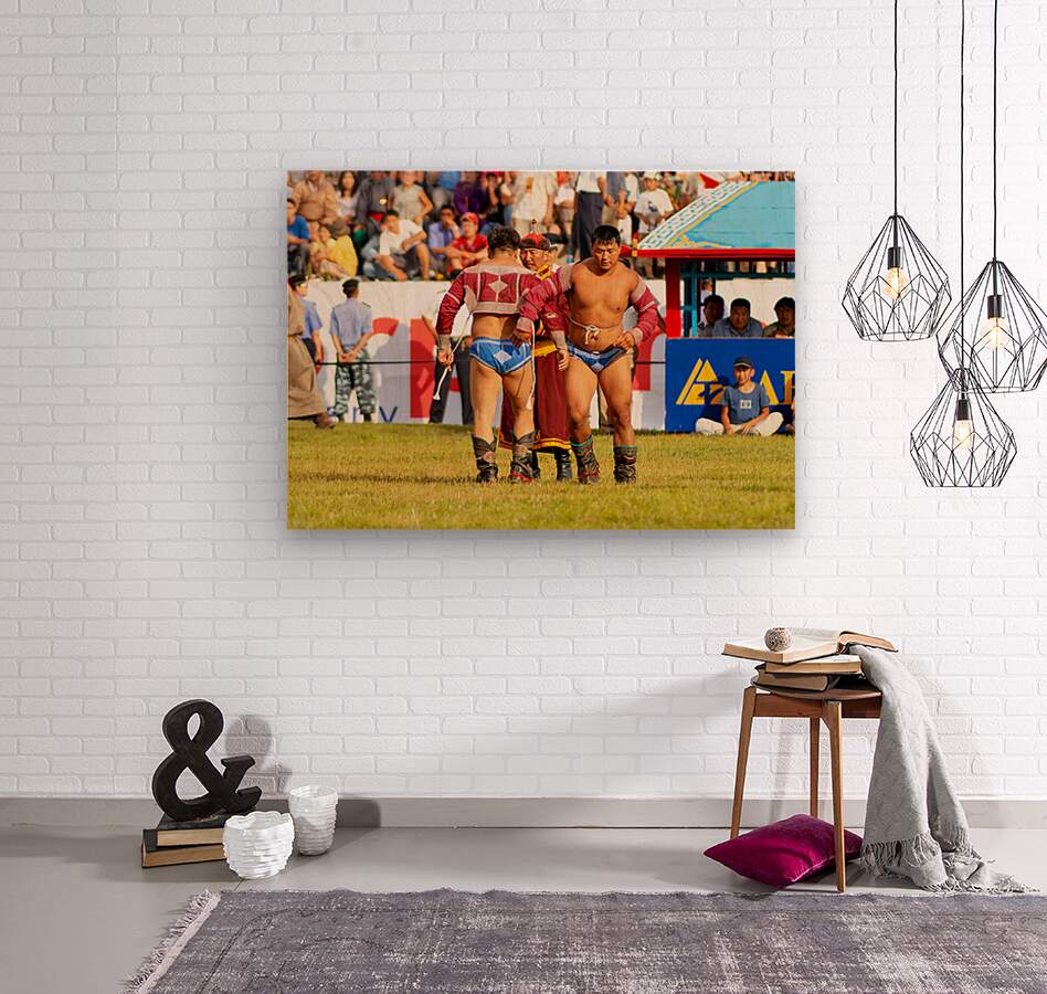 Two wrestlers compete during the Naadam festival in Ulaanbaatar. The event showcases traditional Mongolian wrestling skills and culture.