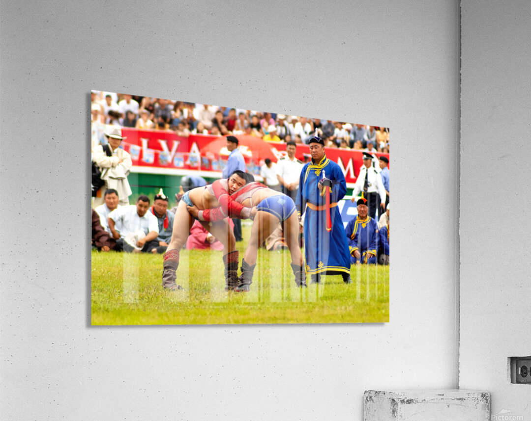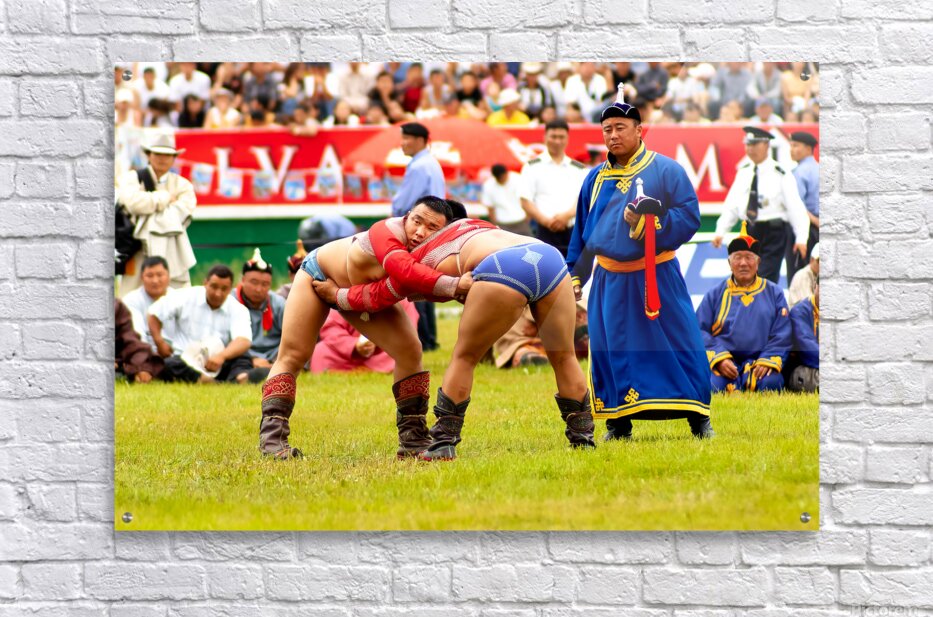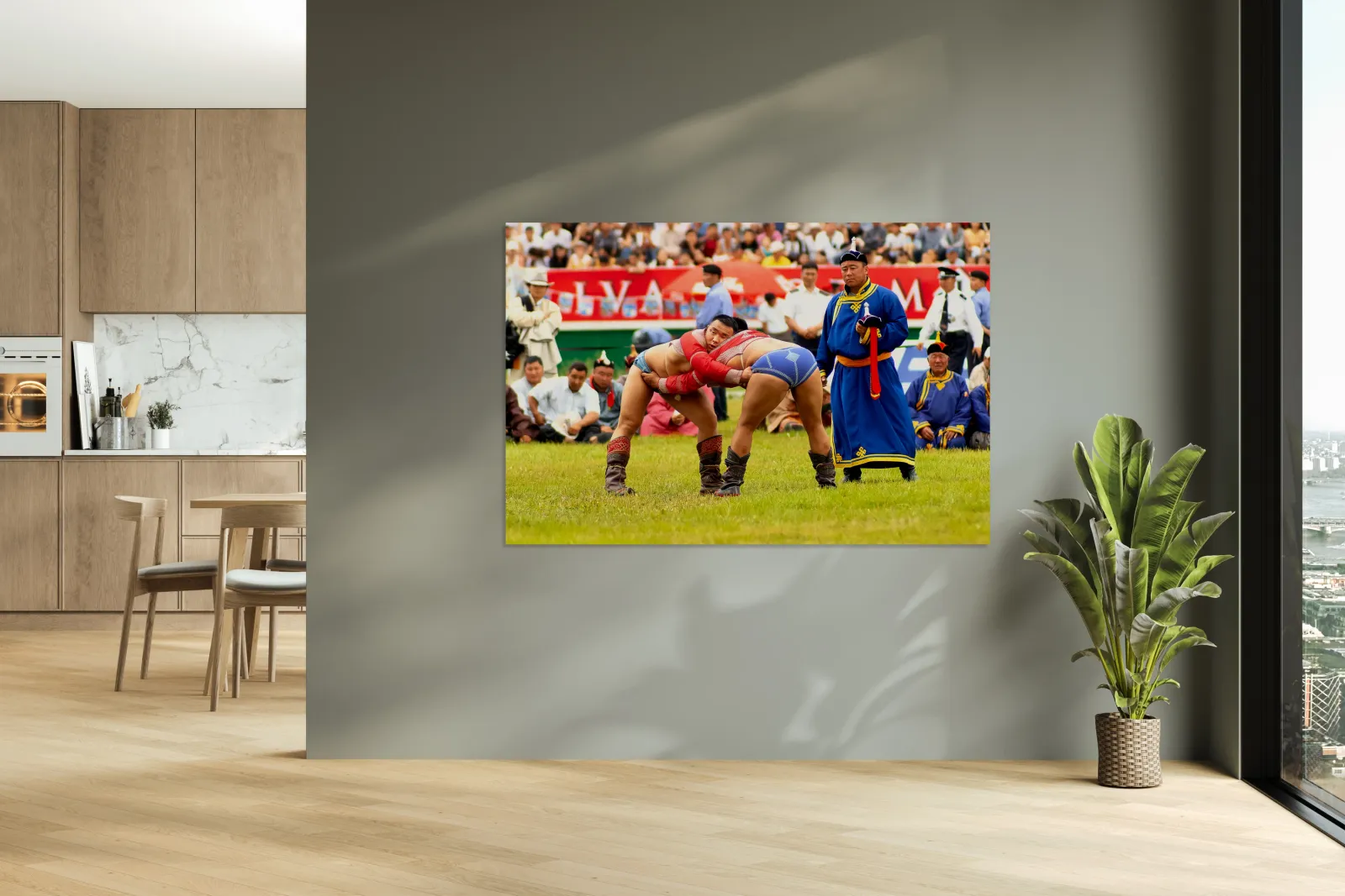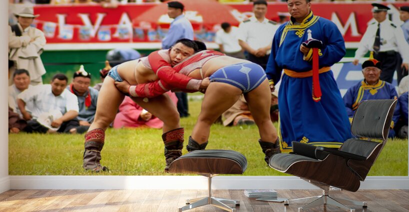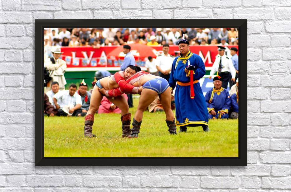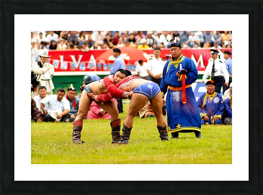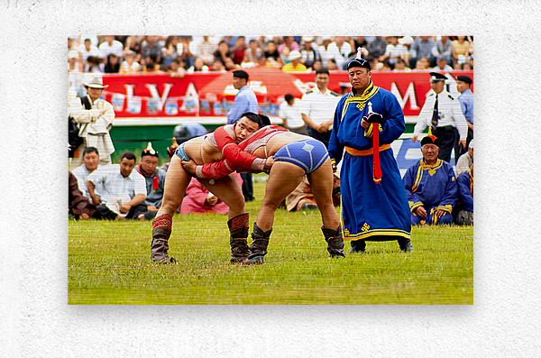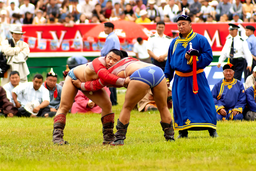 Wrestlers compete during the Naadam festival in Ulaanbaatar Mongolia. Many spectators watch the traditional sport on a sunny day.