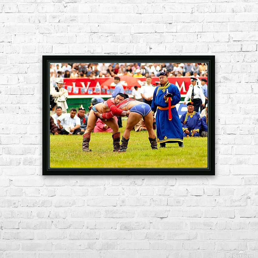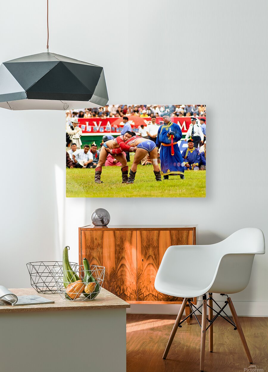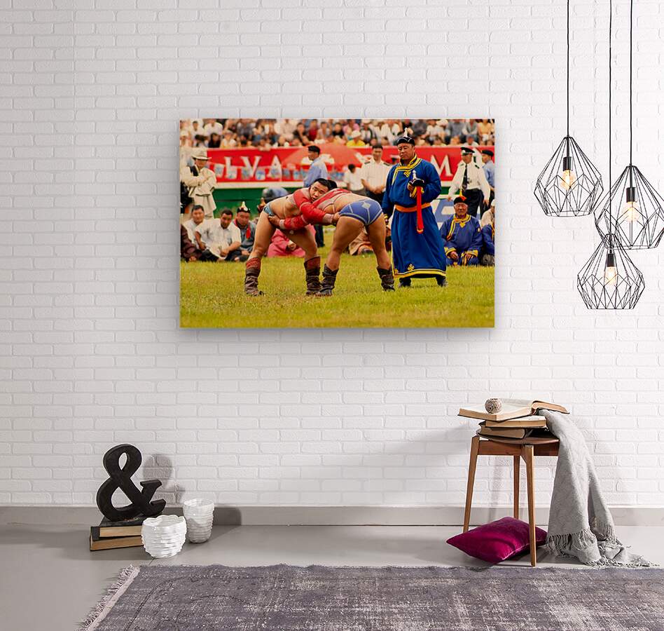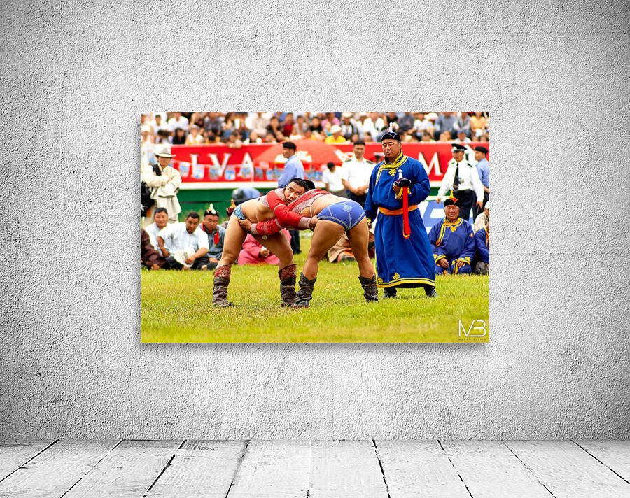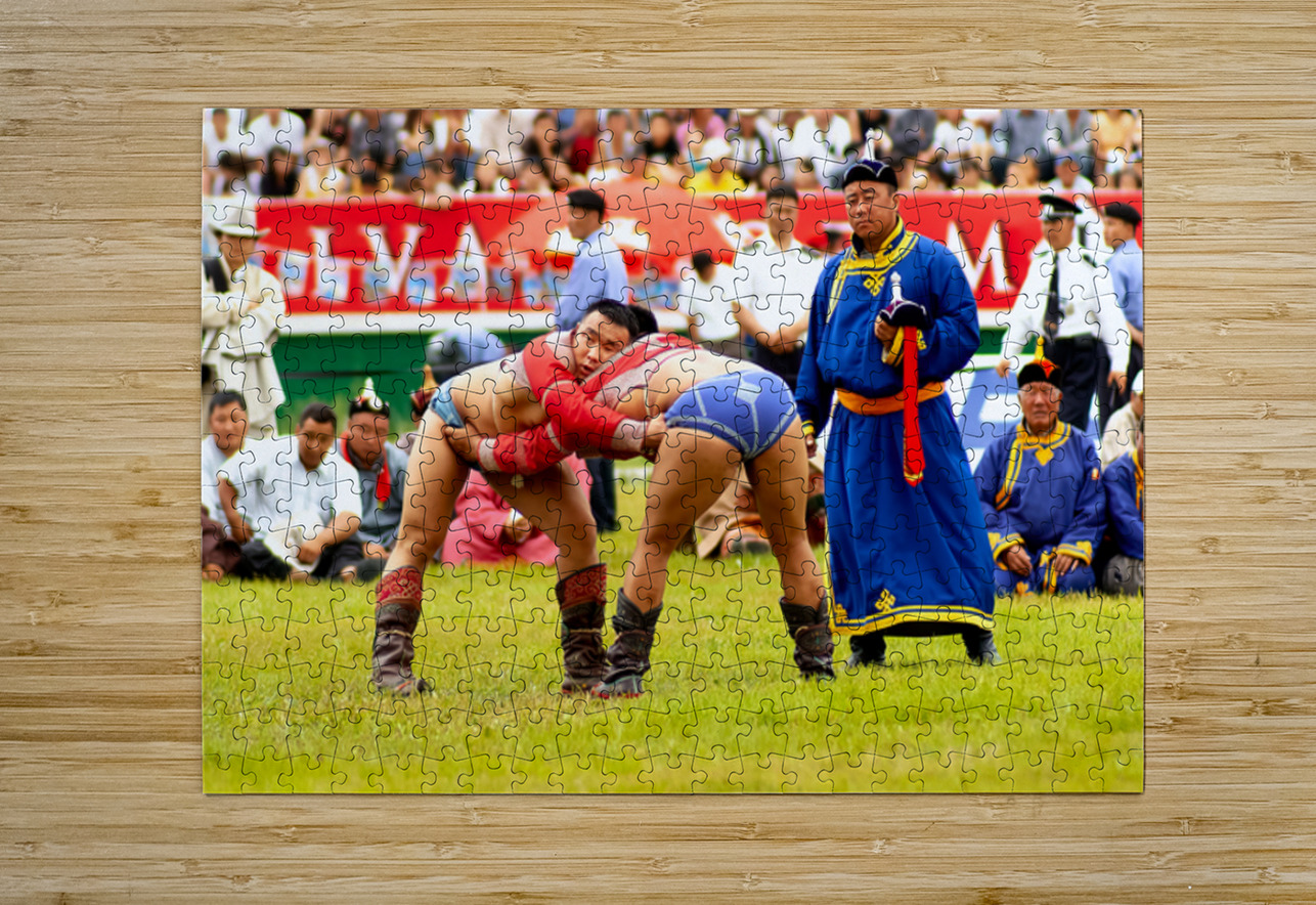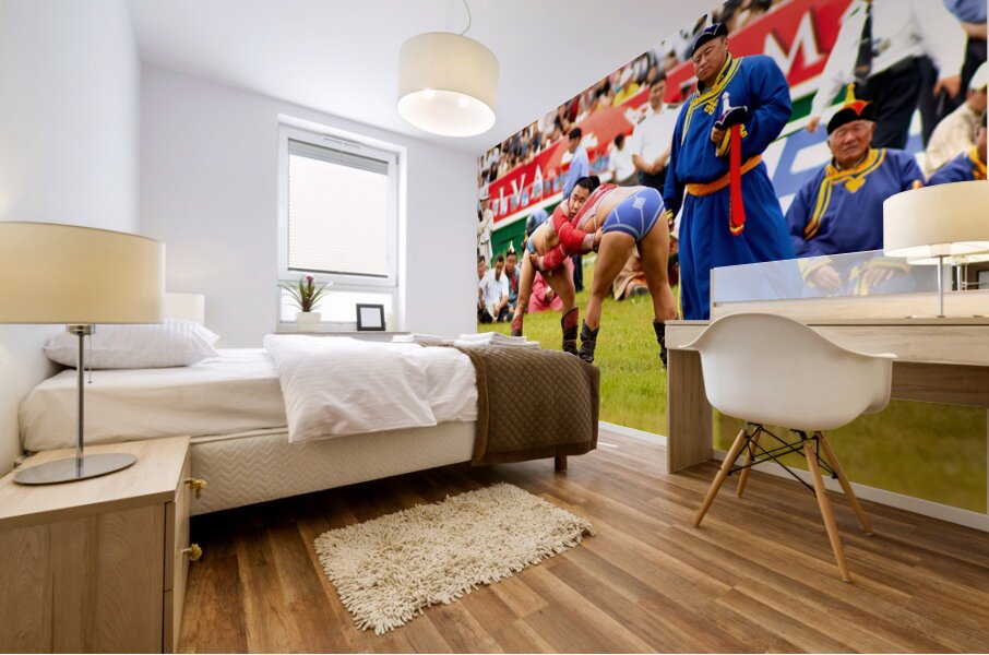 Wrestlers compete during the Naadam festival in Ulaanbaatar Mongolia. Many spectators watch the traditional sport on a sunny day.