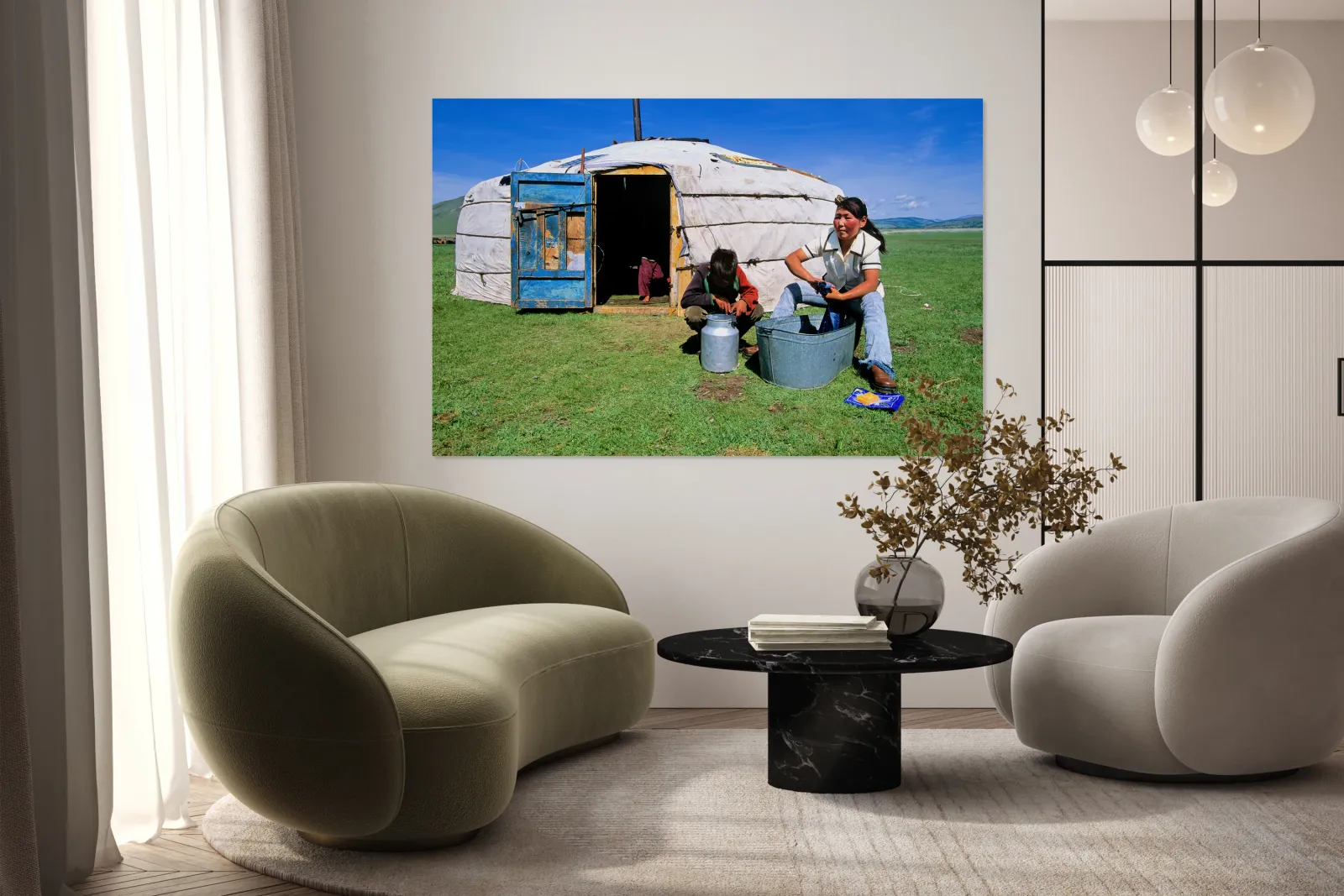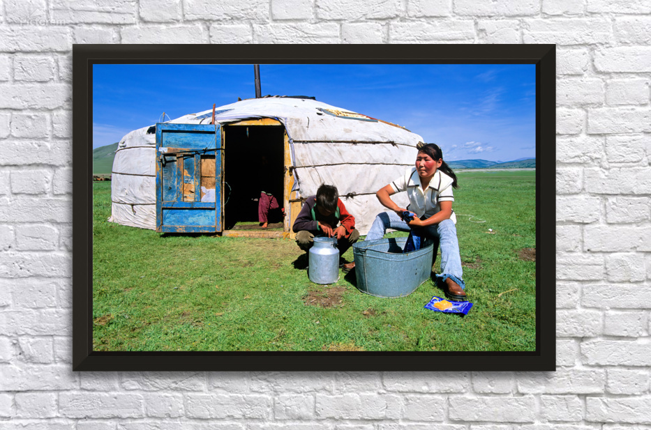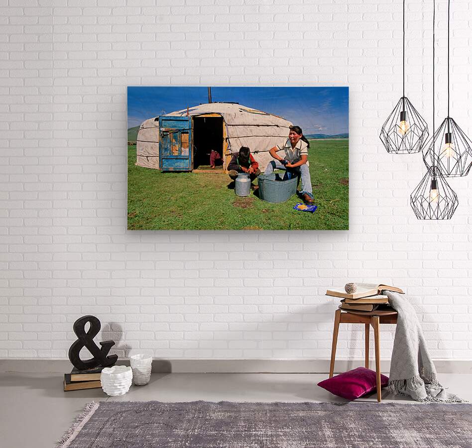 People are outside a ger in Mongolia engaged in daily tasks. The tent is typical for nomadic life in this region showing simple living.