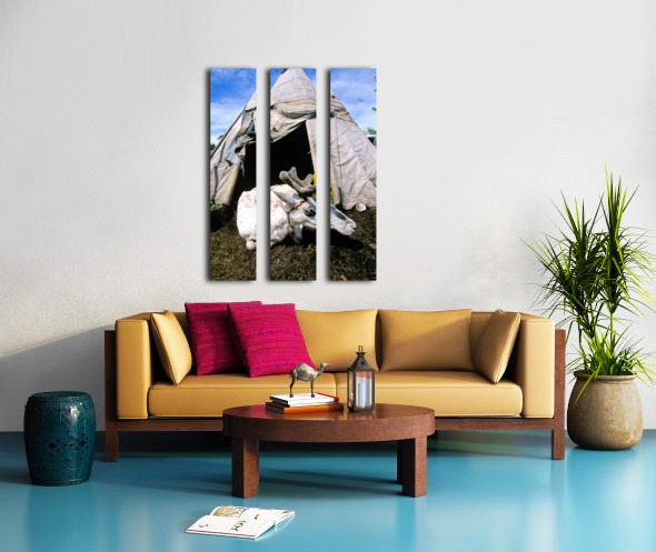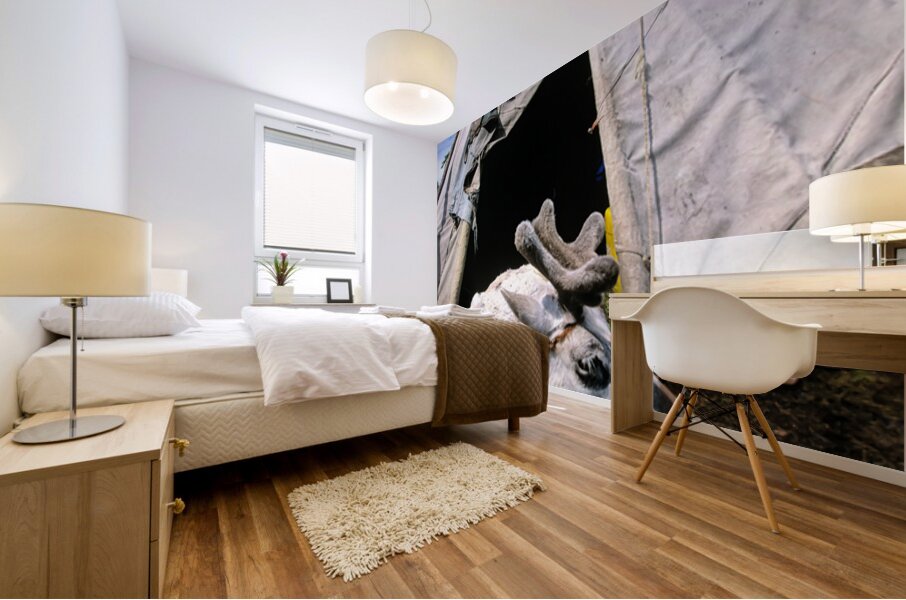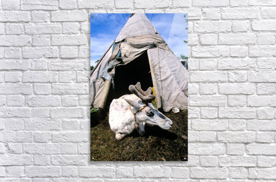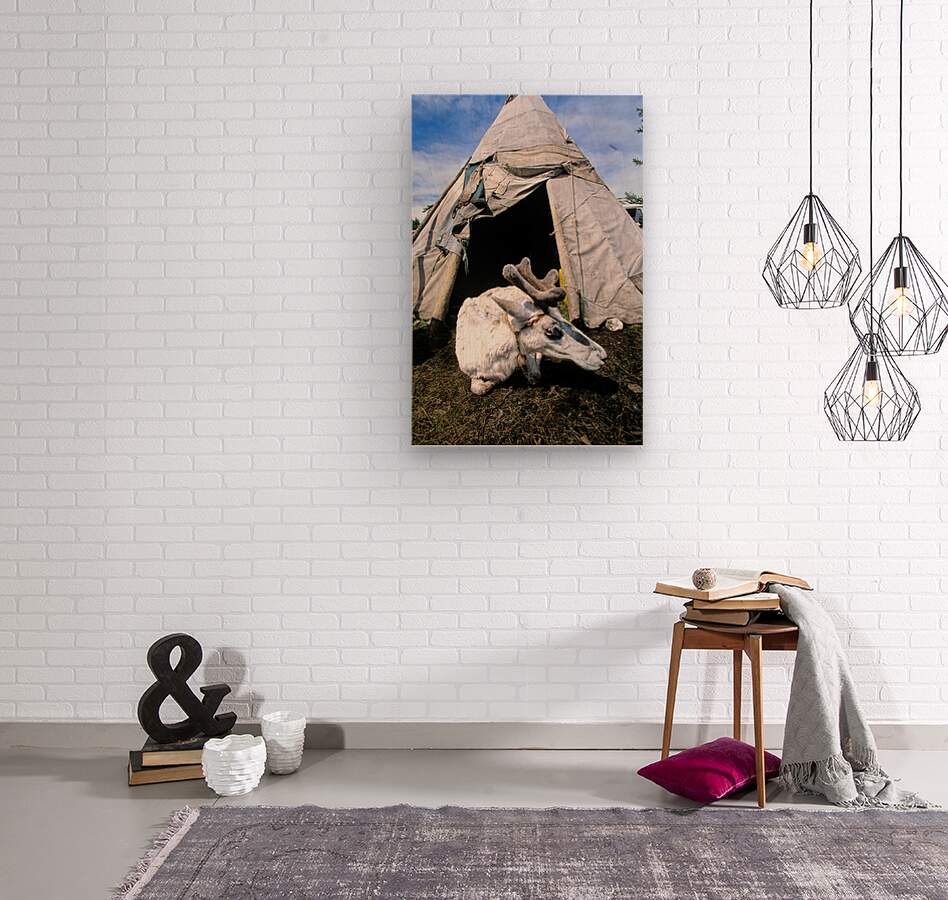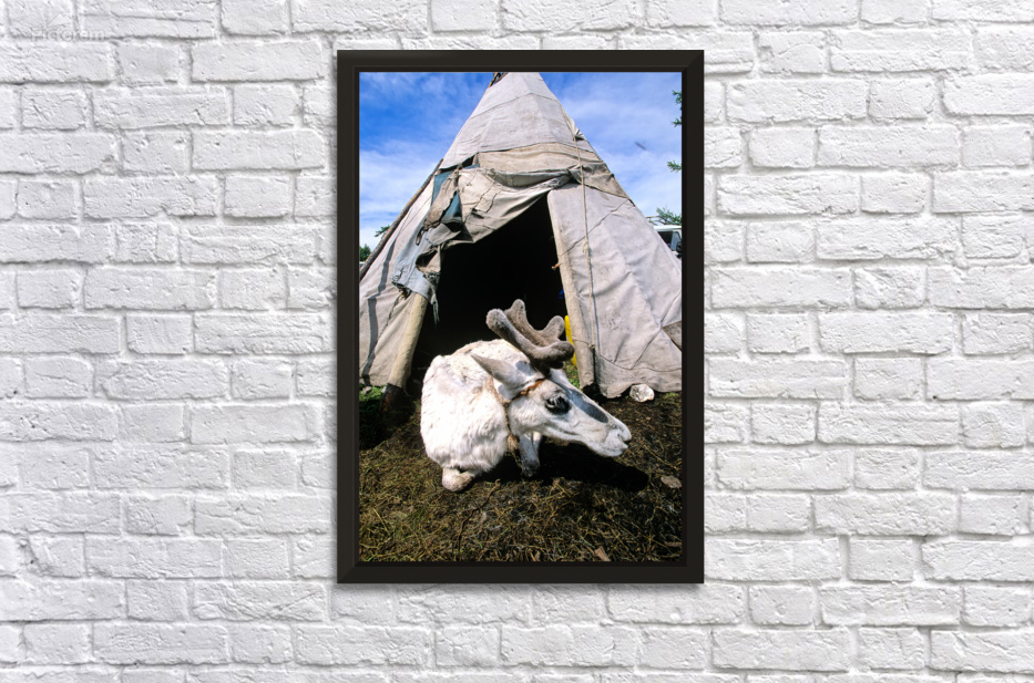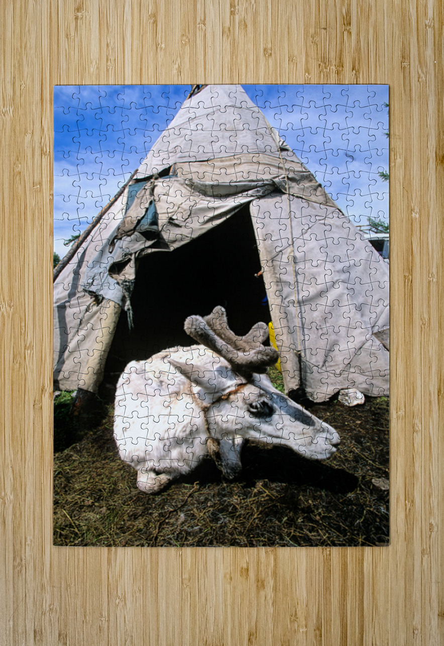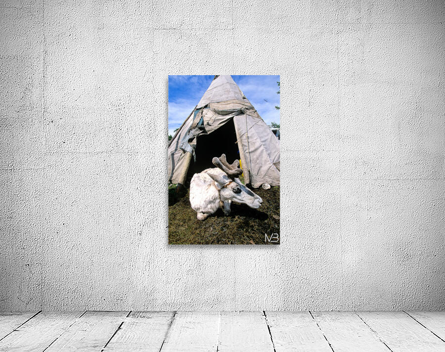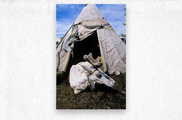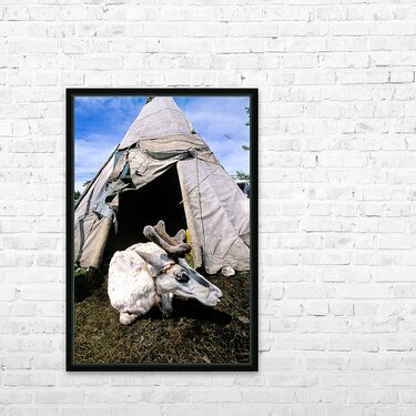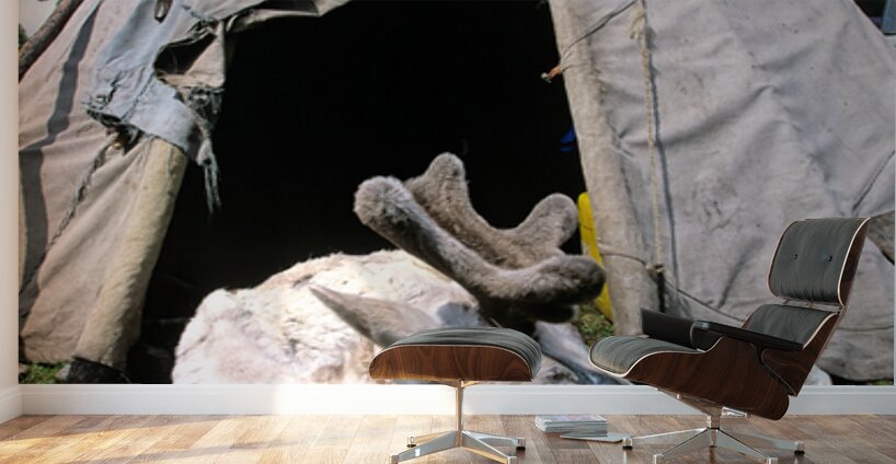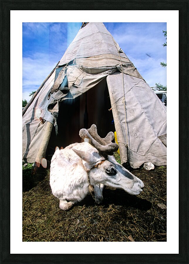 A reindeer rests near a tent used by the Dukha Tsaatan in northern Mongolia. The scene shows the natural habitat of these herders.