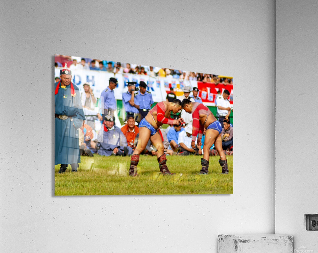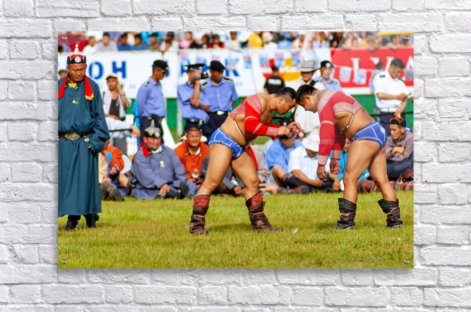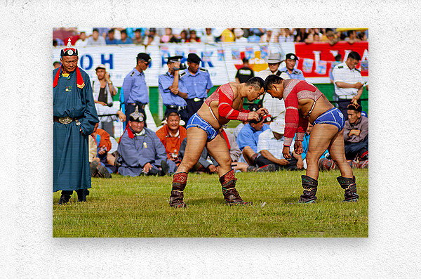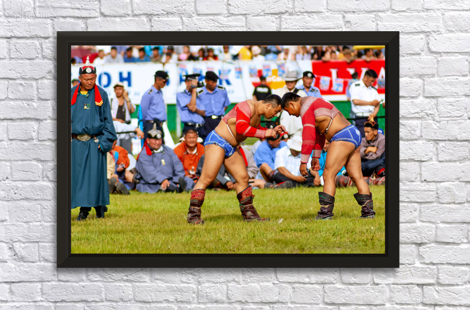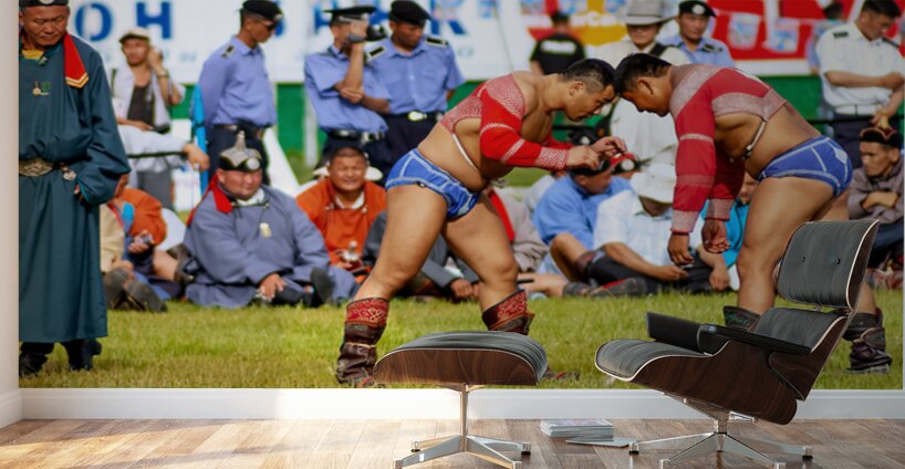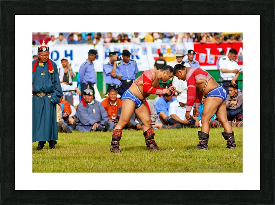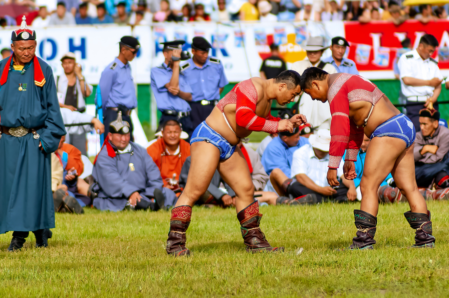 Two wrestlers compete at the Naadam festival in Ulaanbaatar Mongolia. Crowds gather to watch this traditional sport during the event.