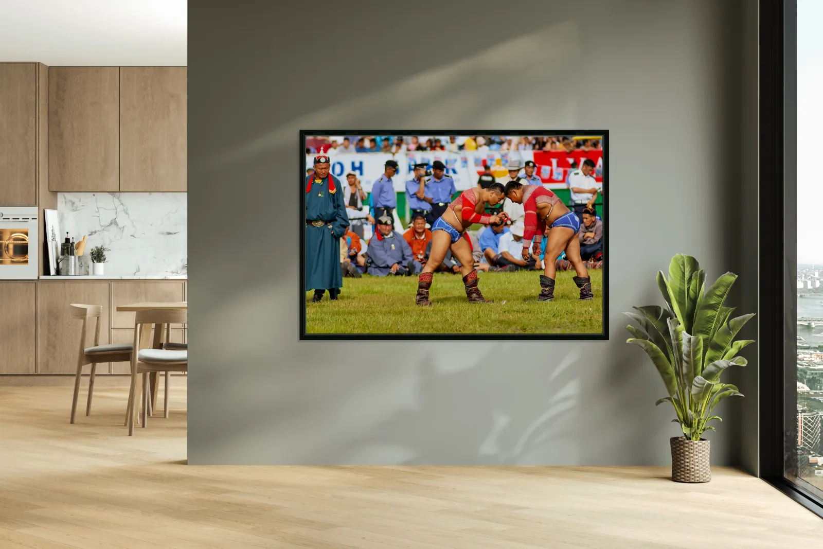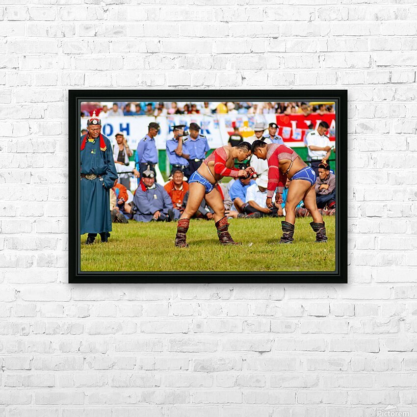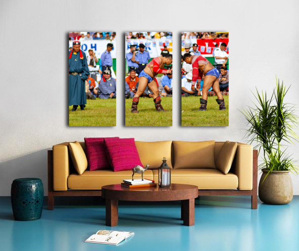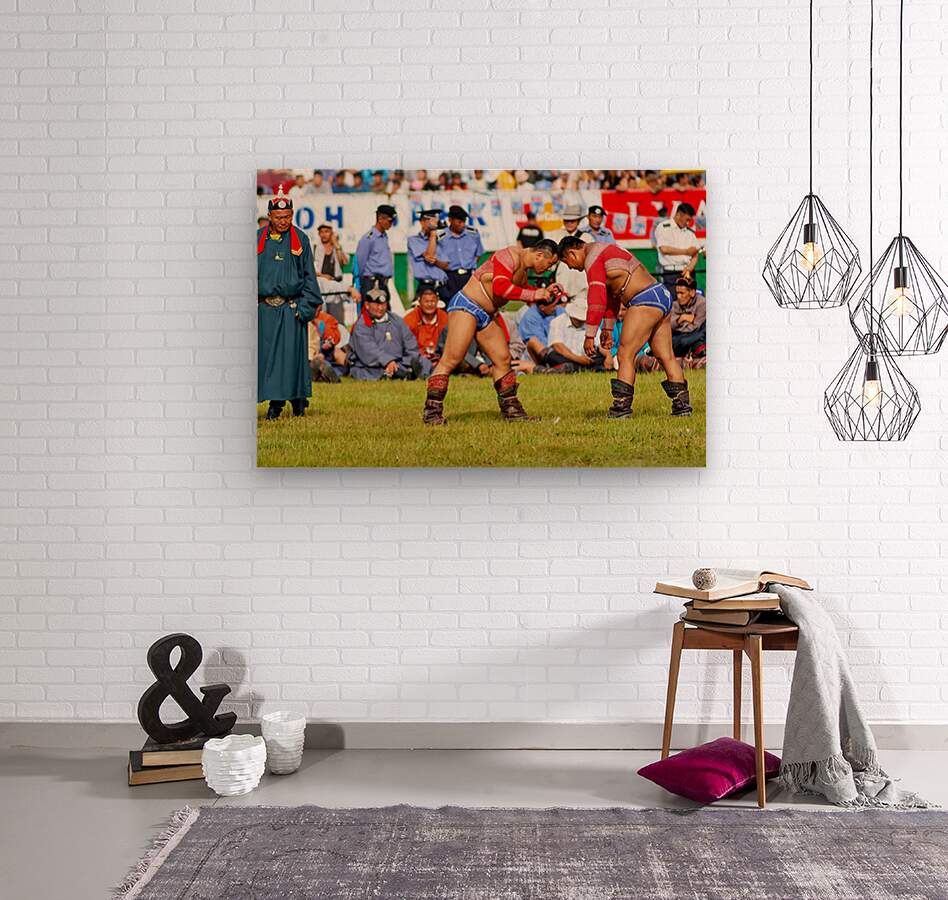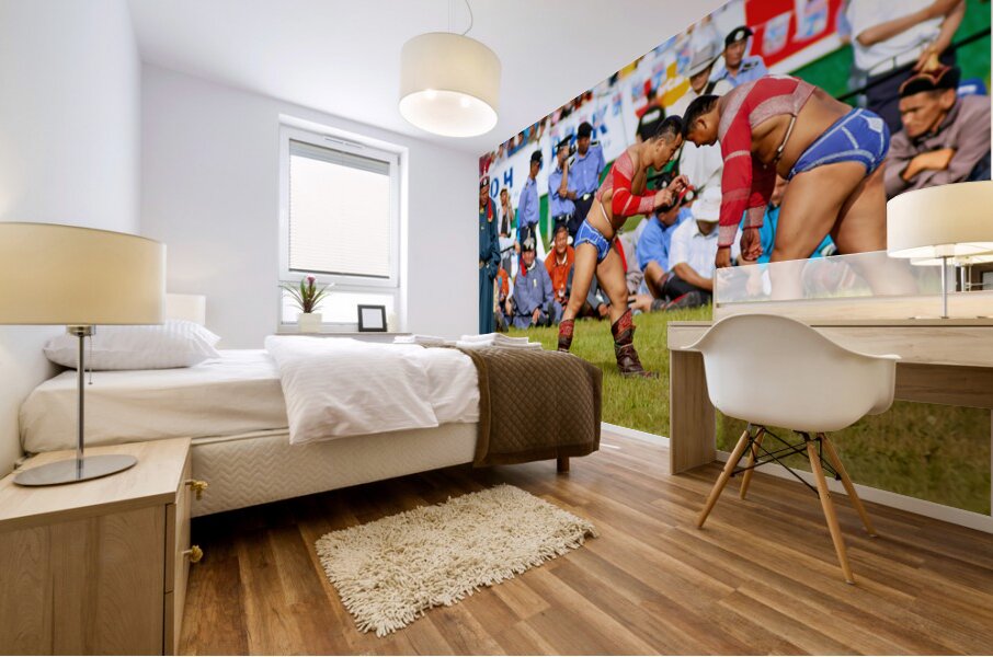 Two wrestlers compete at the Naadam festival in Ulaanbaatar Mongolia. Crowds gather to watch this traditional sport during the event.