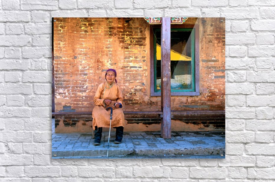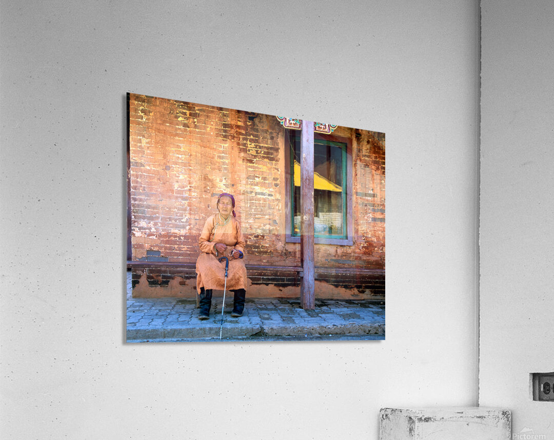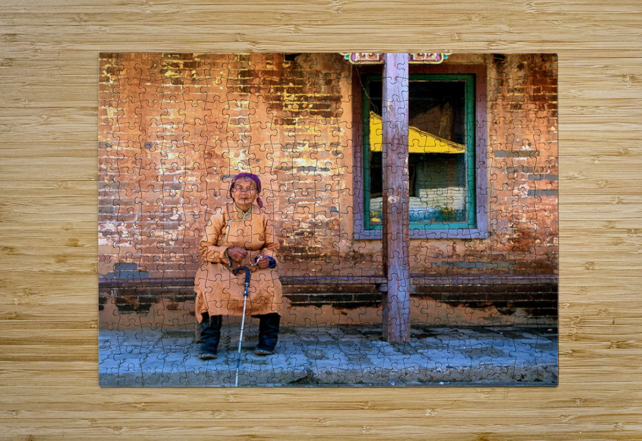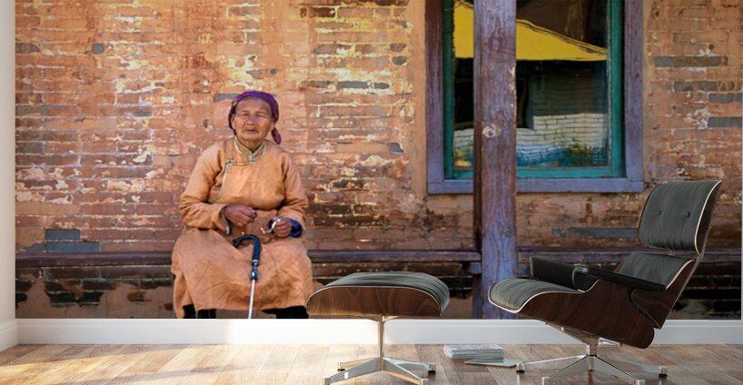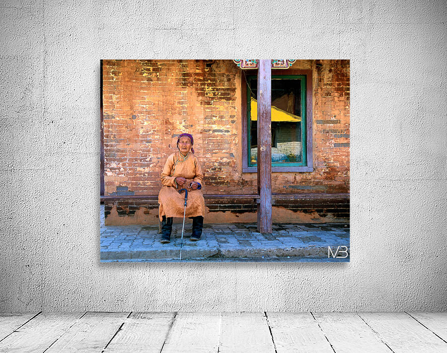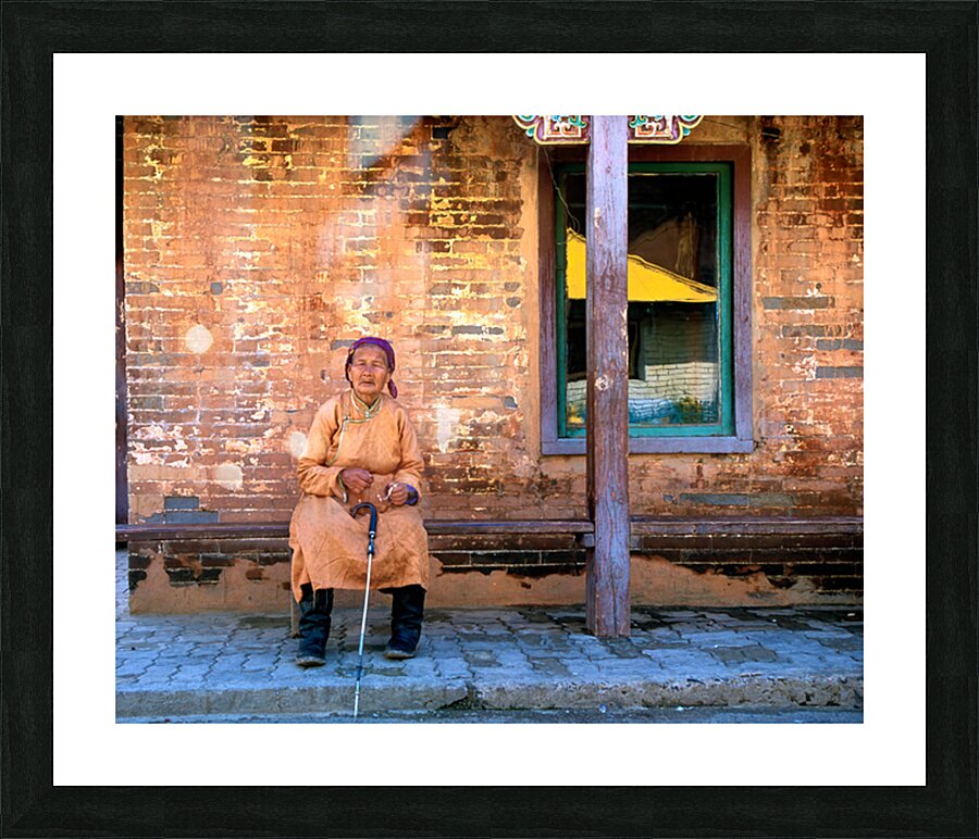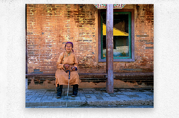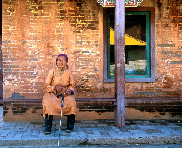 An old woman rests outside Gandantegchinlen Monastery in Ulaanbaatar. She holds a cane and sits near a colorful window.