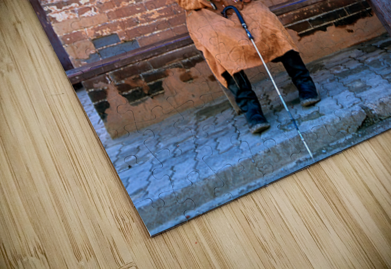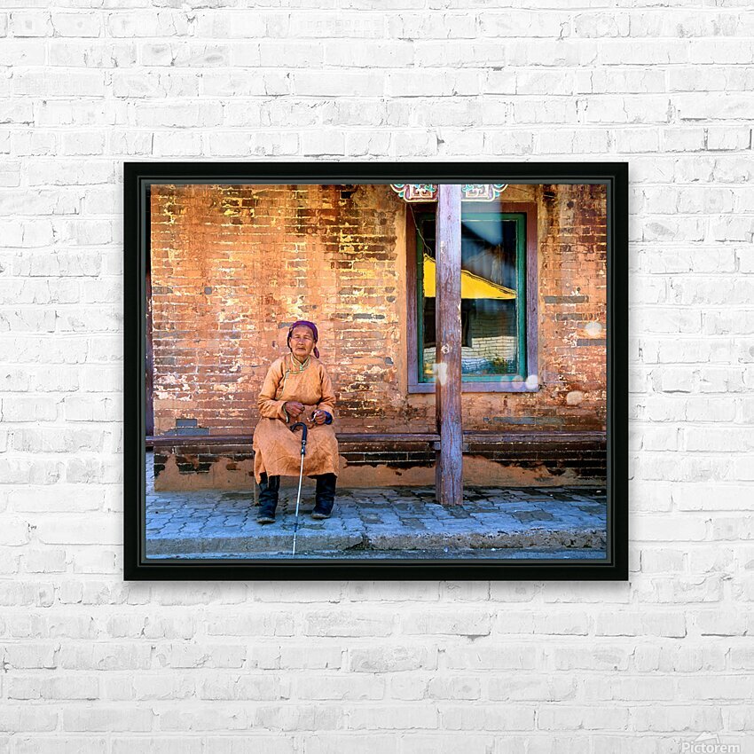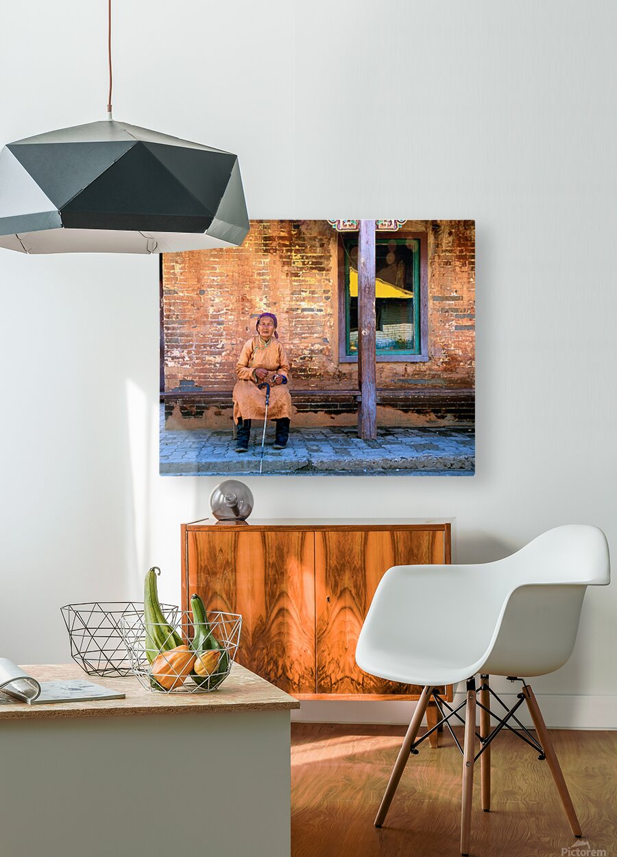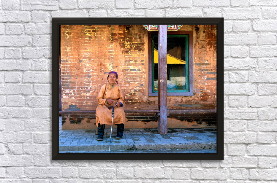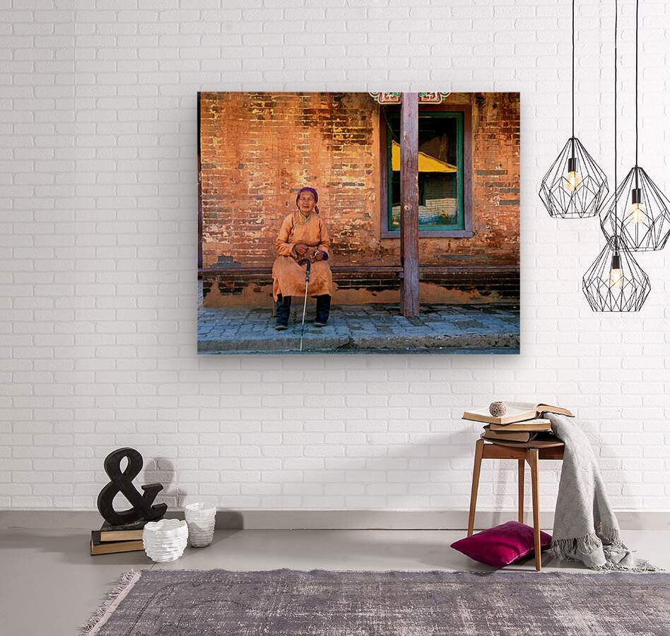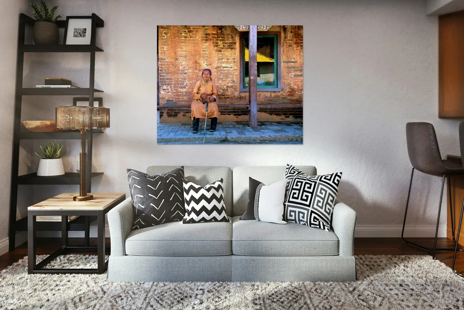 An old woman rests outside Gandantegchinlen Monastery in Ulaanbaatar. She holds a cane and sits near a colorful window.