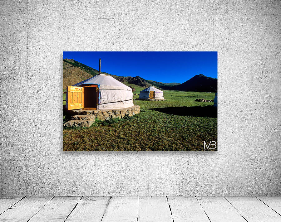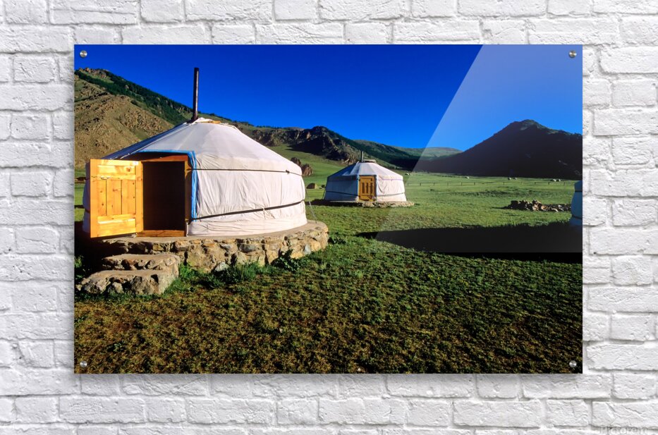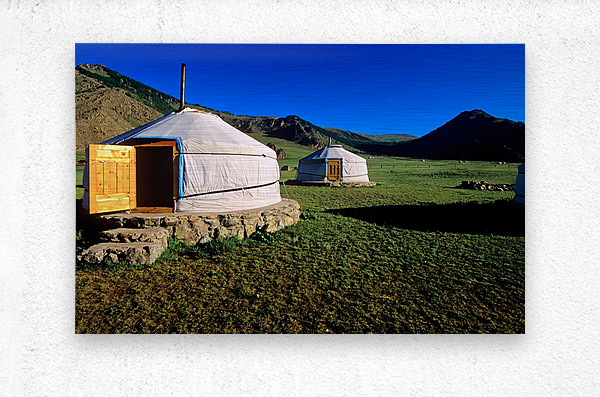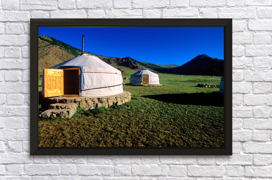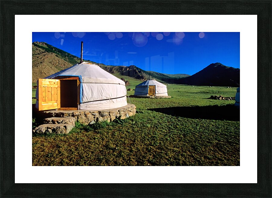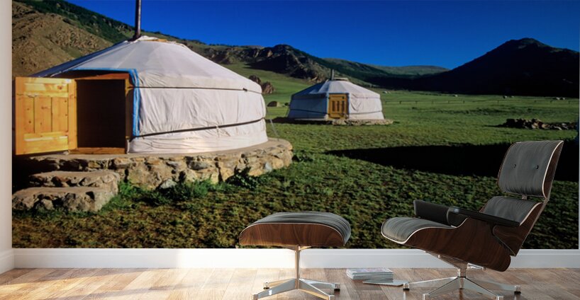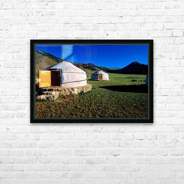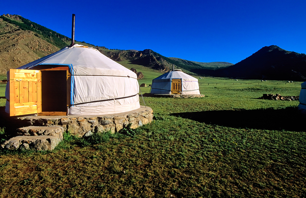 Nomadic ger tents stand on the grassland in Mongolia. Mountains rise in the background under a clear blue sky during daytime.