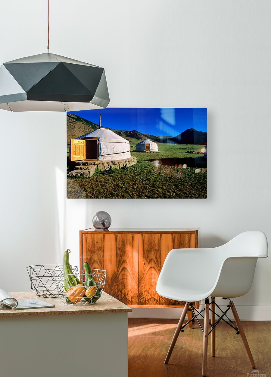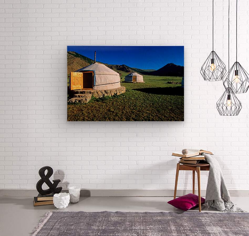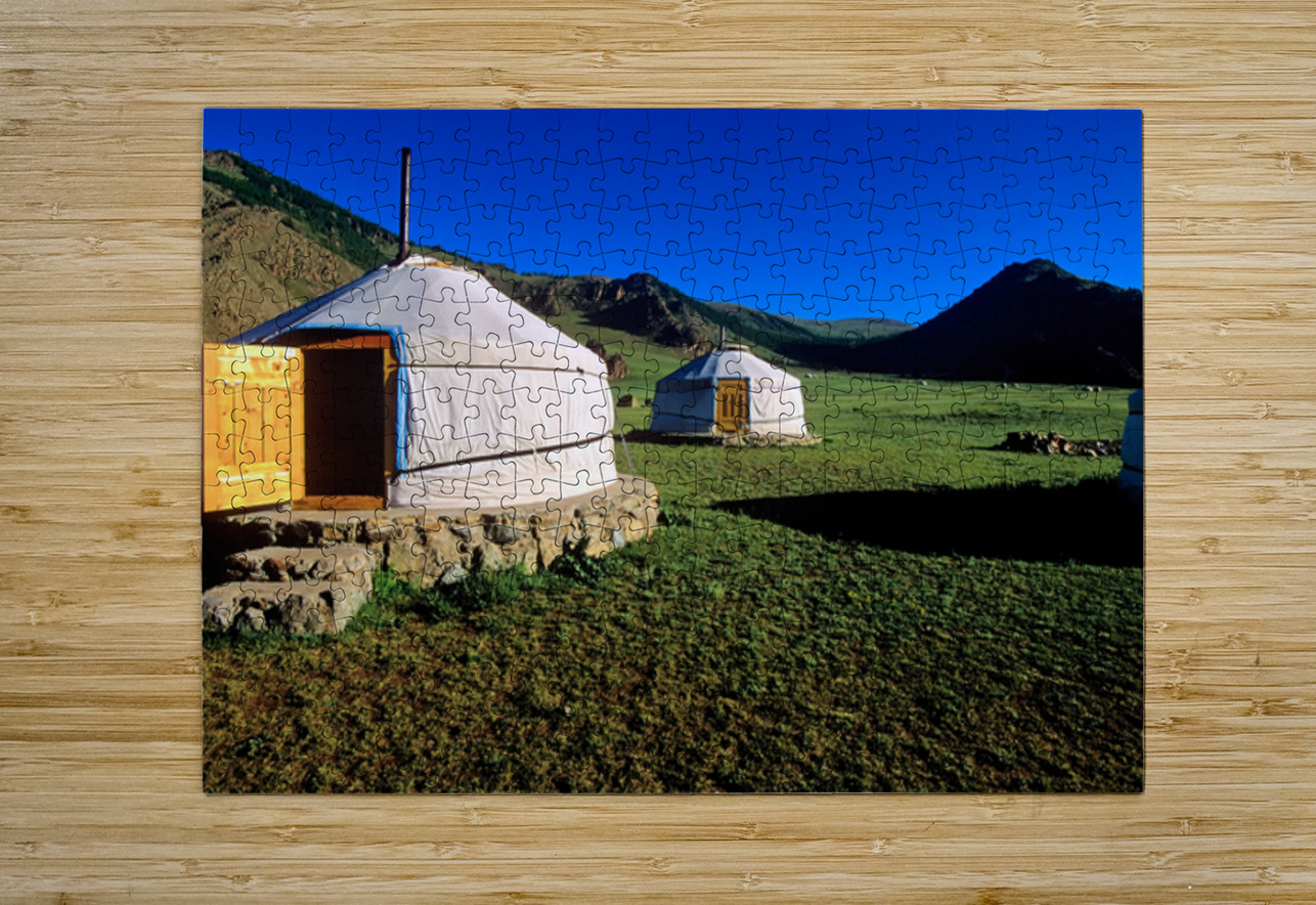Nomadic ger tents stand on the grassland in Mongolia. Mountains rise in the background under a clear blue sky during daytime.