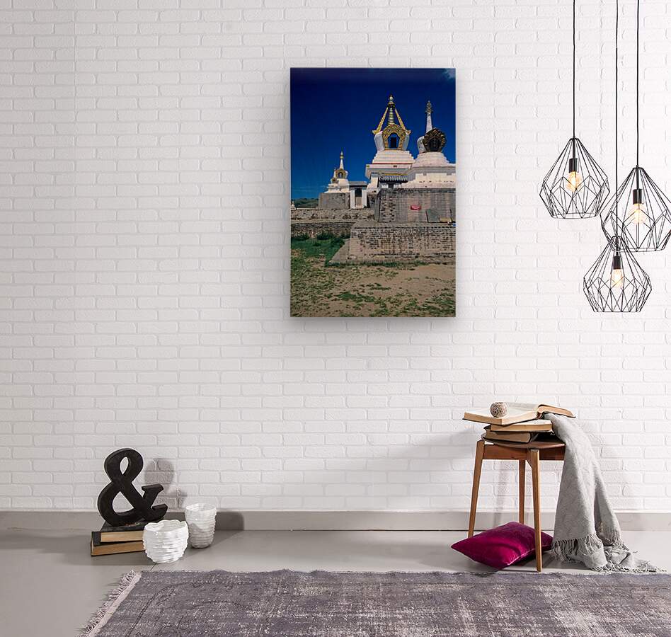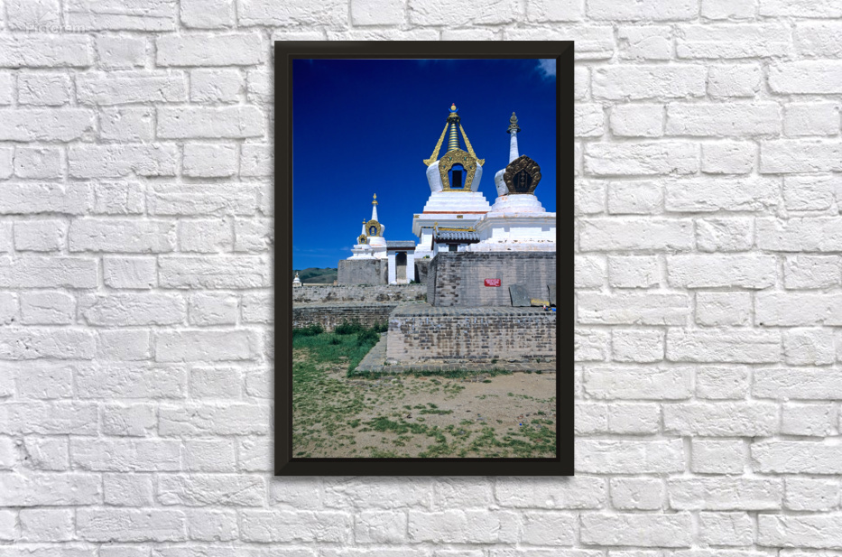 Visitors explore the Erdene Zuu Monastery in Mongolia. The ancient site showcases unique architecture and cultural heritage under a clear sky.