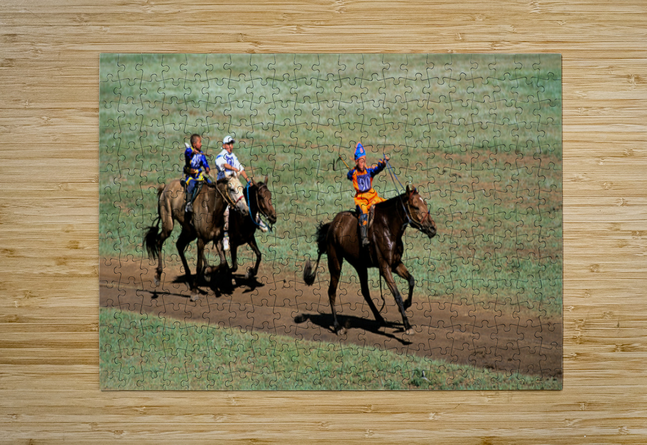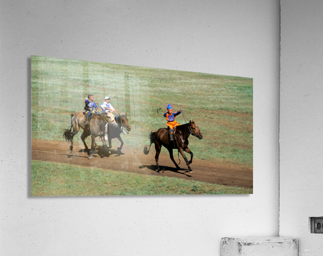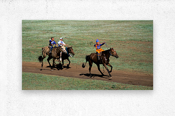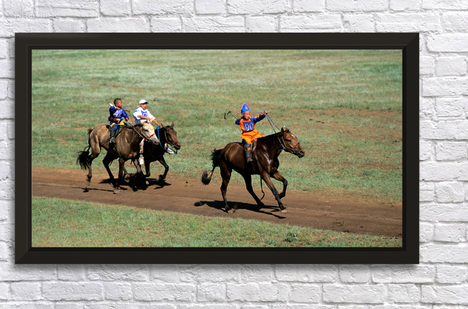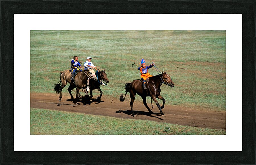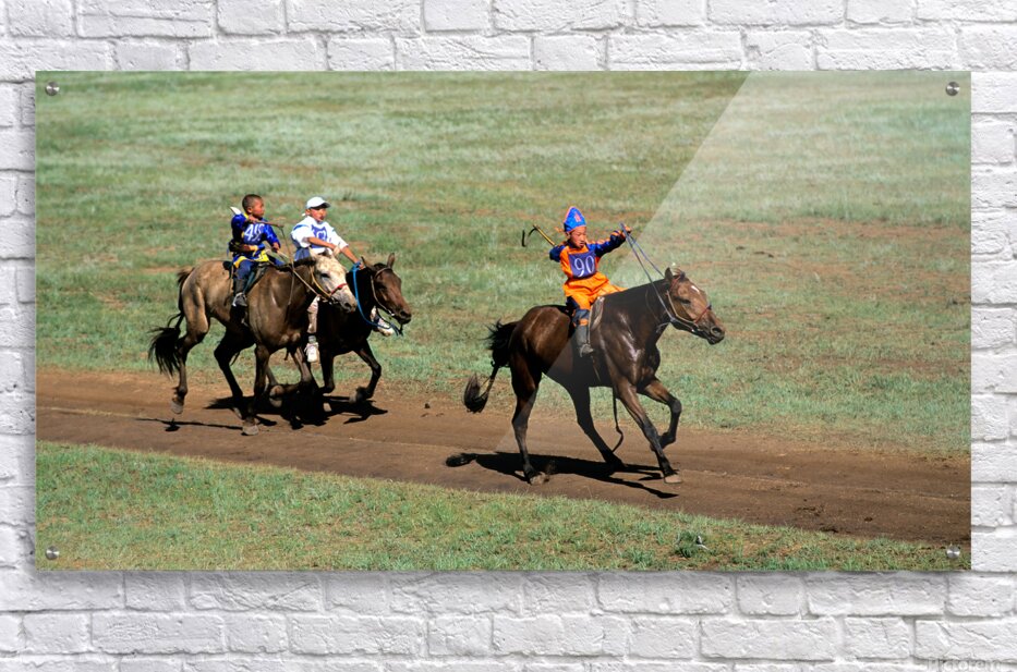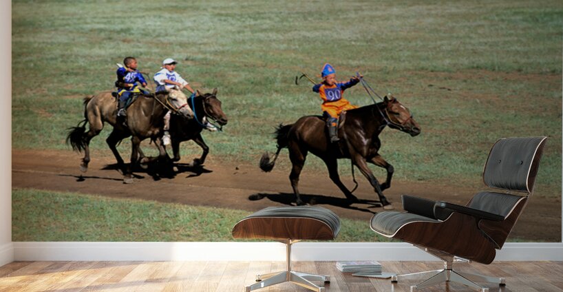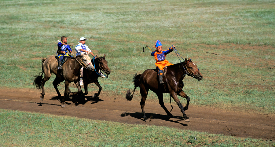 Children compete in a horse race during the Naadam festival in Ulaanbaatar. The event showcases tradition and skill in a lively atmosphere.
