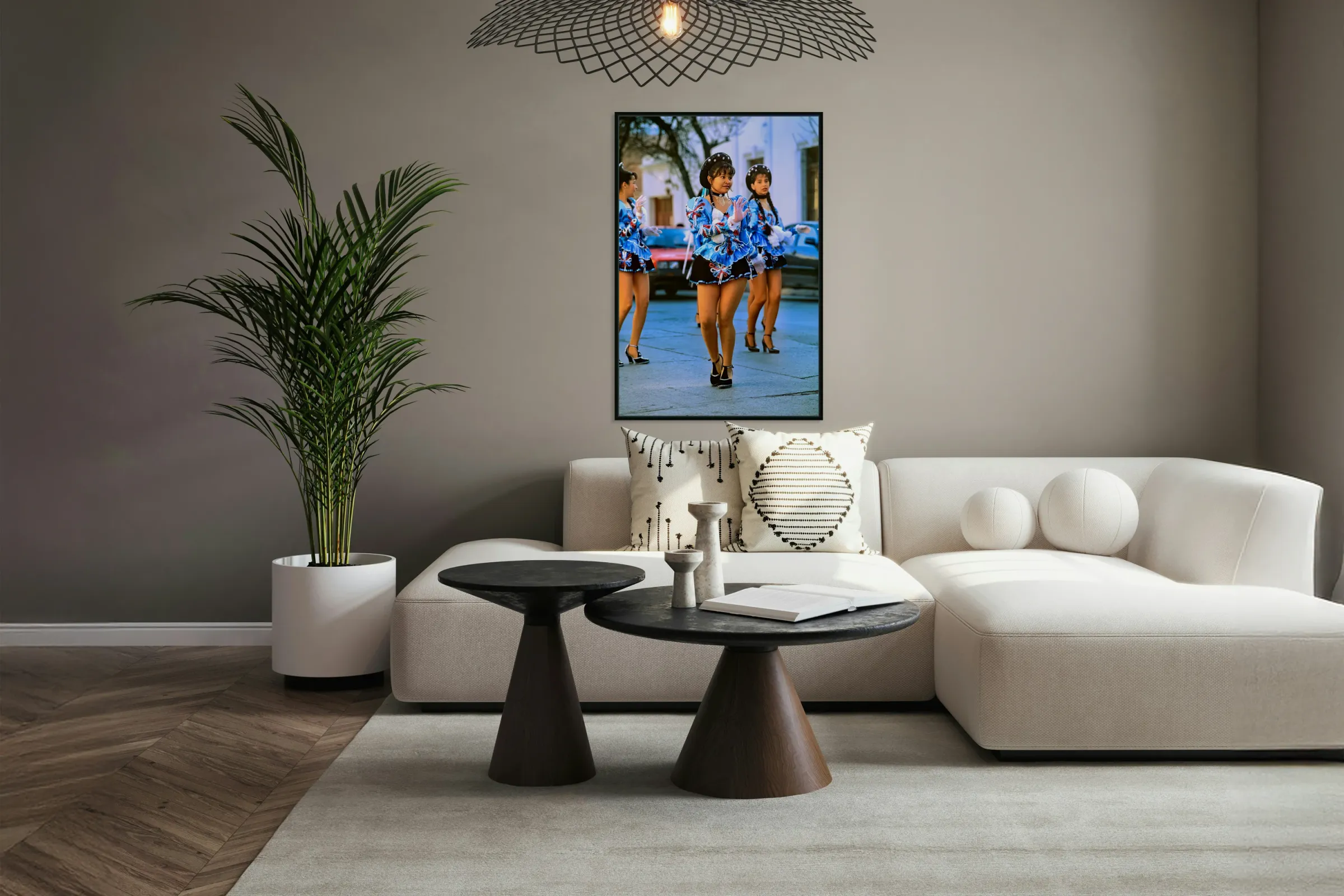 Dancers in blue costumes perform during cultural festival in Arg Frame print