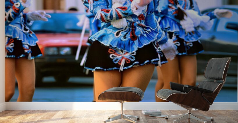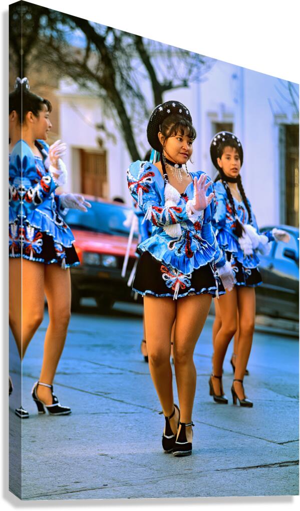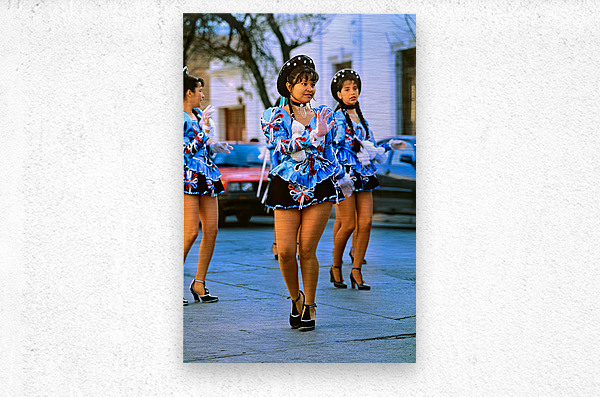 Female dancers perform in traditional Caporales costumes during a street parade in Argentina celebrating rich folkloric culture and heritage.