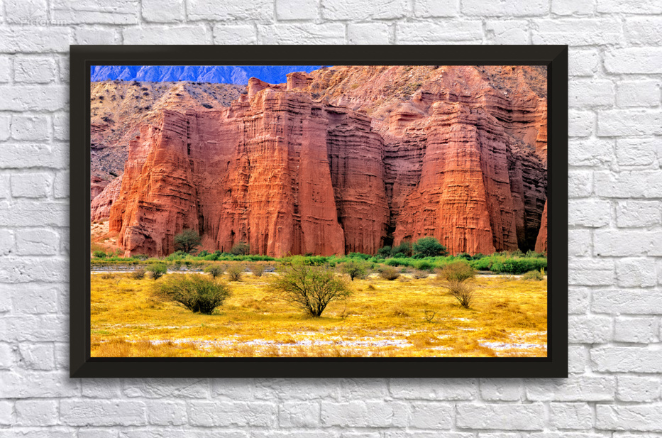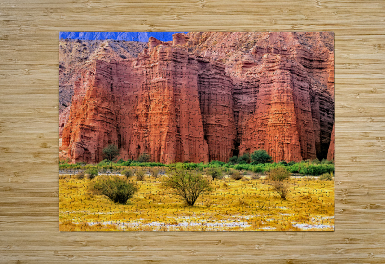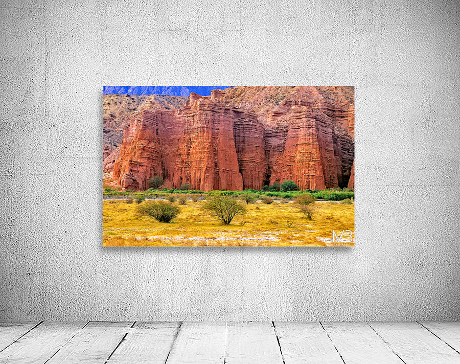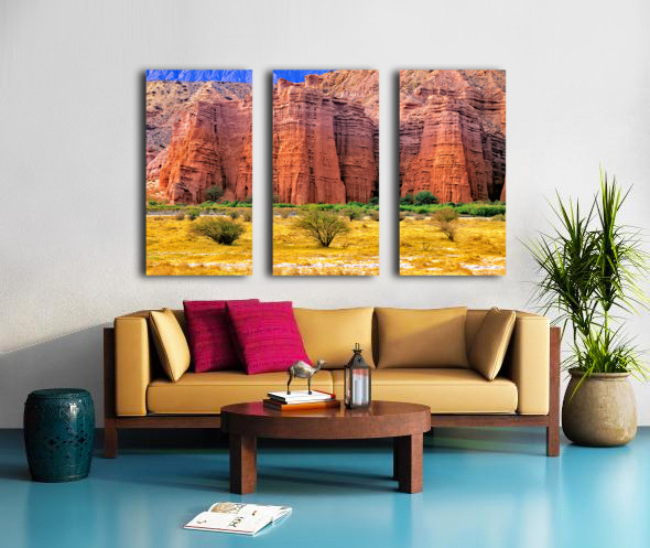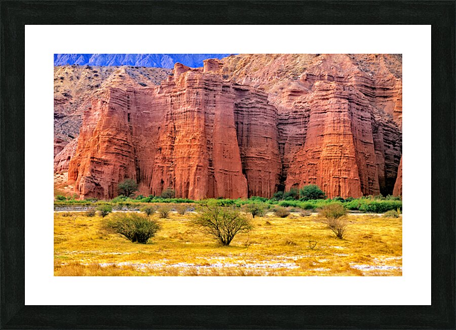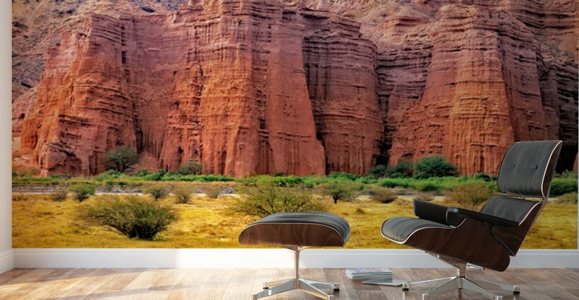 Tall red sandstone formations in a desert landscape in Argentina. The area is dry with some green plants nearby.