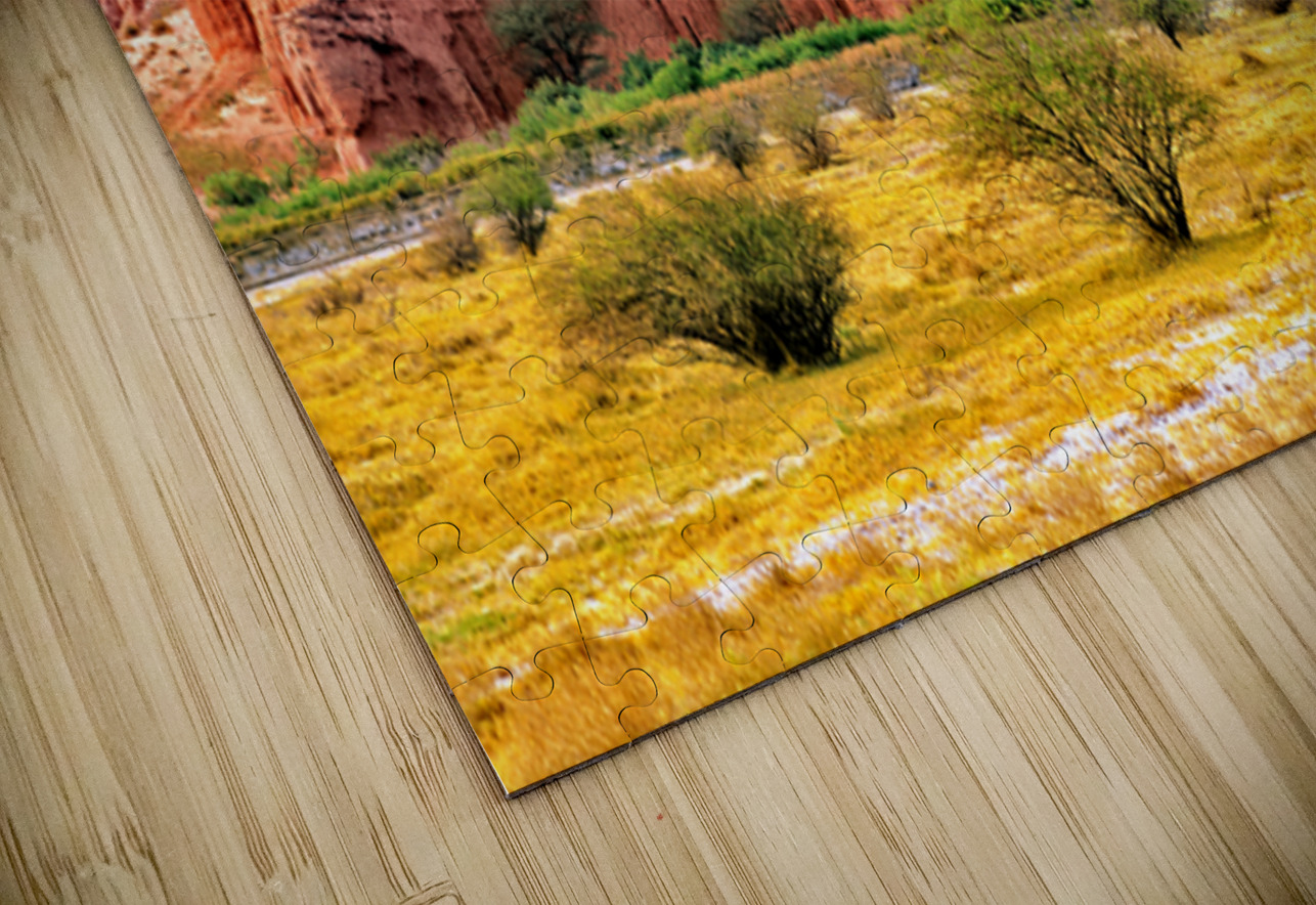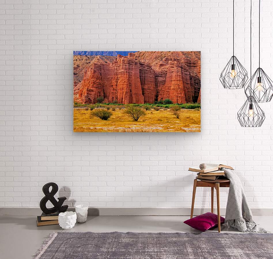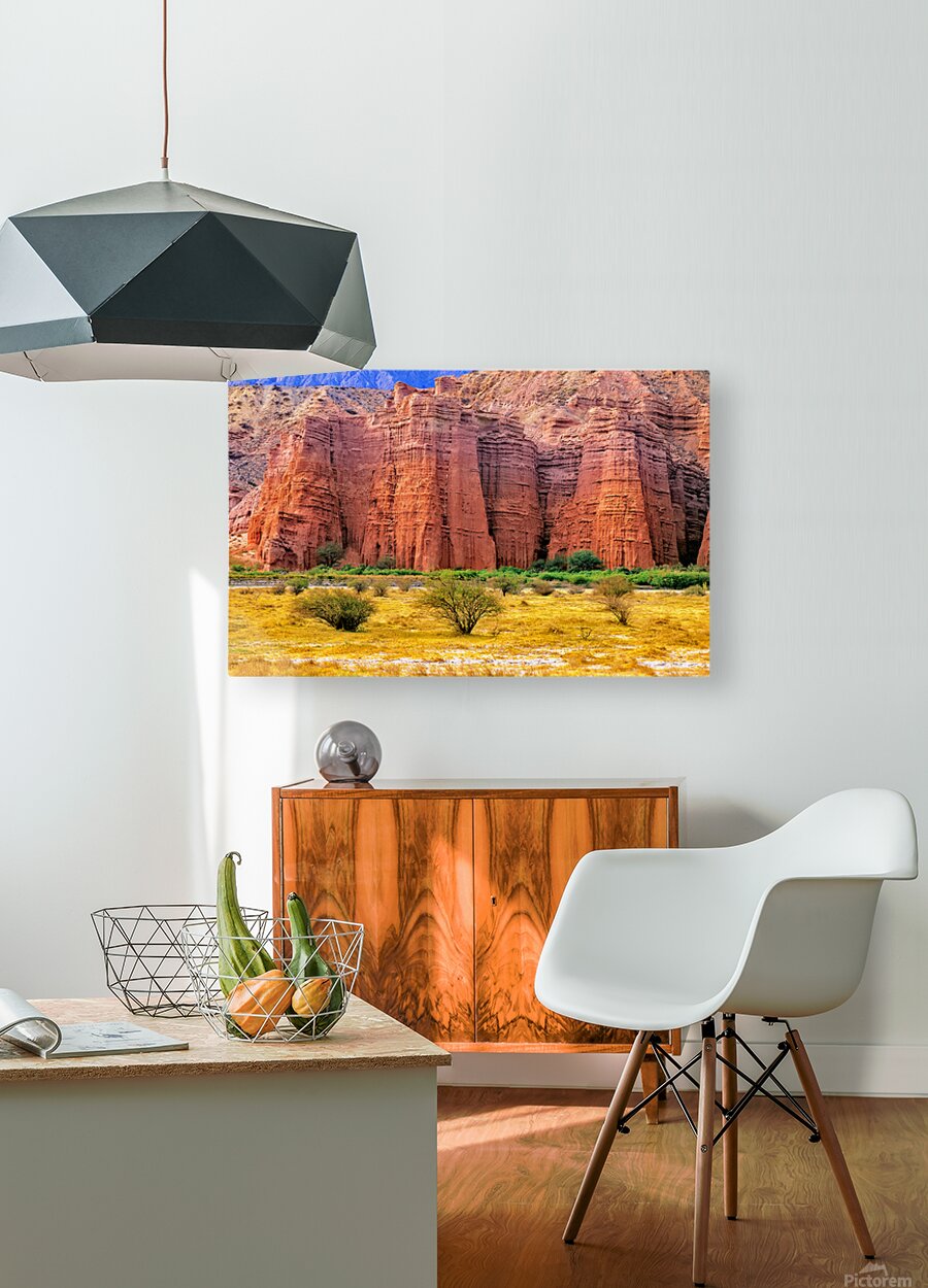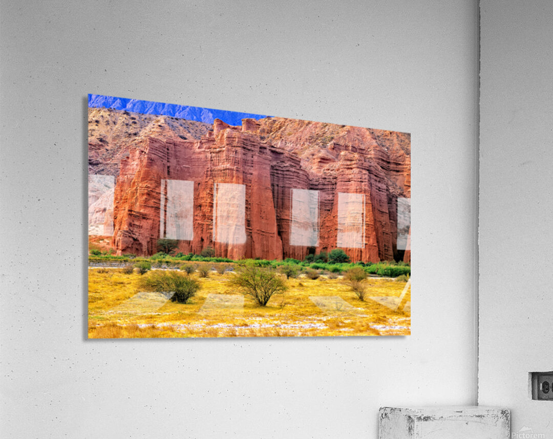 Tall red sandstone formations in a desert landscape in Argentina. The area is dry with some green plants nearby.